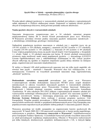 Języki Obce w Szkole – egzamin gimnazjalny z języka obcego (konferencja, 30 marca 2012 r.) Wysoka jakość edukacji językowej w warszawskich szkołach jest jednym z najważniejszych zadań zapisanych w Polityce edukacyjnej miasta. Znajomość co najmniej dwóch języków obcych to kompetencja kluczowa, którą powinni posiadać stołeczni absolwenci. Nauka języków obcych w warszawskich szkołach Nauczanie dwujęzyczne zorganizowane jest w 34 szkołach, natomiast program międzynarodowej matury IB w dwóch liceach prowadzonych przez m.st. Warszawę. W Warszawie powołano również punkty nauczania języków mniejszości narodowych – j. ukraińskiego, ormiańskiego, greckiego i niemieckiego. Najbardziej popularnym językiem nauczanym w szkołach jest j. angielski (uczy się go 154 591 uczniów w 529 szkołach, następnie j. niemiecki (42 847 uczniów w 277 szkołach), j. rosyjski (10 356 uczniów w 143 szkołach) i j. francuski (9 130 uczniów w 89 szkołach) Coraz większą popularnością cieszą się języki innych krajów Unii Europejskiej: j. hiszpański i j. włoski. Nadal, w 18 szkołach nauczana jest łacina. W dwóch szkołach warszawskich uczniowie mają możliwość nauki mniej popularnych języków - j. słowackiego (LXXXVI Liceum Ogólnokształcące) oraz j. niderlandzkiego (Gimnazjum nr 48). Lekcje języków obcych odbywają się zgodnie ze stopniem znajomości języka (klasy dzielone na mniejsze grupy, organizowane jest nauczanie międzyklasowe). W stolicy w klasach I-III szkół podstawowych nauczany jest nie tylko język angielski, ale również inne języki – niemiecki i francuski. Warszawa chce być wielojęzyczna, a nie monojęzyczna. Uczniowie na wszystkich poziomach nauczania mają zagwarantowaną „drożność” językową. Doskonalenie zawodowe nauczycieli prowadzone jest przez m.st. Warszawa w samorządowym ośrodku doskonalenia nauczycieli WCIES przez zespół doradców metodycznych (z zakresu wszystkich nauczanych języków w warszawskich szkołach). Bezpłatna oferta proponowana przez Warszawskie Centrum Innowacji EdukacyjnoSpołecznych i Szkoleń obejmuje warsztaty, seminaria, lekcje pokazowe, konsultacje i konferencje. W roku szkolnym 2011/2012 jednym z najważniejszych tematów szkoleń jest wykorzystanie technologii informacyjnych na lekcjach języków oraz nauczanie języków w szkołach zawodowych. Istotną i interesującą propozycją jest współpraca z Fundacją Rozwoju Systemu Edukacji, która realizuje i promuje programy językowe Unii Europejskiej. Wspólne projekty prowadzone z FRSE skoncentrowane są na przedstawieniu nauczycielom możliwości udziału w projektach dofinansowanych przez Unię Europejską oraz popularyzowaniu najciekawszych przykładów dobrej praktyki w nauczaniu języków obcych. Warszawa pozyskuje też środki europejskie na organizowanie kursów językowych dla nauczycieli. W latach 2009-2011 220 nauczycieli uczestniczyło w kursie języka angielskiego, realizowanym w projekcie „Warszawscy nauczyciele w Warszawie”, współfinansowanym przez Europejski Fundusz Społeczny. Uczestnikami kursu byli przede wszystkim nauczyciele ze szkół prowadzących współpracę międzynarodową. Obecnie w Warszawie realizowanych jest kilka lokalnych, dzielnicowych, projektów dofinansowanych z UE, w których kursy 1 językowe są ważnym elementem doskonalenia kadry oświatowej. Biuro Edukacji będzie aplikowało o dofinansowanie kolejnych kursów (w tym języka obcego zawodowego). Promowanie nauczania języków obcych. Od 2001 roku 26 września to Europejski Dzień Języków (EDJ), wspólna inicjatywa Unii Europejskiej i Rady Europy. Corocznie Biuro Edukacji uczestniczy w organizacji Europejskiego Dnia Języków wspólnie z Fundacją Rozwoju Systemu Edukacji, Ośrodkiem Rozwoju Edukacji, Uniwersytetem Warszawskim, Przedstawicielstwem Komisji Europejskiej w Polsce oraz Europejskim Stowarzyszeniem Narodowych Instytutów Kultury. Nauczyciele, uczniowie i ich rodzice mają możliwość udziału w zajęciach, lekcjach, grach miejskich i piknikach rodzinnych, prowadzonych w wielu językach. Atrakcyjna forma zajęć, prowadzonych m.in. przez warszawskich lingwistów, a także native speakerów oraz wykładowców akademickich, zachęca do podjęcia nauki języka, czy do poznania nowych metod nauczania języków. We wrześniu 2011 roku Biuro Edukacji włączyło się organizację konferencji „Kompetencje językowe podstawą sukcesu zawodowego i społecznego w Europie”, zorganizowanej w oficjalnym porządku prezydencji Polski w Unii Europejskiej. Prowadzenie Centrum Zasobów Dydaktycznych Języka Angielskiego – we współpracy z Ambasadą USA. Centrum, ulokowane w Śródmieściu, w Szkole Podstawowej nr 211, oferuje nauczycielom udział w warsztatach metodycznych. Co roku Centrum organizuje szkolenie prowadzone przez edukatora – specjalistę nauczania języka angielskiego ze Stanów Zjednoczonych. Centrum zgromadziło także nowoczesne materiały dydaktyczne (książki, gry dydaktyczne, poradniki dla nauczycieli). Powołanie Centrum Zasobów Dydaktycznych Języka Angielskiego odpowiada na jedno z najważniejszych wyzwań edukacyjnych współczesnej szkoły – rozpoczęcia nauki języka obcego już od najmłodszych lat. Centrum (dofinansowane przez Miasto Stołeczne oraz Ambasadę USA) adresuje swoją ofertę przede wszystkim do nauczycieli edukacji wczesnoszkolnej. Nauczanie języka polskiego jako obcego. Ponad tysiąc dzieci cudzoziemskich uczy się w stołecznych szkołach. Biuro Edukacji wspomaga nauczycieli w podjęciu nowego zadania – uczenia języka polskiego. W 2008 roku grupa nauczycieli i doradców metodycznych ukończyła studia podyplomowe z zakresu nauczania języka polskiego jako obcego, prowadzone przez Uniwersytet Warszawski. Dzięki temu przygotowaniu merytorycznemu oraz doświadczeniu metodycznemu powstała publikacja „Ku wielokulturowej szkole w Polsce. Pakiet edukacyjny z programem nauczania języka polski