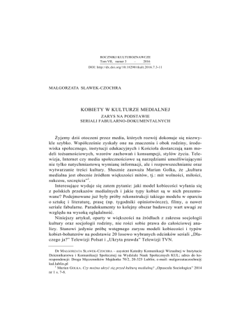 ROCZNIKI KULTUROZNAWCZE Tom VII, numer 3 – 2016 DOI: http://dx.doi.org/10.18290/rkult.2016.7.3-11 MAŁGORZATA SŁAWEK-CZOCHRA * KOBIETY W KULTURZE MEDIALNEJ ZARYS NA PODSTAWIE SERIALI FABULARNO-DOKUMENTALNYCH Żyjemy dziś otoczeni przez media, których rozwój dokonuje się niezwykle szybko. Współcześnie zyskały one na znaczeniu i obok rodziny, środowiska społecznego, instytucji edukacyjnych i Kościoła dostarczają nam modeli tożsamościowych, wzorów zachowań i konsumpcji, stylów życia. Telewizja, Internet czy media społecznościowe są narzędziami umożliwiającymi nie tylko natychmiastową wymianę informacji, ale i rozpowszechnianie oraz wytwarzanie treści kultury. Słusznie zauważa Marian Golka, że „kultura medialna jest obecnie źródłem większości mitów, tj.: mit wolności, miłości, sukcesu, szczęścia” 1. Interesujące wydaje się zatem pytanie: jaki model kobiecości wyłania się z polskich przekazów medialnych i jakie typy kobiet są w nich prezentowane? Podejmowane już były próby rekonstrukcji takiego modelu w oparciu o sztukę i literaturę, prasę (np. tygodniki opiniotwórcze), filmy, a nawet seriale fabularne. Paradokumenty to kolejny obszar badawczy wart uwagi ze względu na wysoką oglądalność. Niniejszy artykuł, oparty w większości na źródłach z zakresu socjologii kultury oraz socjologii rodziny, nie rości sobie prawa do całościowej analizy. Stanowi jedynie próbę wstępnego zarysu modeli kobiecości i typów kobiet-bohaterów na podstawie 20 losowo wybranych odcinków seriali „Dlaczego ja?” Telewizji Polsat i „Ukryta prawda” Telewizji TVN. Dr MAŁGORZATA SŁAWEK-CZOCHRA – asystent Katedry Komunikacji Wizualnej w Instytucie Dziennikarstwa i Komunikacji Społecznej na Wydziale Nauk Społecznych KUL; adres do korespondencji: Droga Męczenników Majdanka 70/2, 20-325 Lublin; e-mail: malgorzataczochra@ kul.lublin.pl 1 Marian GOLKA. Czy można ukryć się przed kulturą medialną? „Opuscula Sociologica” 2014 nr 1 s. 7-8. 196 MAŁGORZATA SŁAWEK-CZOCHRA KOBIETA I KOBIECOŚĆ – RYS HISTORYCZNY Sposób określenia „kobiecych” i „męskich” cech, postaw, ról społecznych i zachowań może się różnić w poszczególnych społeczeństwach i ulega pewnym modyfikacjom na przestrzeni czasu w obrębie kultury każdego z nich. Warto zatem zakreślić charakterystykę ról kobiecych w społeczeństwie polskim. Na ziemiach polskich istniał niezaprzeczalny kult kobiety w roli żony i matki, od najdawniejszych zatem czasów jej domeną był dom i sprawy prywatne, podczas gdy jej mąż pełnił istotne funkcje w życiu publicznym. Poza domowym zaciszem „pojawiała się ona nie jako samodzielna jednostka, lecz u boku swojego męża, jako element ich wspólnego życia”2. Od czasów chrztu Polski pozycję kobiety-żony wzmacniała i nadal wzmacnia religia chrześcijańska. Kościół katolicki ustanowił związek małżeński kobiety i mężczyzny sakramentem i apelował o jego dobrowolność, nierozerwalność i trwałość 3. Stanowczo sprzeciwiał się też karaniu kobiet za nieposłuszeństwo. Najważniejszą kobiecą rolą była więc rola dobrej i wiernej żony, towarzyszki życia. W okresie preindustrialnym kobieta towarzyszyła mężowi nie tylko w domu, ale i w pracy. Pomagała w uprawianiu roślin i zbóż na polu i w hodowli zwierząt. Wytwarzała też różnego rodzaju przetwory, biorąc w ten sposób czynny udział w żywieniu rodziny. Kobieta tkała i szyła, zapewniając domownikom ubiory i elementy domowego wystroju. Występując w powiązanej z rolą żony roli gospodyni, musiała być zaradna, pracowita i mieć rozliczne umiejętności, które przekazywane były w rodzinie z matki na córkę4. W wyborze kandydatki na żonę mężczyzna zwracał uwagę nie tylko na urodę, ale i warunki fizyczne. Jego wybranka musiała dać mu liczne potomstwo i podołać ciężkiej pracy w gospodarstwie domowym. W okresie oświecenia w kręgach magnaterii małżeństwo było układem polityczno-gospodarczym, a nie związkiem bliskich sobie i oddanych osób. Cechowały je ceremonialna grzeczność, tolerancja i wzajemna swoboda. 2 Anna KWAK. Kobieta w domu i na rynku pracy. Czy równość praw i obowiązków? „Roczniki Socjologii Rodziny” 2007 nr 18 s. 73-75. 3 Dorota PALUK. Modele ról kobiety w podręcznikach do wychowania seksualnego. Kraków: Wydawnictwo Uniwersytetu Jagiellońskiego 2005 s. 14; Justyna SZULICH-KAŁUŻA. Role rodzinne kobiet wizualizowane na fotografiach „Przekroju” i „Polityki”. W: Naprawdę jaka jesteś nie wie nikt – obraz kobiety w języku i literaturze. Red. Joanna Smól. Poznań: Maiuscula 2011 s. 409. 4 Leon DYCZEWSKI. Rodzina polska i kierunki jej przemian. Warszawa: Ośrodek Dokumentacji i Studiów Społecznych 1981 s. 149. KOBIETY W KULTURZE MEDIALNEJ 197 Elity dbały też o staranne wykształcenie swoich żeńskich potomkiń, w tych więc kręgach wcześnie nastąpiło pewne wyemancypowanie kobiet. W zamożnych rodzinach ziemiańskich podstawowym zajęciem kobiety, mającej do dyspozycji służbę, niańki oraz guwernantki, było utrzymywanie kontaktów towarzyskich5. Do jej zadań należało ponadto zapewnienie ciepłej atmosfery, poczucia bezpieczeństwa, utrzymanie w domu porządku i należnej każdemu z domowników pozycji w cechującej się dużym dystansem społecznym domowej hierarchii6. W tym samym czasie porządne mieszczanki, drobnomieszczanki i chłopki charakteryzowały się przede wszystkim skromnością, bogobojnością i pracowitością. Pomimo odmiennych pozycji społecznych i znacznych różnic w sprawowaniu roli kobiety „jedno było wspólne dla wszystkich kobiet: całkowite podporządkowanie się woli mężczyzny, najpierw ojca, potem męża”7. Podporządkowanie kobiety sankcjonowały normy religijne, prawne i wspólnotowe. Bez opieki ze strony mężczyzny (najczęściej ojca lub męża) kobieta narażona była na różne przejawy dyskryminacji. T