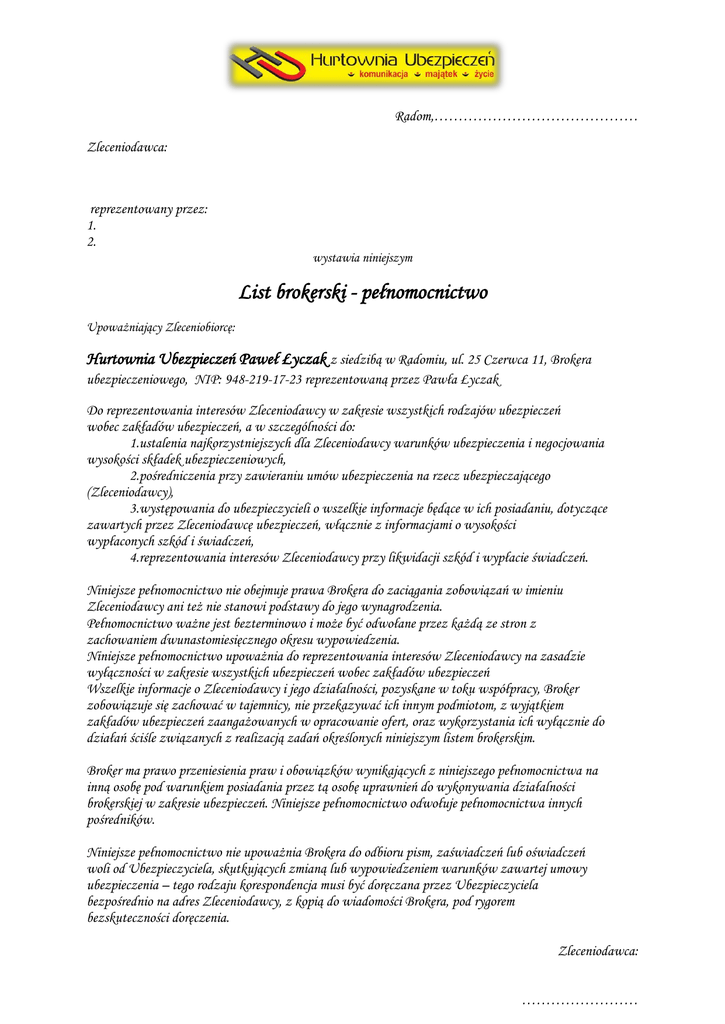 Radom,…………………………………… Zleceniodawca: reprezentowany przez: 1. 2. wystawia niniejszym List brokerski - pełnomocnictwo Upoważniający Zleceniobiorcę: Hurtownia Ubezpieczeń Paweł Łyczak z siedzibą w Radomiu, ul. 25 Czerwca 11, Brokera ubezpieczeniowego, NIP: 948-219-17-23 reprezentowaną przez Pawła Łyczak Do reprezentowania interesów Zleceniodawcy w zakresie wszystkich rodzajów ubezpieczeń wobec zakładów ubezpieczeń, a w szczególności do: 1.ustalenia najkorzystniejszych dla Zleceniodawcy warunków ubezpieczenia i negocjowania wysokości składek ubezpieczeniowych, 2.pośredniczenia przy zawieraniu umów ubezpieczenia na rzecz ubezpieczającego (Zleceniodawcy), 3.występowania do ubezpieczycieli o wszelkie informacje będące w ich posiadaniu, dotyczące zawartych przez Zleceniodawcę ubezpieczeń, włącznie z informacjami o wysokości wypłaconych szkód i świadczeń, 4.reprezentowania interesów Zleceniodawcy przy likwidacji szkód i wypłacie świadczeń. Niniejsze pełnomocnictwo nie obejmuje prawa Brokera do zaciągania zobowiązań w imieniu Zleceniodawcy ani też nie stanowi podstawy do jego wynagrodzenia. Pełnomocnictwo ważne jest bezterminowo i może być odwołane przez każdą ze stron z zachowaniem dwunastomiesięcznego okresu wypowiedzenia. Niniejsze pełnomocnictwo upoważnia do reprezentowania interesów Zleceniodawcy na zasadzie wyłączności w zakresie wszystkich ubezpieczeń wobec zakładów ubezpieczeń Wszelkie informacje o Zleceniodawcy i jego działalności, pozyskane w toku współpracy, Broker zobowiązuje się zachować w tajemnicy, nie przekazywać ich innym podmiotom, z wyjątkiem zakładów ubezpieczeń zaangażowanych w opracowanie ofert, oraz wykorzystania ich wyłącznie do działań ściśle związanych z realizacją zadań określonych niniejszym listem brokerskim. Broker ma prawo przeniesienia praw i obowiązków wynikających z niniejszego pełnomocnictwa na inną osobę pod warunkiem posiadania przez tą osobę uprawnień do wykonywania działalności brokerskiej w zakresie ubezpieczeń. Niniejsze pełnomocnictwo odwołuje pełnomocnictwa innych pośredników. Niniejsze pełnomocnictwo nie upoważnia Brokera do odbioru pism, zaświadczeń lub oświadczeń woli od Ubezpieczyciela, skutkujących zmianą lub wypowiedzeniem warunków zawartej umowy ubezpieczenia – tego rodzaju korespondencja musi być doręczana przez Ubezpieczyciela bezpośrednio na adres Zleceniodawcy, z kopią do wiadomości Brokera, pod rygorem bezskuteczności doręczenia. Zleceniodawca: ……………………