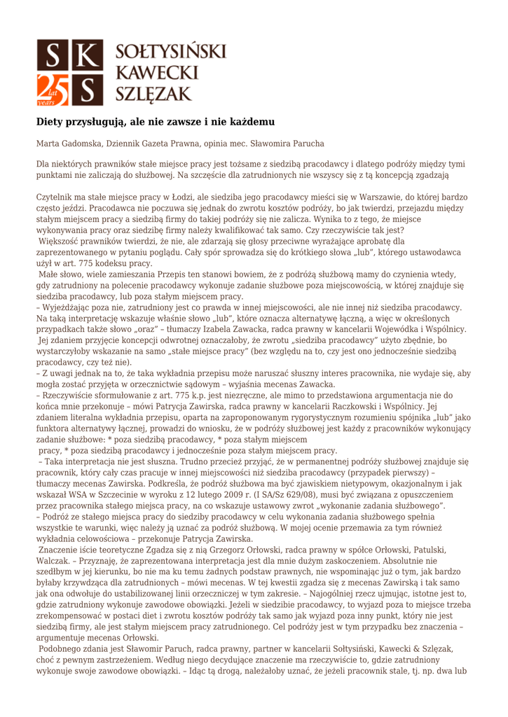 Diety przysługują, ale nie zawsze i nie każdemu Marta Gadomska, Dziennik Gazeta Prawna, opinia mec. Sławomira Parucha Dla niektórych prawników stałe miejsce pracy jest tożsame z siedzibą pracodawcy i dlatego podróży między tymi punktami nie zaliczają do służbowej. Na szczęście dla zatrudnionych nie wszyscy się z tą koncepcją zgadzają Czytelnik ma stałe miejsce pracy w Łodzi, ale siedziba jego pracodawcy mieści się w Warszawie, do której bardzo często jeździ. Pracodawca nie poczuwa się jednak do zwrotu kosztów podróży, bo jak twierdzi, przejazdu między stałym miejscem pracy a siedzibą firmy do takiej podróży się nie zalicza. Wynika to z tego, że miejsce wykonywania pracy oraz siedzibę firmy należy kwalifikować tak samo. Czy rzeczywiście tak jest? Większość prawników twierdzi, że nie, ale zdarzają się głosy przeciwne wyrażające aprobatę dla zaprezentowanego w pytaniu poglądu. Cały spór sprowadza się do krótkiego słowa „lub”, którego ustawodawca użył w art. 775 kodeksu pracy. Małe słowo, wiele zamieszania Przepis ten stanowi bowiem, że z podróżą służbową mamy do czynienia wtedy, gdy zatrudniony na polecenie pracodawcy wykonuje zadanie służbowe poza miejscowością, w której znajduje się siedziba pracodawcy, lub poza stałym miejscem pracy. – Wyjeżdżając poza nie, zatrudniony jest co prawda w innej miejscowości, ale nie innej niż siedziba pracodawcy. Na taką interpretację wskazuje właśnie słowo „lub”, które oznacza alternatywę łączną, a więc w określonych przypadkach także słowo „oraz” – tłumaczy Izabela Zawacka, radca prawny w kancelarii Wojewódka i Wspólnicy. Jej zdaniem przyjęcie koncepcji odwrotnej oznaczałoby, że zwrotu „siedziba pracodawcy” użyto zbędnie, bo wystarczyłoby wskazanie na samo „stałe miejsce pracy” (bez względu na to, czy jest ono jednocześnie siedzibą pracodawcy, czy też nie). – Z uwagi jednak na to, że taka wykładnia przepisu może naruszać słuszny interes pracownika, nie wydaje się, aby mogła zostać przyjęta w orzecznictwie sądowym – wyjaśnia mecenas Zawacka. – Rzeczywiście sformułowanie z art. 775 k.p. jest niezręczne, ale mimo to przedstawiona argumentacja nie do końca mnie przekonuje – mówi Patrycja Zawirska, radca prawny w kancelarii Raczkowski i Wspólnicy. Jej zdaniem literalna wykładnia przepisu, oparta na zaproponowanym rygorystycznym rozumieniu spójnika „lub” jako funktora alternatywy łącznej, prowadzi do wniosku, że w podróży służbowej jest każdy z pracowników wykonujący zadanie służbowe: * poza siedzibą pracodawcy, * poza stałym miejscem pracy, * poza siedzibą pracodawcy i jednocześnie poza stałym miejscem pracy. – Taka interpretacja nie jest słuszna. Trudno przecież przyjąć, że w permanentnej podróży służbowej znajduje się pracownik, który cały czas pracuje w innej miejscowości niż siedziba pracodawcy (przypadek pierwszy) – tłumaczy mecenas Zawirska. Podkreśla, że podróż służbowa ma być zjawiskiem nietypowym, okazjonalnym i jak wskazał WSA w Szczecinie w wyroku z 12 lutego 2009 r. (I SA/Sz 629/08), musi być związana z opuszczeniem przez pracownika stałego miejsca pracy, na co wskazuje ustawowy zwrot „wykonanie zadania służbowego”. – Podróż ze stałego miejsca pracy do siedziby pracodawcy w celu wykonania zadania służbowego spełnia wszystkie te warunki, więc należy ją uznać za podróż służbową. W mojej ocenie przemawia za tym również wykładnia celowościowa – przekonuje Patrycja Zawirska. Znaczenie iście teoretyczne Zgadza się z nią Grzegorz Orłowski, radca prawny w spółce Orłowski, Patulski, Walczak. – Przyznaję, że zaprezentowana interpretacja jest dla mnie dużym zaskoczeniem. Absolutnie nie szedłbym w jej kierunku, bo nie ma ku temu żadnych podstaw prawnych, nie wspominając już o tym, jak bardzo byłaby krzywdząca dla zatrudnionych – mówi mecenas. W tej kwestii zgadza się z mecenas Zawirską i tak samo jak ona odwołuje do ustabilizowanej linii orzeczniczej w tym zakresie. – Najogólniej rzecz ujmując, istotne jest to, gdzie zatrudniony wykonuje zawodowe obowiązki. Jeżeli w siedzibie pracodawcy, to wyjazd poza to miejsce trzeba zrekompensować w postaci diet i zwrotu kosztów podróży tak samo jak wyjazd poza inny punkt, który nie jest siedzibą firmy, ale jest stałym miejscem pracy zatrudnionego. Cel podróży jest w tym przypadku bez znaczenia – argumentuje mecenas Orłowski. Podobnego zdania jest Sławomir Paruch, radca prawny, partner w kancelarii Sołtysiński, Kawecki & Szlęzak, choć z pewnym zastrzeżeniem. Według niego decydujące znaczenie ma rzeczywiście to, gdzie zatrudniony wykonuje swoje zawodowe obowiązki. – Idąc tą drogą, należałoby uznać, że jeżeli pracownik stale, tj. np. dwa lub trzy razy w tygodniu, jeździ z Łodzi do centrali w Warszawie, to przejazd do Warszawy nie jest w istocie podróżą służbową, lecz częścią rutynowych obowiązków. Pracownik nie dostanie za niego diety, choć oczywiście koszty przejazdu pracodawca będzie musiał opłacić. Co więcej, czas przejazdu do Warszawy będzie czasem pracy. Nie przykładałbym rozstrzygającej wagi do użytego spójnika „lub” – mówi mecenas Paruch. Izabela Zawacka broni swojego poglądu, ale jednocześnie przyznaje, że może mieć on czysto teoretyczny charakter, bo wypłaty diet i zwrotu kosztów podróży nie wyklucza. – Wynika to z tego, że pracownik nie może ponosić ryzyka ekonomicznego związanego z działalnością pracodawcy. W końcu to na jego polecenie podróżuje między stałym miejscem pracy a siedzibą firmy. Niemniej z przepisów nie wynika wprost, że w takim przypadku mamy do czynienia z ustawową podróżą służbową – dodaje mecenas Zawacka. Alternatywą dodatki za nadgodziny Wielu pracodawców, chcąc całkowicie uniknąć zapłaty z tytułu podróży służbowej, wo