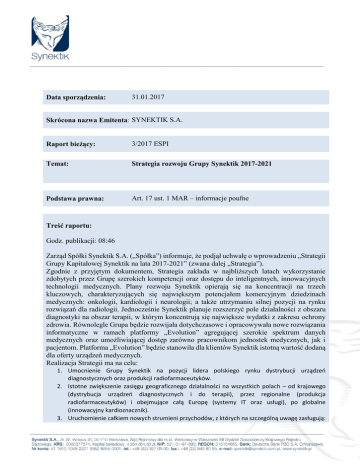 _________________________________________________________________________________ Data sporządzenia: 31.01.2017 Skrócona nazwa Emitenta: SYNEKTIK S.A. Raport bieżący: 3/2017 ESPI Temat: Strategia rozwoju Grupy Synektik 2017-2021 Podstawa prawna: Art. 17 ust. 1 MAR – informacje poufne Treść raportu: Godz. publikacji: 08:46 Zarząd Spółki Synektik S.A. („Spółka”) informuje, że podjął uchwałę o wprowadzeniu „Strategii Grupy Kapitałowej Synektik na lata 2017-2021” (zwana dalej „Strategia”). Zgodnie z przyjętym dokumentem, Strategia zakłada w najbliższych latach wykorzystanie zdobytych przez Grupę szerokich kompetencji oraz dostępu do inteligentnych, innowacyjnych technologii medycznych. Plany rozwoju Synektik opierają się na koncentracji na trzech kluczowych, charakteryzujących się największym potencjałem komercyjnym dziedzinach medycznych: onkologii, kardiologii i neurologii; a także utrzymaniu silnej pozycji na rynku rozwiązań dla radiologii. Jednocześnie Synektik planuje rozszerzyć pole działalności z obszaru diagnostyki na obszar terapii, w którym koncentrują się największe wydatki z zakresu ochrony zdrowia. Równolegle Grupa będzie rozwijała dotychczasowe i opracowywała nowe rozwiązania informatyczne w ramach platformy „Evolution” agregującej szerokie spektrum danych medycznych oraz umożliwiającej dostęp zarówno pracownikom jednostek medycznych, jak i pacjentom. Platforma „Evolution” będzie stanowiła dla klientów Synektik istotną wartość dodaną dla oferty urządzeń medycznych. Realizacja Strategii ma na celu: 1. Umocnienie Grupy Synektik na pozycji lidera polskiego rynku dystrybucji urządzeń diagnostycznych oraz produkcji radiofarmaceutyków. 2. Istotne zwiększenie zasięgu geograficznego działalności na wszystkich polach – od krajowego (dystrybucja urządzeń diagnostycznych i do terapii), przez regionalne (produkcja radiofarmaceutyków) i obejmujące całą Europę (systemy IT oraz usługi), po globalne (innowacyjny kardioznacznik). 3. Uruchomienie całkiem nowych strumieni przychodów, z których na szczególną uwagę zasługują: _________________________________________________________________________________ _________________________________________________________________________________ 3.1. Współpraca z nowymi grupami odbiorców, jakimi są oddziały onkologiczne, kardiologiczne i neurologiczne w krajowych jednostkach medycznych. 3.2. Komercjalizacja innowacyjnego kardioznacznika. Wdrożenie założeń ma doprowadzić do zwiększenia efektywności zaangażowanego kapitału oraz istotnego wzrostu wartości Spółki (szczegóły w dalszej części dokumentu). Podstawą do stworzenia Strategii była analiza globalnych, regionalnych oraz krajowych trendów na rynku ochrony zdrowia, a także globalnych prognoz dla poszczególnych dziedzin medycyny i obszarów biznesowych. Najważniejsze zewnętrzne (rynkowe) uwarunkowania determinujące przyjętą Strategię to: 1. Oczekiwana kontynuacja trendu wzrostu wydatków na ochronę zdrowia, zarówno na świecie, jak i – w szczególności – w Europie Środkowo-Wschodniej oraz bezpośrednio w Polsce. Kraje Europy Środkowo-Wschodniej – w tym Polska – nadal przeznaczają istotnie mniej środków na ochronę zdrowia niż stare kraje Unii Europejskiej, czy tym bardziej Stany Zjednoczone. Trendy wskazują, że dynamika wydatków w regionie będzie wyższa niż w państwach bardziej rozwiniętych. Wzrost wydatków będzie napędzany przede wszystkim przez zjawiska demograficzne (starzejące się społeczeństwo), rynkowe (wzrost kosztów procedur medycznych) oraz społeczne („prozdrowotny” tryb życia). 2. Największe wydatki na ochronę zdrowia dotyczą obszaru szeroko pojętej terapii. 3. Choroby serca i układu krążenia, nowotwory oraz choroby układu nerwowego pozostają głównymi przyczynami zgonów w rozwiniętych gospodarkach na całym świecie, w tym w państwach Unii Europejskiej oraz Stanach Zjednoczonych. 4. Wg niezależnych analiz dynamika wzrostu wydatków na radiofarmaceutyki będzie się utrzymywała na dwucyfrowym poziomie co najmniej do 2030 r. Wśród głównych czynników wzrostu rynku produktów radiofarmaceutycznych należy wymienić przede wszystkim skuteczność ich wykorzystania do wczesnego diagnozowania pozostających jedną z głównych przyczyn zgonów na świecie chorób nowotworowych oraz oczekiwane opracowanie nowych produktów znajdujących zastosowanie w obszarze terapii. 5. Na całym świecie istnieje duże zapotrzebowanie na nowe radiofarmaceutyki do diagnozowania chorób układu sercowo-naczyniowego, pozostających główną przyczyną zgonów na świecie. Największym rynkiem badań izotopowych w zakresie chorób serca są Stany Zjednoczone 6. Dostęp do nowoczesnych świadczeń medycznych w państwach Europy Środkowo-Wschodniej jest na istotnie niższym poziomie niż w przypadku państw starej Unii. 7. Finansowanie dla obszaru ochrony zdrowia w Polsce w ramach perspektywy unijnej na lata 20142020 wynieść ma 12 mld zł w porównaniu do 4,5 mld zł w perspektywie 2007-2013. 8. Wprowadzenie od 1 stycznia 2017 r. zróżnicowanych wycen procedur medycznych z wykorzystaniem radiofarmaceutyków dla produktów standardowych oraz specjalnych. Zróżnicowanie wycen zwiększy w ocenie Zarządu Synektik liczbę wykonywanych badań, szczególnie z wykorzystaniem radiofarmaceutyków specjalnych, w przypadku których Spółka jest jedynym w Polsce producentem z dostępem do otwartego rynku. 9. Jednym z najszybciej rosnących obszarów w medycynie są i będą w najbliższych latach zaawansowane systemy informatyczne zapewniające dostęp do zintegrowanych danych medycznych w ramach komunikacji mobilnych. Najważniejsze wewnętrzne czynniki wzrostu opisane w Strategii: _________________________________________________________________________________ __________________________________________________________________________
