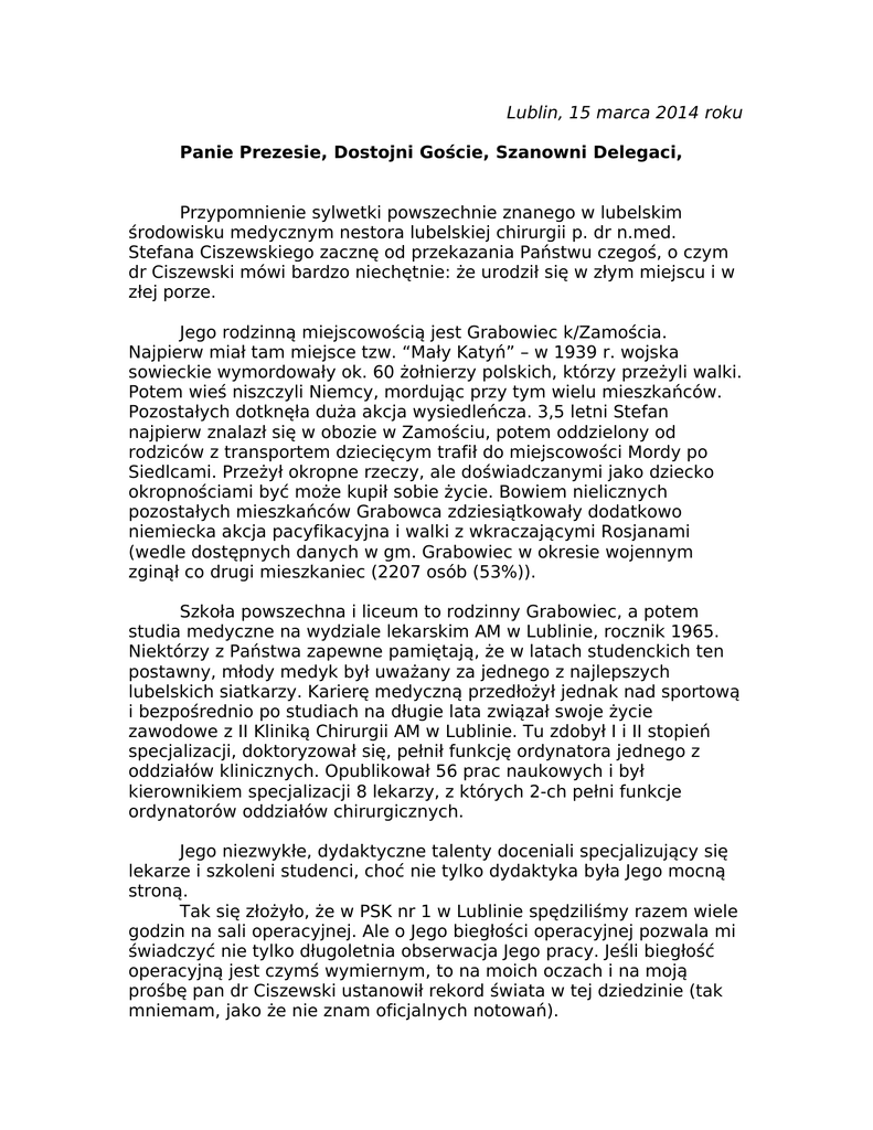 Lublin, 15 marca 2014 roku Panie Prezesie, Dostojni Goście, Szanowni Delegaci, Przypomnienie sylwetki powszechnie znanego w lubelskim środowisku medycznym nestora lubelskiej chirurgii p. dr n.med. Stefana Ciszewskiego zacznę od przekazania Państwu czegoś, o czym dr Ciszewski mówi bardzo niechętnie: że urodził się w złym miejscu i w złej porze. Jego rodzinną miejscowością jest Grabowiec k/Zamościa. Najpierw miał tam miejsce tzw. “Mały Katyń” – w 1939 r. wojska sowieckie wymordowały ok. 60 żołnierzy polskich, którzy przeżyli walki. Potem wieś niszczyli Niemcy, mordując przy tym wielu mieszkańców. Pozostałych dotknęła duża akcja wysiedleńcza. 3,5 letni Stefan najpierw znalazł się w obozie w Zamościu, potem oddzielony od rodziców z transportem dziecięcym trafił do miejscowości Mordy po Siedlcami. Przeżył okropne rzeczy, ale doświadczanymi jako dziecko okropnościami być może kupił sobie życie. Bowiem nielicznych pozostałych mieszkańców Grabowca zdziesiątkowały dodatkowo niemiecka akcja pacyfikacyjna i walki z wkraczającymi Rosjanami (wedle dostępnych danych w gm. Grabowiec w okresie wojennym zginął co drugi mieszkaniec (2207 osób (53%)). Szkoła powszechna i liceum to rodzinny Grabowiec, a potem studia medyczne na wydziale lekarskim AM w Lublinie, rocznik 1965. Niektórzy z Państwa zapewne pamiętają, że w latach studenckich ten postawny, młody medyk był uważany za jednego z najlepszych lubelskich siatkarzy. Karierę medyczną przedłożył jednak nad sportową i bezpośrednio po studiach na długie lata związał swoje życie zawodowe z II Kliniką Chirurgii AM w Lublinie. Tu zdobył I i II stopień specjalizacji, doktoryzował się, pełnił funkcję ordynatora jednego z oddziałów klinicznych. Opublikował 56 prac naukowych i był kierownikiem specjalizacji 8 lekarzy, z których 2-ch pełni funkcje ordynatorów oddziałów chirurgicznych. Jego niezwykłe, dydaktyczne talenty doceniali specjalizujący się lekarze i szkoleni studenci, choć nie tylko dydaktyka była Jego mocną stroną. Tak się złożyło, że w PSK nr 1 w Lublinie spędziliśmy razem wiele godzin na sali operacyjnej. Ale o Jego biegłości operacyjnej pozwala mi świadczyć nie tylko długoletnia obserwacja Jego pracy. Jeśli biegłość operacyjną jest czymś wymiernym, to na moich oczach i na moją prośbę pan dr Ciszewski ustanowił rekord świata w tej dziedzinie (tak mniemam, jako że nie znam oficjalnych notowań). W godzinach nocnych w trakcie dyżuru na neurochirurgii operowaliśmy pacjenta z zagrażającym pęknięciem tętniakiem. Znieczulenie prowadziłem z zastosowaniem kontrolowanej hypotensji, a jak wiadomo, jest to technika, która nie pozwala rozwiązywać krzyżówek anestezjologowi i wymaga jego stałej obecności. Na chirurgicznej sali operacyjnej drugi i zarazem ostatni dyżurny anestezjolog właśnie zdążył uśpić pacjentkę z ostrym wyrostkiem, kiedy zadzwonili do mnie ginekolodzy, że na salę operacyjną wiozą pacjentkę z odklejającym się łożyskiem. Odklejające się łożysko zawsze jest sytuacją dramatyczną. To jedno z niewielu naprawdę pilnych wskazań do zabiegu operacyjnego. Ponieważ na chirurgii do operacji szykował się młodszy z dyżurnych, poprosiłem doktora Ciszewskiego, żeby zastąpił go ze względu na okoliczności I postarał się jak najszybciej przeprowadzić zabieg. Równocześnie wysłałem współpracującą ze mną pielęgniarkę anestezjologiczną na salę operacyjną ginekologii, aby pilnie szykowała znieczulenie ogólne do cięcia cesarskiego. Po niecałych 6 minutach z chirurgii zadzwonił do mnie kolega anestezjolog, że przekazuje pielęgniarce anestezjologicznej dalsze wybudzanie pacjentki, a sam pędzi na ginekologię, ponieważ dr Ciszewski już zamknął brzuch. Pielęgniarka dokończyła wybudzać pacjentkę, przekazała ją na oddział i dołączyła do mnie. Dalej dyżur toczył się już spokojnie, wszystkie trzy operowane osoby opuściły szpital w dobrym stanie, a rozwiązana cięciem cesarskim pacjentka do dziś nie wie, że swoje i dziecka życie zawdzięcza chirurgowi, którego nie widziała na oczy. II Klinika Chirurgii była przez 35 lat miejscem pracy dr Ciszewskiego, zamienionym w 1990 roku na ordynaturę Chirurgii w szpitalu MSWiA. Końcowym etapem Jego zawodowej aktywności była działalność administracyjna. Został najpierw dyrektorem Szpitala MSWiA, później przez kilka miesięcy pełnił funkcję dyrektora Szpitala przy ul. Kraśnickiej skąd, jak mówi, ze względów rodzinnych, zdrowotnych i…politycznych odszedł na emeryturę. Działalność administracyjna nie przysporzyła Mu satysfakcji, ale w miarę upływu czasu, wbrew publikowanym, kontrowersyjnym opiniom okazało się, że wielu Jego koncepcji nie doceniono, część choć z opóźnieniem realizowano, a niezrealizowane do dziś projekty Ci, którzy je znają, uważają za zaniechania. Szanowni Państwo, Przeżyty w dzieciństwie traumatyczny epizod, wbrew uznawanym poglądom nie zaszkodził silnej osobowości Pana dr Ciszewskiego. Ma uporządkowaną hierarchię wartości (dobro i zło) i niezależne poglądy. Wobec ludzi był zawsze życzliwy, opiekuńczy i współczujący. Bez wahania angażował się w często niebezpieczne akcje pomocy ludziom w stanie wojennym. Wielu ludzi wiele mu z tamtych czasów zawdzięcza. Po przejściu na emeryturę swoje cechy charakteru ujawnił w nowej, nietypowej formie, łączącej pasje zawodowe ze społecznikowskimi. Towarzysząc wyprawom misyjnym oferował mieszkańcom trzeciego świata swoją wiedzę i umiejętności medyczne. Zaczęło się od wyjazdu na Madagaskar. Na tej wyspie na Oceanie Indyjskim przy południowo-wschodnim wybrzeżu Afryki dr Ciszewski spędził trzy pracowite miesiące w Maranie, wiosce dla trędowatych. Zapotrzebowanie na lekarza było ogromne. Oprócz małych, z powodu niedostatecznego zaplecza, zabiegów chirurgicznych robił wszystk