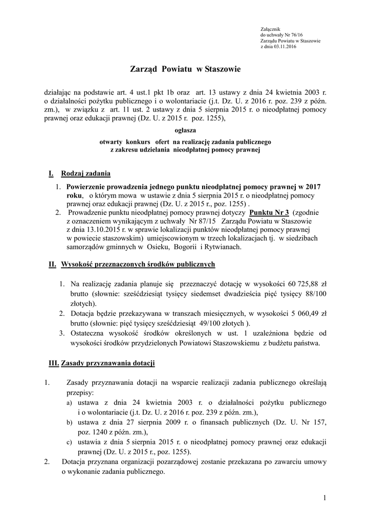 Załącznik do uchwały Nr 76/16 Zarządu Powiatu w Staszowie z dnia 03.11.2016 Zarząd Powiatu w Staszowie działając na podstawie art. 4 ust.1 pkt 1b oraz art. 13 ustawy z dnia 24 kwietnia 2003 r. o działalności pożytku publicznego i o wolontariacie (j.t. Dz. U. z 2016 r. poz. 239 z późn. zm.), w związku z art. 11 ust. 2 ustawy z dnia 5 sierpnia 2015 r. o nieodpłatnej pomocy prawnej oraz edukacji prawnej (Dz. U. z 2015 r. poz. 1255), ogłasza otwarty konkurs ofert na realizację zadania publicznego z zakresu udzielania nieodpłatnej pomocy prawnej I. Rodzaj zadania 1. Powierzenie prowadzenia jednego punktu nieodpłatnej pomocy prawnej w 2017 roku, o którym mowa w ustawie z dnia 5 sierpnia 2015 r. o nieodpłatnej pomocy prawnej oraz edukacji prawnej (Dz. U. z 2015 r., poz. 1255) . 2. Prowadzenie punktu nieodpłatnej pomocy prawnej dotyczy Punktu Nr 3 (zgodnie z oznaczeniem wynikającym z uchwały Nr 87/15 Zarządu Powiatu w Staszowie z dnia 13.10.2015 r. w sprawie lokalizacji punktów nieodpłatnej pomocy prawnej w powiecie staszowskim) umiejscowionym w trzech lokalizacjach tj. w siedzibach samorządów gminnych w Osieku, Bogorii i Rytwianach. II. Wysokość przeznaczonych środków publicznych 1. Na realizację zadania planuje się przeznaczyć dotację w wysokości 60 725,88 zł brutto (słownie: sześćdziesiąt tysięcy siedemset dwadzieścia pięć tysięcy 88/100 złotych). 2. Dotacja będzie przekazywana w transzach miesięcznych, w wysokości 5 060,49 zł brutto (słownie: pięć tysięcy sześćdziesiąt 49/100 złotych ). 3. Ostateczna wysokość środków określonych w ust. 1 uzależniona będzie od wysokości środków przydzielonych Powiatowi Staszowskiemu z budżetu państwa. III. Zasady przyznawania dotacji 1. 2. Zasady przyznawania dotacji na wsparcie realizacji zadania publicznego określają przepisy: a) ustawa z dnia 24 kwietnia 2003 r. o działalności pożytku publicznego i o wolontariacie (j.t. Dz. U. z 2016 r. poz. 239 z późn. zm.), b) ustawa z dnia 27 sierpnia 2009 r. o finansach publicznych (Dz. U. Nr 157, poz. 1240 z późn. zm.), c) ustawia z dnia 5 sierpnia 2015 r. o nieodpłatnej pomocy prawnej oraz edukacji prawnej (Dz. U. z 2015 r., poz. 1255). Dotacja przyznana organizacji pozarządowej zostanie przekazana po zawarciu umowy o wykonanie zadania publicznego. 1 IV. Termin i warunki realizacji zadania 1. Zadanie ma być realizowane w terminie od 1 stycznia do 31 grudnia w 2017 roku w przeciętnym wymiarze 5 dni w tygodniu przez co najmniej 4 godziny dziennie. 2. Harmonogram pracy punktu i jego lokalizacje określa poniższa tabela: Godziny pracy w poszczególnych dniach tygodnia Lokalizacja ul. Wolności 18, 28-221 Osiek poniedziałek wtorek 1230 – 1630 czwartek piątek 730 – 1130 1200 - 1600 ul. Kolejowa 24, 28-210 Bogoria ul. Staszowska 15, 28-236 Rytwiany środa 730 – 1130 800 - 1200 3. O powierzenie prowadzenia punktu nieodpłatnej pomocy prawnej może ubiegać się organizacja pozarządowa w zakresie, o którym mowa w art. 4 ust. 1 pkt 1b ustawy z dnia 24 kwietnia 2003 r. o działalności pożytku publicznego i o wolontariacie, która spełnia warunki określone w art. 11 ustawy o nieodpłatnej pomocy prawnej oraz edukacji prawnej społeczeństwa. 4. Realizując zadanie z zakresu prowadzenia punktu nieodpłatnej pomocy prawnej należy zapewnić profesjonalne i rzetelne udzielanie nieodpłatnej pomocy prawnej, w szczególności w sytuacji gdy zachodzi konflikt interesów oraz poufność w związku z udzielaniem nieodpłatnej pomocy prawnej i jej dokumentowaniem. 5. Osoby realizujące bezpośrednio zadania muszą posiadać odpowiednie kwalifikacje i doświadczenie w tym zakresie, zgodnie art. 5 oraz art. 11 ust. 3 ustawy o nieodpłatnej pomocy prawnej oraz edukacji prawnej. 6. Warunki realizacji zadania określi umowa sporządzona według wzoru określonego rozporządzeniem Ministra Pracy i Polityki Społecznej z dnia 17 sierpnia 2016 roku w sprawie wzorów ofert i ramowych wzorów umów dotyczących realizacji zadań publicznych oraz wzorów sprawozdań z wykonania tych zadań (Dz. U. z 2016 r., poz. 1300). 7. Zleceniobiorca zobowiązany jest do składania sprawozdań z wykonania zadania publicznego według wzoru określonego rozporządzeniem Ministra Pracy i Polityki Społecznej z dnia 17 sierpnia 2016 roku w sprawie wzorów ofert i ramowych wzorów umów dotyczących realizacji zadań publicznych oraz wzorów sprawozdań z wykonania tych zadań. V. Termin i warunki składania ofert 1. Oferty w zamkniętych kopertach, należy składać w kancelarii lub sekretariacie Starostwa Powiatowego w Staszowie ul. Piłsudskiego 7 (pierwsze piętro pokój Nr 15 i 18) lub za pośrednictwem poczty (kod pocztowy: 28-200 Staszów) w terminie do dnia 24 listopada 2016 r. do godz. 1500 O zachowaniu terminu decyduje data wpływu do Urzędu. Na kopercie należy umieścić nazwę organizacji oraz adnotację : „Oferta dot. otwartego konkursu dot. nieodpłatnej pomocy prawnej”. 2 2. Oferty powinny być sporządzone na drukach określonych w rozporządzeniu Ministra Pracy i Polityki Społecznej z dnia 17 sierpnia 2016 roku w sprawie wzorów ofert i ramowych wzorów umów dotyczących realizacji zadań publicznych oraz wzorów sprawozdań z wykonania tych zadań (Dz. U. z 2016 r., poz. 1300)). 3. Oferty złożone na niewłaściwych drukach, niekompletne lub złożone po terminie zostaną odrzucone z przyczyn formalnych. 4. Oferta winna być podpisana przez osobę lub osoby upoważnione do składania oświadczeń woli, zgodnie ze statutem lub innym dokumentem, lub rejestrem określającym sposób reprezentacji (opatrzona pieczątkami imiennymi, a w przypadku ich braku wymagane są czytelne podpisy). 5. Oferty przesłane faksem, bądź złożone drogą elektroniczną nie będą przyjmowane. 6. Do oferty należy dołączyć: Wyszczególnienie Kopię aktualnego odpisu z Krajowego Rejestru Sądowego, innego rejestru lub ewidencji Wyciąg ze statutu lub in. dokum