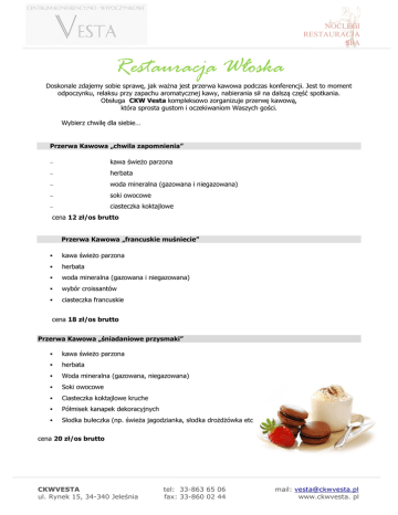 NOCLEGI RESTAURACJA SPA Restauracja Włoska Doskonale zdajemy sobie sprawę, jak ważna jest przerwa kawowa podczas konferencji. Jest to moment odpoczynku, relaksu przy zapachu aromatycznej kawy, nabierania sił na dalszą część spotkania. Obsługa CKW Vesta kompleksowo zorganizuje przerwę kawową, która sprosta gustom i oczekiwaniom Waszych gości. Wybierz chwilę dla siebie… Przerwa Kawowa „chwila zapomnienia” − kawa świeżo parzona − herbata − woda mineralna (gazowana i niegazowana) − soki owocowe − ciasteczka koktajlowe cena 12 zł/os brutto Przerwa Kawowa „francuskie muśniecie” kawa świeżo parzona herbata woda mineralna (gazowana i niegazowana) wybór croissantów ciasteczka francuskie cena 18 zł/os brutto Przerwa Kawowa „śniadaniowe przysmaki” kawa świeżo parzona herbata Woda mineralna (gazowana, niegazowana) Soki owocowe Ciasteczka koktajlowe kruche Półmisek kanapek dekoracyjnych Słodka bułeczka (np. świeża jagodzianka, słodka drożdżówka etc cena 20 zł/os brutto CKWVESTA ul. Rynek 15, 34-340 Jeleśnia tel: 33-863 65 06 fax: 33-860 02 44 mail: [email protected] www.ckwvesta. pl NOCLEGI RESTAURACJA SPA Przerwa Kawowa „orzeźwiające pobudzenie” kawa świeżo parzona (cukier biały i brązowy, mleko) herbata Woda mineralna (gazowana, niegazowana) Lemoniada ze świeżej cytryny, limetki z listkiem aromatycznej mięty Sałatka owocowa Tarta owocowa Czekoladki miętowe cena 21 zł/os brutto Przerwa Kawowa „słodka nuta” kawa świeżo parzona herbata Woda mineralna (gazowana, niegazowana) Soki owocowe Ciasteczka koktajlowe kruche Tartaletki owocowe Mufinki czekoladowe z kawałakami czekolady cena 22 zł/os brutto Przerwa Kawowa „domowe wspomnienie” kawa świeżo parzona herbata Woda mineralna (gazowana, niegazowana) Soki owocowe Ciasteczka koktajlowe kruche Ciasto domowe (np. sernik, szarlotka etc.) Roladki naleśnikowe z serem i dżemem podane na czekoladowej kołderce cena 20 zł/os brutto CKWVESTA ul. Rynek 15, 34-340 Jeleśnia tel: 33-863 65 06 fax: 33-860 02 44 mail: [email protected] www.ckwvesta. pl