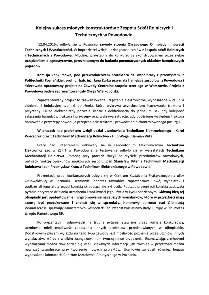 Kolejny sukces młodych konstruktorów z Zespołu Szkół Rolniczych i Technicznych w Powodowie. 12.04.2016r. odbyły się w Poznaniu zawody stopnia Okręgowego Olimpiady Innowacji Technicznych i Wynalazczości. W imprezie tej wzięła udział grupa uczniów z Zespołu szkół Rolniczych i Technicznych z Powodowa. Młodzież przystąpiła do konkursu ze skonstruowanym przez siebie urządzeniem diagnostycznym, przeznaczonym do badania pneumatycznych układów hamulcowych pojazdów. Komisja konkursowa, pod przewodnictwem prorektora ds. współpracy z przemysłem, z Politechniki Poznańskiej, prof. dr hab. inż. Jana Żurka przyznała I miejsce zespołowi z Powodowa i skierowała opracowany projekt na Zawody Centralne stopnia trzeciego w Warszawie. Projekt z Powodowa będzie reprezentował cały Okręg Wielkopolski. Zaprezentowany projekt to zaawansowane urządzenie elektroniczne, wyposażone w czujniki ciśnienia i indukcyjne czujniki położenia, które wykrywa asynchronizm hamowania traktora i przyczepy. Układ elektroniczny pozwala śledzić z dokładnością do jednej milisekundy kolejność załączania hamulców traktora i przyczepy oraz wykrywa sytuację, gdy opóźnione względem traktora hamowanie przyczepy powoduje przepchnięcie traktora i prowadzi do niekontrolowanego poślizgu. W pracach nad projektem wzięli udział uczniowie: z Technikum Elektronicznego - Karol Wieczorek oraz z Technikum Mechanizacji Rolnictwa - Filip Woga i Damian Wita. Prace nad urządzeniem odbywały się w Laboratorium Elektronicznym Technikum Elektronicznego w ZSRiT w Powodowie, a testowanie odbyło się w warsztatach Technikum Mechanizacji Rolnictwa. Pomocą przy pracach służyli nauczyciele przedmiotów zawodowych, pełniący funkcję opiekunów naukowych zespołu: pan Stanisław Piter z Technikum Mechanizacji Rolnictwa i pan Przemysław Kranz z Technikum Elektronicznego w Powodowie. Prezentacja prac konkursowych odbyła się w Centrum Kształcenia Praktycznego na ulicy Grunwaldzkiej w Poznaniu. Uczniowie, podczas zawodów, zaprezentowali swój wynalazek i podkreślali jego atuty przed komisją składającą się z 6 osób. Podczas prezentacji komisja zadawała pytania dotyczące działania urządzenia i możliwości jego użycia w życiu codziennym. Główną ideą tej olimpiady jest opatentowanie i wypromowanie najlepszych wynalazków, które w przyszłości mają szansę być produkowane i znaleźć się w sprzedaży. Honorowy patronat nad Olimpiadą Wynalazczości sprawują: Ministerstwo Gospodarki RP, Przedstawicielstwo Rady Europy w RP, Prezes Urzędu Patentowego RP. Po prezentacji i odpowiedzi na trudne pytania, stawiane przez komisję konkursową, uczniowie mieli możliwość zobaczenia innych projektów przedstawianych w olimpiadzie. Dodatkowym plusem wyjazdu na tego typu zawody jest możliwość poznania przez uczniów innych wynalazców, którzy z wielkim zaangażowaniem tworzą nowe urządzenia. Rozmawiając z młodymi wynalazcami można dowiedzieć się wielu ciekawych informacji, jak również w przyszłości można nawiązać współpracę przy tworzeniu nowych projektów. Uczniowie zwiedzili również bogato wyposażone laboratoria Centrum Kształcenia Praktycznego w Poznaniu. Zzwycięzcy z Powodowa otrzymali dyplomy za zajęcie pierwszego miejsca oraz upominki w postaci elektronicznych zegarków – typu „Smartwatch”. Przypominamy, że dwa lata temu ZSRiT Powodowo odniósł podobny sukces: trzyosobowy zespół dostał się na zawody Centralne Olimpiady Innowacji Technicznych i Wynalazczości, z projektem ”Sterowanie lamp przenośnych pojazdu za pomocą fal radiowych”. Jak uczy doświadczenie, wielkie projekty nie muszą powstawać w dużych ośrodkach, a wybitnie zdolni uczniowie znajdują się również w Powodowie. Metoda nauczania przedmiotów zawodowych w Technikum Elektronicznym i Technikum Mechanizacji Rolnictwa, przez zespołowe tworzenie prototypów urządzeń, daje przedsmak pracy konstruktora oraz prowadzi do rozwoju kreatywności młodzieży. Życzymy drużynie z Powodowa - reprezentującej Wielkopolskę - sukcesu na Zawodach Centralnych w Warszawie. Zawody te odbędą się w maju bieżącego roku. Przemysław Kranz rys 1. Uczniowie: Filip Woga i Damian Wita na stanowisku prezentacyjnym, Karol Wieczorek robi zdjęcie. rys 2. Urządzenie diagnostyczne na stanowisku prezentacyjnym.