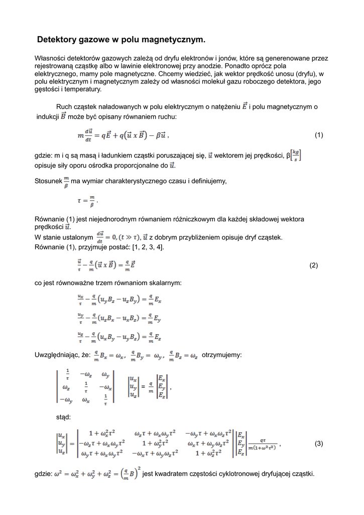 Detektory gazowe w polu magnetycznym. Własności detektorów gazowych zależą od dryfu elektronów i jonów, które są generenowane przez rejestrowaną cząstkę albo w lawinie elektronowej przy anodzie. Ponadto oprócz pola elektrycznego, mamy pole magnetyczne. Chcemy wiedzieć, jak wektor prędkość unosu (dryfu), w polu elektrycznym i magnetycznym zależy od własności molekuł gazu roboczego detektora, jego gęstości i temperatury. Ruch cząstek naładowanych w polu elektrycznym o natężeniu indukcji może być opisany równaniem ruchu: i polu magnetycznym o , (1) gdzie: m i q są masą i ładunkiem cząstki poruszającej się, opisuje siły oporu ośrodka proporcjonalne do . Stosunek wektorem jej prędkości, β ma wymiar charakterystycznego czasu i definiujemy, . Równanie (1) jest niejednorodnym równaniem różniczkowym dla każdej składowej wektora prędkości . W stanie ustalonym , z dobrym przybliżeniem opisuje dryf cząstek. Równanie (1), przyjmuje postać: [1, 2, 3, 4]. (2) co jest równoważne trzem równaniom skalarnym: Uwzględniając, że: otrzymujemy: = , stąd: , gdzie: jest kwadratem częstości cyklotronowej dryfującej cząstki. (3) Równanie (3) może być zapisane w formie wektorowej, bardziej przydatnej do analizy ruchu elektronu lub jonu w detektorze. , (4) są wersorami pola elektrycznego i magnetycznego. Kierunek wektora jest determinowany przez wielkość . W najprostszym przypadku, gdy , tzn. , otrzymujemy: - ruchliwość), . Dla dużych jest prawie równoległe dominuje czynnik do . Patrząc na równanie (4) możemy powiedzieć, że jest sumą trzech składowych, składowej w kierunki pola , składowej w kierunku pola i składowej w kierunku pola . W eksperymentach fizyki wysokich energii, tzw. wielodrutowe centralne detektory śladowe umieszczone są wewnątrz solenoidu. Dla tych detektorów , wtedy: . Dla uproszczenia załóżmy że (5) , mamy: , (składowa w kierunku pola ) (6a) , (6b) , (6c) . (6d) jest to kąt zawarty między wektorem i wektorem i nosi nazwę kąta Lorentza. W tym przypadku pole wydłuża trajektorię ruchu elektronów do elektrody zbiorczej. Jeżeli centralnym detektorem śladowym jest komora dryfowa z projekcją czasu to . Dla uproszczeń otrzymujemy: . Należy zwrócić uwagę, że jakakolwiek niejednorodność pola tzn. , i , to ze względu na dużą wartość , generuje niezaniedbywalne wartości , , założono, że cos ( . Czas zbierania ładunków jest krytycznym parametrem dla detektorów gazowych pracujących w eksperymentach fizyki wysokiej energii. Jest zdeterminowany przez prędkość dryfu elektronów, jej zależność od natężenia pola w detektorze i kierunku zewnętrznego pola magnetycznego. Detektory mogą być położone równolegle do linii sił pola magnetycznego, jak i prostopadle. Obecność pola magnetycznego wydłuża czas zbierania ładunków a wielkość wydłużania zależy od wzajemnej orientacji pól elektrycznego i magnetycznego. Przykładowe zależności prędkości dryfu dla mieszanin stosowanych w eksperymentach fizyki wysokich energii bez i z polem magnetycznym pokazano na rys. 1, 2, 3a i kąta Lorentza pokazano na wykresach 3b i 4b. Rys. 1 Zależność prędkości dryfu od natężenia pola elektrycznego w mieszaninie Xe + CO2 + CF4 z polem magnetycznym i bez pola magnetycznego [5]. Rys. 2 Zależność prędkości dryfu od wartości indukcji pola magnetycznego dla dwóch konfiguracji: pole B równoległe do pola elektrycznego i pole B prostopadłe do pola elektrycznego (typowe konfiguracje pól E i B w eksperymentach fizycznych). Mieszanina Ar/CO2, 85/15 [4]. Rys. 3 a Zależność prędkości dryfu elektronów w CH4 od natężenia a pola elektrycznego dla różnych wartości indukcji pola magnetycznego [6]. Rys. 3 b Zależność kąta Lorentza dla CH4 od natężenia pola elektrycznego dla różnych wartości indukcji pola magnetycznego [6]. Rys. 4 a Zależność składowej równoległej do pola elektrycznego prędkości dryfu od natężenia pola elektrycznego dla różnych ciśnień gazu roboczego dla mieszaniny Ar/CH4, 90/10 [7]. Rys. 4 b Zależność kąta Lorentza od natężenia pola elektrycznego dla różnych ciśnień gazu roboczego, dla mieszaniny Ar/CH4, 90/10 [7]. W praktyce całkowity czas zbierania zależy od składowej prędkości dryfu równoległej do linii sił pola elektrycznego, rys. 4 a. Składowa ta maleje gwałtownie w obecności pola magnetycznego, dla natężeń pól elektrycznych poniżej 1kV/cm. Pola takie występują w detektorze w odległości większej niż 1 mm od osi anody. Oznacza to, że nawet dla detektorów słomkowych o promieniu katody 2 mm, wpływ zewnętrznego pola magnetycznego jest znaczny. Rys. 5 Kształt linii sił pola elektrycznego i izochron w komorze wielodrutowej bez i z polem magnetycznym [4.1]. Na rys. 5 pokazano linie sił pola elektrycznego (linie dryfu elektronów) i izochrony dla typowej geometrii komory dryftowej dla B = 0 T i B = 2T. Widać wyraźnie wydłużenie trajektorii ruchu elektronów. Dla pola B = 2T jeszcze wszystkie linie kończą się na drutach potencjałowych, dla B > 2T, część linii będzie kończyć się na obudowie, co w konsekwencji spowoduje obniżenie wydajności detekcji, rys. 6 i 7. Rys. 6 Zależność wydajności detekcji promieniowania w funkcji wartości indukcji pola magnetycznego dla dwóch konfiguracji: pole B równoległe do pola elektrycznego i pole B prostopadłe do pola elektrycznego. Mieszanina Ar/CO2, 85/15 [4]. Rys. 7 Zależność wydajności detekcji promieniowania od długości drogi dryfu elektronów dla różnych wartości indukcji pola magnetycznego. Pole magnetyczne jest prostopadłe do pola elektrycznego. Mieszanina Ar/CO2, 85/15 [4]. 1. Pomiar kąta Lorentza. Kąt Lorentza (wzór 6d) zależy od dwóch parametrów , ale tylko zależy od procesów fizycznych zachodzących podczas dryfu elektronów. Uwzględniając, że i zakładając, że jest niezależne od B, równanie (6d) przyjmuje postać: 