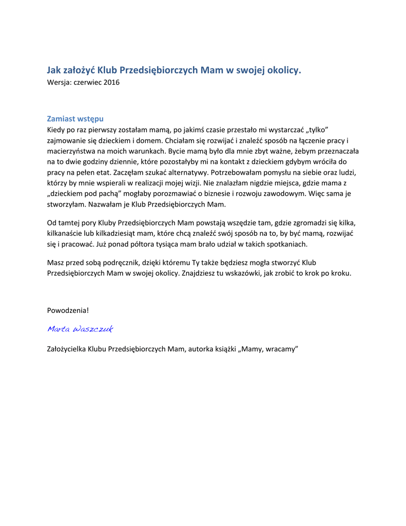 Jak założyć Klub Przedsiębiorczych Mam w swojej okolicy. Wersja: czerwiec 2016 Zamiast wstępu Kiedy po raz pierwszy zostałam mamą, po jakimś czasie przestało mi wystarczać „tylko” zajmowanie się dzieckiem i domem. Chciałam się rozwijać i znaleźć sposób na łączenie pracy i macierzyństwa na moich warunkach. Bycie mamą było dla mnie zbyt ważne, żebym przeznaczała na to dwie godziny dziennie, które pozostałyby mi na kontakt z dzieckiem gdybym wróciła do pracy na pełen etat. Zaczęłam szukać alternatywy. Potrzebowałam pomysłu na siebie oraz ludzi, którzy by mnie wspierali w realizacji mojej wizji. Nie znalazłam nigdzie miejsca, gdzie mama z „dzieckiem pod pachą” mogłaby porozmawiać o biznesie i rozwoju zawodowym. Więc sama je stworzyłam. Nazwałam je Klub Przedsiębiorczych Mam. Od tamtej pory Kluby Przedsiębiorczych Mam powstają wszędzie tam, gdzie zgromadzi się kilka, kilkanaście lub kilkadziesiąt mam, które chcą znaleźć swój sposób na to, by być mamą, rozwijać się i pracować. Już ponad półtora tysiąca mam brało udział w takich spotkaniach. Masz przed sobą podręcznik, dzięki któremu Ty także będziesz mogła stworzyć Klub Przedsiębiorczych Mam w swojej okolicy. Znajdziesz tu wskazówki, jak zrobić to krok po kroku. Powodzenia! Marta Waszczuk Założycielka Klubu Przedsiębiorczych Mam, autorka książki „Mamy, wracamy” Jak zacząć? Oto pięć kroków, dzięki którym z łatwością uruchomisz Klub Przedsiębiorczych Mam w swojej okolicy. 1. Wybierz miejsce, w którym możecie się spotykać To może być kawiarnia, biblioteka, sala w domu kultury albo dom/mieszkanie prywatne. Zacznij od tego, co jest w tym momencie dla Ciebie możliwe/dostępne. 2. Ustal datę i godzinę Z naszych doświadczeń wynika, że mamy małych dzieci (do 2-‐3 lat) chętniej spotykają się w ciągu dnia, w tygodniu. Szczególnie, jeśli starsze rodzeństwo jest w tym czasie w przedszkolu lub szkole. Mamy pracujące często wolą spotkania popołudniowe/wieczorne albo w weekendy. Sprawdź, która opcja najbardziej pasuje Tobie i mamom, które chcesz włączyć do Klubu Przedsiębiorczych Mam 3. Wyślij zaproszenia Na pierwsze spotkanie pierwszego Klubu Przedsiębiorczych Mam przyszło kilka osób, które były znajomymi oraz znajomymi znajomych. Ty też tak możesz zacząć. Napisz wiadomość [przykład takiej wiadomości znajdziesz poniżej] i wyślij ją do znajomych mam oraz innych osób, które mogą Ci pomóc rozprzestrzenić wieści o tym, że uruchamiasz Klub Przedsiębiorczych Mam (mailem oraz korzystając z platform mediów społecznościowych). 4. Spotkajcie się O tym jak może przebiegać spotkanie dowiesz się z następnego rozdziału. 5. Ustalcie datę kolejnych spotkań Jeśli chcecie intensywnie pracować nad swoimi celami warto się spotykać raz w tygodniu. Spotykanie się raz w miesiącu też się sprawdza. Zdecydujcie, jaka częstotliwość jest dla was optymalna. I na jaki okres się umawiacie (np. pół roku, rok, itp.). Przykładowa wiadomość: Uruchamiam Klub Przedsiębiorczych Mam, czyli spotkania dla mam, które chcą się wzajemnie wspierać i dopingować w łączeniu pracy i macierzyństwa i/lub tworzeniu i rozwijaniu swojej firmy. Pierwsze spotkanie odbędzie się [data, godzina] w [miejsce, adres]. Potrwa około 2 godziny. Bezpłatne. Można przyjść z dzieckiem. Zarezerwuj miejsce pisząc do: [adres email organizatorki] i podziel się tą wiadomością z innymi mamami. Dziękuję! Korzyści z udziału w Klubie Przedsiębiorczych Mam: • • • • • • • • masz grupę osób, która się wzajemnie wspiera w realizacji swoich celów zawodowych/biznesowych poznajesz grupę osób, którym chce się zrobić coś więcej i zależy im na tym, żeby rozwijać się zawodowo / biznesowo przestajesz być sama ze swoimi myślami, wątpliwościami, planami, pomysłami i (prawdziwymi lub wyimaginowanymi) przeszkodami zyskujesz dostęp do pomysłów, umiejętności i sieci kontaktów innych osób zwiększa się Twoja motywacja do realizacji zobowiązań, o których powiedziałaś innym osobom w grupie masz grono osób, z którymi możesz się podzielić swoimi sukcesami oraz wyzwaniami / problemami „co dwie głowy to nie jedna” -‐ dzięki klubowi zyskujesz kilka głów, które wraz z Tobą generują sposoby poradzenia sobie z przeszkodami, które pojawiają się na drodze do celu masz możliwość poznania punktów widzenia oraz doświadczeń innych osób, których prawdopodobnie nie poznałabyś w innych okolicznościach Dobre praktyki: • • • • wyślij maila przypominającego o spotkaniu Klubu Przedsiębiorczych Mam dzień przed spotkaniem. optymalna wielkość grupy to 5 do 8 osób przygotuj się na to, że osoby o niskiej motywacji do realizacji swojego celu mogą nie dotrzeć na spotkanie (mimo najgorętszych zapewnień, że się pojawią) -‐ to niestety bolączka darmowych spotkań, a do tego zdarza się, że w ostatniej chwili mamom przytrafi się coś związanego z dziećmi, przez co nie może przyjść… wymieniajcie się rolami: organizatorki, prowadzącej spotkanie, pilnującej czasu, notującej zobowiązania, robiącej zdjęcia, przynoszącej herbatkę itp. Scenariusz spotkania 1. Wstęp przedstawienie się prowadzącej, co to za spotkanie, jaki jest jego cel i jak będzie przebiegać [czas: ok. 5 min] 2. Rundka -‐ przedstawienie się obecnych: imię i nazwisko, czym się zajmuję [warianty: w czym pomagam i komu? | dobra wiadomość na dziś ] przy kolejnych spotkaniach, jeśli wszyscy się już znają oczywiście można ten punkt pominąć [czas: zależy od liczby uczestników, ok. 30 sek/os] 3. Rundka -‐ co mi się udało zrobić od ostatniego spotkania oraz moje wyzwanie na dziś wyzwanie = temat / przeszkoda / problem, który obecnie mnie zatrzymuje w drodze do celu. [czas: zależy od liczby uczestników, ok. 1 minuta/os] 4. Wybór tematów / osób, nad którymi będ