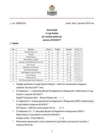 L. dz. 2366/2016 Łódź, dnia 7 grudnia 2016 rok Komunikat II Ligi Kobiet po rundzie jesiennej sezonu 2016/2017 I. Tabela Poz. Drużyna Mecze Punkty Bramki 1 Stomil Olsztyn SA 10 26 31 - 4 8 2 0 2 Dargfil 11 26 39 - 15 8 2 1 3 UMKS Zgierz 11 23 17 – 8 7 2 2 4 UKS Ząbkovia Ząbki 11 21 33 - 13 6 3 2 5 AZS KU UNIWERSYTETU W-WY 10 20 16 – 6 6 2 2 6 KS Teresin 11 20 22 – 7 6 2 3 7 PKS Piastovia Piastów 11 13 21 - 26 4 1 6 8 FK Jantar Ostrołęka 11 12 20 - 22 4 0 7 9 UKS Olimp Loczki Wyszków 11 10 19 - 43 3 1 7 10 Forty Piątnica 11 6 11 – 29 1 3 7 11 Kolejarz Łódź 11 6 7 – 24 2 0 9 12 DTS Elhurt-Elmet Helios Białystok 11 3 9 – 46 1 0 10 • Z R P Zaległe spotkanie 5 kolejki Stomil Olsztyn – AZS KU Uniwersytet rozegrane zostanie 18 marca 2017 roku. • O miejscach 1 - 2 decyduje §9 pkt 2d Regulaminu Rozgrywek o Mistrzostwo II Ligi Kobiet w sezonie 2016/2017 Dargfil Tomaszów Maz. - Stomil Olsztyn SA • 1:1 O miejscach 5 – 6 decyduje §9 pkt 2a Regulaminu Rozgrywek ŁZPN o Mistrzostwo II Ligi Kobiet w sezonie 2016/2017 KS Teresin – AZS KU Uniwersytetu W-wy • 0:2 O miejscach 10 – 11 decyduje §9 pkt 2a Regulaminu Rozgrywek ŁZPN o Mistrzostwo II Ligi Kobiet w sezonie 2016/2017 Kolejarz Łódź – Forty Piątnica • 1:3 Planowane rozpoczęcie rundy wiosennej II Ligi Kobiet wyznaczono na dzień 1 kwietnia 2016 rok 1 II. Kary i napomnienia 1. AZS KU Uniwersytetu W-wy Orzechowska Aleksandra 2 ż.k. Przybyłowicz Julia 1 ż.k. Smolińska Marlena 1 ż.k. 2. Dargfil Tomaszów Dąbrowska Daria 1 ż.k. Witoń Marta 1 ż.k. 3. DTS Elhurt-Elmet Helios Białystok Choińska Karolina 1 ż.k. Czudzinowicz Monika 2 ż.k. Zubrzycka Aleksandra 2 ż.k. 4. FK Jantar Ostrołęka Galarska Aleksandra 1 ż.k. Majewska Beata 1 ż.k. Ostrowska Dominika 1 ż.k. Piersa Oliwia 1 ż.k. Tomczak Joanna ż.k. 5. Forty Piątnica Ciuchnicka Katarzyna 1 ż.k. Kołakowska Klaudia 1 ż.k. Piszczatowska Gabriel 1 ż.k. 6. Kolejarz Łodź Kluszczyńska Elżbieta 1 ż.k. Kowalczyk Małgorzata 1 ż.k. Marcińska Sylwia 1 ż.k. Piątkowska Weronika 1 ż.k. 7. KS Teresin Dąbrowska Patrycja 1 ż.k. Kozłowska Aleksandra 2 ż.k. Rozparzyńska Martyna 1 ż.k. Sawiak Martyna 1 ż.k. 2 Ziółkowska Monika 1 ż.k. Żak Katarzyna 1 ż.k. 8. PKS Piastovia Piastów Bordziakowska Aleksandra 2 ż.k. Dąbrowska Aneta 1 ż.k. Marciniak Patrycja 1 ż.k. Mitrus Dorota 1 ż.k. Szkop Katarzyna 2 ż.k. Trojan Karina 1 ż.k. Wasil Monika 3 ż.k. Zbrzeźniak Iga 4 ż.k. 9. Stomil Olsztyn SA Brzozowska-Stańczyk Agnieszka 2 ż.k. Chudzik Aleksandra 1 ż.k. Kowalska Paulina 1 ż.k. Lenard Natalia 1 ż.k. Rosaik Adrian 1 ż.k. Shahbazyan Anaida 1 ż.k. 10.UKS Olimp Loczki Wyszków Król Malwina 1 ż.k. Tarnażewska Natalia 1 ż.k. 11.UKS Ząbkovia Żąbki Górecka Magdalena 1 ż.k. Kuch Magdalena 1 ż.k. Rudy Anna 1 ż.k. Wrześniak Wrzesińska Maria 1 ż.k. 12.UMKS Zgierz Kucina Paulina 1 ż.k. Makowska Martyna 1 ż.k. Martyka Martyna 1 ż.k. Pacler Magdalena 1 ż.k. Pelka Patrycja 1 ż.k. 3 Pioruńska Anna 1 ż.k. Weryfikator WGiE Przewodniczący WGiE Krzysztof Kiernowicz Piotr Kubisiak 4