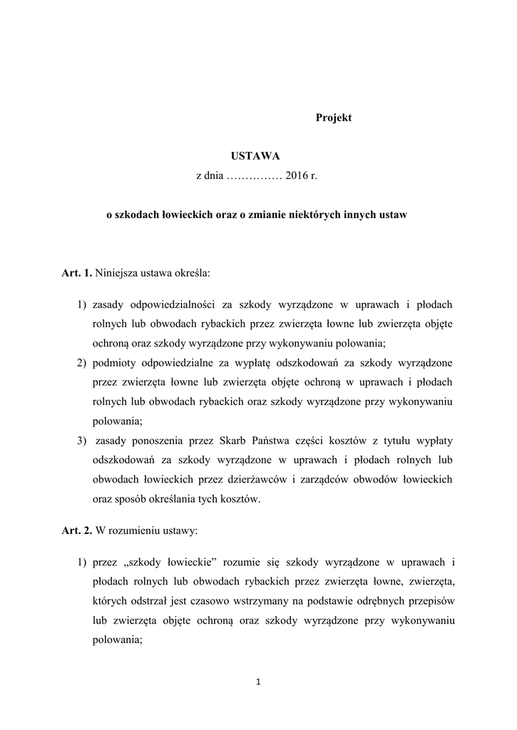 Projekt USTAWA z dnia …………… 2016 r. o szkodach łowieckich oraz o zmianie niektórych innych ustaw Art. 1. Niniejsza ustawa określa: 1) zasady odpowiedzialności za szkody wyrządzone w uprawach i płodach rolnych lub obwodach rybackich przez zwierzęta łowne lub zwierzęta objęte ochroną oraz szkody wyrządzone przy wykonywaniu polowania; 2) podmioty odpowiedzialne za wypłatę odszkodowań za szkody wyrządzone przez zwierzęta łowne lub zwierzęta objęte ochroną w uprawach i płodach rolnych lub obwodach rybackich oraz szkody wyrządzone przy wykonywaniu polowania; 3) zasady ponoszenia przez Skarb Państwa części kosztów z tytułu wypłaty odszkodowań za szkody wyrządzone w uprawach i płodach rolnych lub obwodach łowieckich przez dzierżawców i zarządców obwodów łowieckich oraz sposób określania tych kosztów. Art. 2. W rozumieniu ustawy: 1) przez „szkody łowieckie” rozumie się szkody wyrządzone w uprawach i płodach rolnych lub obwodach rybackich przez zwierzęta łowne, zwierzęta, których odstrzał jest czasowo wstrzymany na podstawie odrębnych przepisów lub zwierzęta objęte ochroną oraz szkody wyrządzone przy wykonywaniu polowania; 1 2) przez „zwierzęta łowne” rozumie się zwierzęta, o których mowa w rozporządzeniu Ministra Środowiska z dnia 11 marca 2005 r. w sprawie ustalenia listy gatunków zwierząt łownych (Dz. U. z 2005, Nr 45 poz. 433); 3) przez „zwierzęta objęte ochroną” rozumie się zwierzęta objęte ochroną gatunkową, o których mowa w rozporządzeniu Ministra Środowiska z dnia 6 października 2014 r. w sprawie ochrony gatunkowej zwierząt (Dz. U. z 2014, poz. 1348); Art. 3. 1. Skarb Państwa odpowiada za szkody wyrządzone w uprawach i płodach rolnych lub obwodach rybackich przez zwierzęta objęte ochroną. 2. Skarb Państwa odpowiada za szkody wyrządzone w uprawach i płodach rolnych lub obwodach rybackich przez zwierzęta, których odstrzał jest czasowo wstrzymany na podstawie odrębnych przepisów, powstałe w okresie obowiązywania zakazu. 3. Skarb Państwa odpowiada za szkody wyrządzone w uprawach i płodach rolnych lub obwodach rybackich przez zwierzęta łowne na obszarach niewchodzących w skład obwodów łowieckich. 4. Skarb Państwa ponosi część kosztów poniesionych przez zarządców lub dzierżawców obwodów łowieckich w związku z wypłatą odszkodowań za szkody w uprawach i płodach rolnych lub obwodach rybackich wyrządzone przez zwierzęta łowne na zasadach wskazanych w art. 6. Art. 4. 1. Za szkody, o których mowa w art. 3 ust. 1 – 3 odszkodowania wypłaca wojewoda ze środków budżetu państwa. 2. Oględzin i szacowania szkód, o których mowa w ust. 1 dokonują przedstawiciele wojewody przy udziale poszkodowanego lub jego pełnomocnika i przedstawiciela właściwej terytorialnie izby rolniczej. Art. 5. 1. Dzierżawcy lub zarządcy obwodów łowieckich obowiązani są do wynagradzania szkód wyrządzonych w uprawach i płodach rolnych lub obwodach rybackich przez zwierzęta łowne oraz za szkody wyrządzone przy wykonywaniu polowania. 2 2. Odszkodowanie, o którym mowa w ust. 1 nie obejmuje utraconych korzyści. 3. Oględzin i szacowania szkód, a także ustalania wysokości odszkodowania dokonują przedstawiciele zarządcy lub dzierżawcy obwodu łowieckiego wspólnie z poszkodowanym lub jego pełnomocnikiem. Na wniosek strony w oględzinach, szacowaniu szkód oraz ustalaniu wysokości odszkodowania uczestniczy przedstawiciel właściwej terytorialnie izby rolniczej. W czynnościach oględzin i szacowania szkód mogą uczestniczyć z własnej inicjatywy przedstawiciele samorządu gminnego. 4. W przypadku gdy pomiędzy właścicielem lub posiadaczem gruntu albo użytkownikiem obwodu rybackiego, a dzierżawcą lub zarządcą obwodu łowieckiego powstał spór o wysokość wynagrodzenia za szkody łowieckie, strony mogą zwrócić się do właściwego ze względu na miejsce powstałej szkody organu gminy w celu mediacji dla polubownego rozwiązania sporu. Art. 6. 1. Dzierżawcy lub zarządcy obwodów łowieckich mogą wystąpić do wojewody z wnioskiem o zwrot części kosztów poniesionych w związku z wypłatą odszkodowań za szkody w uprawach i płodach rolnych lub obwodach rybackich wyrządzone przez zwierzęta łowne w wysokości: 1) 50% kwoty odszkodowań wypłaconych w poprzednim łowieckim roku gospodarczym, w przypadku pozyskania co najmniej 90% maksymalnej liczby zwierząt łownych przeznaczonych do pozyskania w danym roku gospodarczym; 2) 30% kwoty odszkodowań wypłaconych w poprzednim łowieckim roku gospodarczym, w przypadku pozyskania co najmniej 80% maksymalnej liczby zwierząt łownych przeznaczonych do pozyskania w danym roku gospodarczym. 2. Wniosek, o którym mowa w ust. 1, składany jest w terminie 30 dni od dnia zatwierdzenia rocznego planu łowieckiego na łowiecki rok gospodarczy następujący po roku, w którym dzierżawca lub zarządca wypłacił odszkodowania. 3. Wniosek zawiera: 1) potwierdzone przez właściwego nadleśniczego Państwowego Gospodarstwa Leśnego Lasy Państwowe dane o kwocie wypłaconych odszkodowań i wykonaniu rocznego planu łowieckiego; 3 2) dokumenty potwierdzające rzeczywistą wypłatę odszkodowań. 4. Wypłata środków, o której mowa w ust. 1, następuje ze środków budżetu państwa w terminie 6 miesięcy od dnia złożenia do wojewody wniosku spełniającego wymagania wskazane w ust. 3. Art. 7. 1. Właściciele lub posiadacze gruntów rolnych i leśnych lub użytkownicy obwodów rybackich powinni, zgodnie z potrzebami, współdziałać z dzierżawcami i zarządcami obwodów łowieckich w zabezpieczaniu gruntów przed szkodami łowieckimi. 2. Współdziałanie, o którym mowa w ust. 1, polega w szczególności na: 1) podejmowaniu działań wspólnie z dzierżawcami lub zarządcami obwodów łowieckich w zakresie zabezpieczania zagrożonych upraw, płodów rolnych lub obwodów rybackich przez stosowanie na koszt dzi