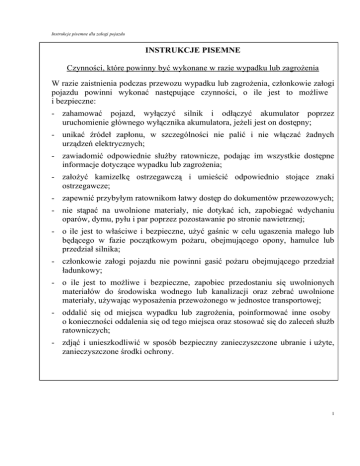 Instrukcje pisemne dla załogi pojazdu INSTRUKCJE PISEMNE Czynności, które powinny być wykonane w razie wypadku lub zagrożenia W razie zaistnienia podczas przewozu wypadku lub zagrożenia, członkowie załogi pojazdu powinni wykonać następujące czynności, o ile jest to możliwe i bezpieczne: - zahamować pojazd, wyłączyć silnik i odłączyć akumulator poprzez uruchomienie głównego wyłącznika akumulatora, jeżeli jest on dostępny; - unikać źródeł zapłonu, w szczególności nie palić i nie włączać żadnych urządzeń elektrycznych; - zawiadomić odpowiednie służby ratownicze, podając im wszystkie dostępne informacje dotyczące wypadku lub zagrożenia; - założyć kamizelkę ostrzegawczą i umieścić odpowiednio stojące znaki ostrzegawcze; - zapewnić przybyłym ratownikom łatwy dostęp do dokumentów przewozowych; - nie stąpać na uwolnione materiały, nie dotykać ich, zapobiegać wdychaniu oparów, dymu, pyłu i par poprzez pozostawanie po stronie nawietrznej; - o ile jest to właściwe i bezpieczne, użyć gaśnic w celu ugaszenia małego lub będącego w fazie początkowym pożaru, obejmującego opony, hamulce lub przedział silnika; - członkowie załogi pojazdu nie powinni gasić pożaru obejmującego przedział ładunkowy; - o ile jest to możliwe i bezpieczne, zapobiec przedostaniu się uwolnionych materiałów do środowiska wodnego lub kanalizacji oraz zebrać uwolnione materiały, używając wyposażenia przewożonego w jednostce transportowej; - oddalić się od miejsca wypadku lub zagrożenia, poinformować inne osoby o konieczności oddalenia się od tego miejsca oraz stosować się do zaleceń służb ratowniczych; - zdjąć i unieszkodliwić w sposób bezpieczny zanieczyszczone ubranie i użyte, zanieczyszczone środki ochrony. 1 Dodatkowe wskazówki dla członków załogi pojazdu dotyczące charakterystyki zagrożeń stwarzanych przez towary niebezpieczne określonej klasy oraz czynności zależnych od zaistniałej sytuacji Nalepki ostrzegawcze Charakterystyka zagrożeń Dodatkowe wskazówki (2) (3) (1) Materiały i przedmioty wybuchowe 1 1.5 1.6 Mogą mieć różne właściwości i wywoływać różne efekty, takie jak: wybuch masowy, rozrzut odłamków, intensywny pożar, intensywne Ukryć się z dala od okien. wydzielanie ciepła, świecenie, huk lub wydzielanie dymu. Są wrażliwe na uderzenia i ciepło. Materiały i przedmioty wybuchowe Niewielkie zagrożenie wybuchem i pożarem. Ukryć się. 1.4 Gazy palne Zagrożenie pożarem. Zagrożenie wybuchem. Mogą znajdować się pod ciśnieniem. Ukryć się. Zagrożenie uduszeniem. Unikać zagłębień terenu. Mogą powodować oparzenia lub odmrożenia. 2.1 Zagrożenie wybuchem wskutek podgrzania. Gazy niepalne, nietrujące Zagrożenie uduszeniem. Mogą znajdować się pod ciśnieniem. Ukryć się. Mogą powodować odmrożenia. Unikać zagłębień terenu. Zagrożenie wybuchem w przypadku podgrzania. 2.2 Gazy trujące Zagrożenie zatruciem. Użyć maski ucieczkowej. Mogą znajdować się pod ciśnieniem. Mogą powodować oparzenia lub odmrożenia. Zagrożenie wybuchem wskutek podgrzania. Ukryć się. Unikać zagłębień terenu. 2.3 Materiały ciekłe zapalne Ukryć się. Zagrożenie pożarem. Unikać zagłębień terenu. Zagrożenie wybuchem. 3 3 Zagrożenie wybuchem w przypadku podgrzania. Nie dopuszczać do przedostania się uwolnionych materiałów do środowiska wodnego i kanalizacji. 3 Materiały stałe zapalne, materiały samoreaktywne i materiały wybuchowe stałe odczulone 4 4.1 Zagrożenie pożarem. Mogą zapalić się od źródła ciepła, iskry lub płomienia. Mogą zawierać materiały samoreaktywne skłonne do rozkładu egzotermicznego wskutek dostarczenia Nie dopuszczać do przedostania się uwolnionych ciepła, kontaktu z innymi materiałami (takimi jak materiałów do środowiska wodnego i kanalizacji. kwasy, związki metali ciężkich i aminy), tarcia lub uderzenia. W wyniku rozkładu mogą wydzielać się szkodliwe i palne gazy lub pary. Zagrożenie wybuchem w przypadku podgrzania. Materiały samozapalne Zagrożenie uszkodzenia zawartości. 4 samozapaleniem sztuki przesyłki w lub przypadku uwolnienia Mogą silnie reagować z wodą. 4.2 Materiały wytwarzające w zetknięciu z wodą gazy palne Zagrożenie pożarem i wybuchem w przypadku kontaktu z wodą. 4 4 4.3 2 Uwolniony materiał powinien być utrzymywany w stanie suchym, pod przykryciem. Nalepki ostrzegawcze Charakterystyka zagrożeń Dodatkowe wskazówki (1) (2) (3) Materiały utleniające Zagrożenie pożarem i wybuchem. Zagrożenie silną reakcją w przypadku kontaktu z materiałami palnymi. 5.1 Nie dopuszczać do zmieszania z materiałami palnymi (np. z trocinami). 5.1 Nadtlenki organiczne 5.2 5.2 Zagrożenie rozkładem egzotermicznym wskutek dostarczenia ciepła, kontaktu z innymi materiałami (takimi jak kwasy, związki metali ciężkich i aminy), tarcia lub uderzenia. W wyniku rozkładu mogą wydzielać się szkodliwe i palne gazy lub pary. Nie dopuszczać do zmieszania z materiałami palnymi (np. z trocinami). 5.2 Materiały trujące Zagrożenie zatruciem. Zagrożenie w przypadku przedostania się do środowiska wodnego i kanalizacji. Użyć maski ucieczkowej. 6.1 Materiały zakaźne Zagrożenie zakażeniem. Zagrożenie w przypadku przedostania się do środowiska wodnego i kanalizacji. 6.2 Materiały promieniotwórcze 7A 7B Zagrożenie wchłonięciem i napromieniowaniem zewnętrznym. Ograniczyć czas narażenia. RADIOACTIVE 7 7C 7D Materiały rozszczepialne Zagrożenie reakcją łańcuchową. 7E Materiały żrące Zagrożenie poparzeniem. Mogą silnie reagować ze sobą, z wodą i z innymi materiałami. 8 Różne materiały i przedmioty niebezpieczne Zagrożenie w przypadku przedostania się do środowiska wodnego i kanalizacji. Nie dopuszczać do przedostania się uwolnionych materiałów do środowiska wodnego i kanalizacji. Zagrożenie poparzeniem. Zagrożenie pożarem. Zagrożenie wybuchem. Nie dopuszcza