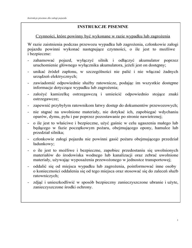 Wzór instrukcji pisemnych dla załogi pojazdu