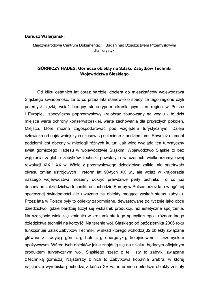 Dariusz Walerjański Międzynarodowe Centrum Dokumentacji i Badań nad Dziedzictwem Przemysłowym dla Turystyki GÓRNICZY HADES. Górnicze obiekty na Szlaku Zabytków Techniki Województwa Śląskiego Od kilku ostatnich lat coraz bardziej dociera do mieszkańców województwa Śląskiego świadomość, że to co przez lata stanowiło o specyfice tego regionu czyli przemysł ciężki, wciąż będący stereotypem określającym ten region w Polsce i Europie, specyficzny poprzemysłowy krajobraz zbudowany na węglu - to dziś miejsca warte ochrony konserwatorskiej, warte zachowania dla przyszłych pokoleń. Miejsca, które można zagospodarować pod względem turystycznym. Dzieje człowieka od najdawniejszych czasów są splecione z podziemiami. Również element podziemi jest obecny w mitologii różnych kultur. Jak więc wygląda ten turystyczny świat górniczego Hadesu w województwie Śląskim. Województwo Śląskie to bez wątpienia zagłębie zabytków techniki powstałych w czasach wielkoprzemysłowej rewolucji XIX i XX w. Wiele z przemysłowego dziedzictwa znikło, nie przetrwało okresu zmian ustrojowych i reform lat 90-tych XX w., ale wciąż w krajobrazie naszego województwa możemy odkryć prawdziwe perły techniki. To co już doceniano z dziedzictwa techniki na zachodzie Europy w Polsce przez lata w ogólnej społecznej świadomości nie uważano za obiekty mogące zyskać status zabytku. Przez lata w Polsce były to obiekty zapomniane, dewastowane politycznie jako obce dziedzictwo, gdzie bardziej liczył się wskaźnik produkcji, niż estetyczne spojrzenie. Na szczęście wiele się zmieniło w zrozumieniu tego specyficznego i różnorodnego dziedzictwa techniki na korzyść. Na terenie woj. Śląskiego od października 2006 roku funkcjonuje Szlak Zabytków Techniki, w skład którego wchodzą 32 obiekty związane głównie z tradycją górniczą, hutniczą, energetyką, kolejnictwem i przemysłem spożywczym. Wśród tych obiektów jakie znajdują się na szlaku, będącym oficjalnym produktem turystycznym woj. Śląskiego sześć z tej listy to zabytki związane z techniką górniczą. Najstarszy z nich to Zabytkowa kopalnia Srebra, w której najstarsze wyrobiska pochodzą z końca XV w., inne nieco młodsze obiekty zostały wykonane w XIX w. Tylko w dwóch z nich można zjechać w głąb kopalni jest to ZKWK „Guido” i ZK Srebra w Tarnowskich Górach. Każdy z tych wymienionych obiektów ma swoją niepowtarzalną przestrzeń i klimat. Zabytkowa Kopalnia Srebra w Tarnowskich Górach, dawna kopalnia Fryderyk, która została założona w 1784 r. na miejscu dawnych, a obecnie zrekonstruowanych górniczych wyrobisk górniczych. Również w Tarnowskich Górach na terenie parku krajobrazowego w Reptach znajduje się na głębokości od 25 - 30 metrów Sztolnia Czarnego Pstrąga udostępniona sezonowo dla ruchu turystycznego od 1957 r. Od 2004 r. obydwa obiekty są wpisane na listę Pomników Historii RP. Szyb, Maciej, to doskonały przykład obiektu, który zyskał nowe życie, dzięki inwestycji prywatnej firmy Przedsiębiorstwo Górnicze Demex, które jest jego właścicielem. Szyb ten został zbudowany prawdopodobnie w I poł. XX w. / ok. 1922 r.). Do największych atrakcji tego miejsca należy wejście na szczyt 25 metrowego szybu, w budynku maszynowni, czynna dwubębnowa elektryczna maszyna wyciągowa z lat 20 XX, wejście przez betonowe dyfuzory do wnętrza kanału powietrznego. Kanał prowadzi do szybu zjazdowego, gdzie przez specjalnie wykonany otwór w obmurzu turyści mogą zajrzeć w głąb szybu. Obecnie szyb został zamieniony na studnie głębinową z której wydobywa się wodę zdatną do spożycia. ZKWK GUIDO w Zabrzu to XIX w, kopalnia założona przez Guido Henckla von Donnersmarcka w 1855 r. Obecnie jest tu możliwość zjazdu na dwa podziemne poziomy 170 - gdzie mamy możliwość zapoznania się z górnictwem XIX w. z czasów gdzie razem z górnikami pracowały konie. Na tym poziomie mamy zachowane trzy XIX w. stajnie dla koni oraz prawdziwy już mało, gdzie spotykany XIX wieczny murowany piec wentylacyjny. Poziom 320 to poziom, na którym poznajemy XX wieczne górnictwo czyli od kilofa do kombajnu. Turysta ma tu do dyspozycji podziemną trasę o długości do 2 km. Kopalnia Guido to nie tylko turystyka podziemna to także bardzo prężnie działająca instytucja kultury. Organizowane są tu pod ziemią na poziomie 320 metrów w ramach cyklu spektakle teatralne, koncerty muzyczne, wystawy, wszystko pod hasłem kultura na poziomie. Kopalnia „Guido” od stycznia 2010 r. jest Punktem Kotwicznym na Europejskim Szlaku Dziedzictwa Przemysłowego /ERIH/. Skansen „Królowa Luiza” to odział terenowy Muzeum Górnictwa powstały na terenie najstarszej pierwszej pruskiej państwowej kopalni założonej w 1791. Dziś jego atrakcją jest cześć podziemna sztolni z przejazdem podziemną kolejką oraz czynna maszyna parowa z 1915 r. o mocy 2 tys. KM. obsługująca szyb „Carnall”. Skansen Górniczy był poddany działaniom rewitalizacyjnym finansowanym z budżetu miasta jak i dotacji unii europejskiej. Zabytkowa Kopalnia Węgla Kamiennego „Ignacy” w Rybniku – Niewiadomiu,/ dawna kopalnia „HOYM” założona w 1792 r. To jedna z najstarszych zachowanych kopalń. Pośród zachowanych zabytków na szczególną uwagę zasługują: budynek nadszybia z wieżą szybu „Głowacki”, budynek maszynowni z maszyną parową z 1900 r., nadszybie z metalową wieżą szybu „Kościuszko”, maszyną wyciągowa z 1924 r. Od końca lat 90 –tych obiektem tym opiekuje się Stowarzyszenie, które za cel postawiło sobie opiekę nad tym miejscem oraz i wpis tego obiektu na listę zabytków. W kolejce do dołączenia do szlakowych zabytków związanych z szeroko pojętym górnictwem czekają takie obiekty jak Sztolnia Ćwiczebna w Dąbrowie Górniczej czy niezwyklej konstrukcji szyb górniczy „Prezydent” w Chorzowie a w perspektywie najbliższych trzech lat do 