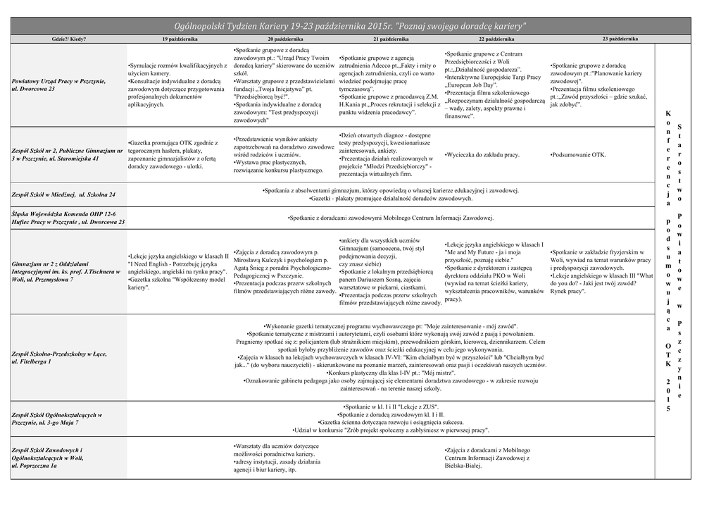 Ogólnopolski Tydzien Kariery 19-23 października 2015r. "Poznaj swojego doradcę kariery" Gdzie?/ Kiedy? Powiatowy Urząd Pracy w Pszczynie, ul. Dworcowa 23 19 października •Symulacje rozmów kwalifikacyjnych z użyciem kamery. •Konsultacje indywidualne z doradcą zawodowym dotyczące przygotowania profesjonalnych dokumentów aplikacyjnych. •Gazetka promująca OTK zgodnie z Zespół Szkół nr 2, Publiczne Gimnazjum nr tegorocznym hasłem, plakaty, 3 w Pszczynie, ul. Staromiejska 41 zapoznanie gimnazjalistów z ofertą doradcy zawodowego - ulotki. Zespół Szkół w Miedźnej, ul. Szkolna 24 Śląska Wojewódzka Komenda OHP 12-6 Hufiec Pracy w Pszczynie , ul. Dworcowa 23 Gimnazjum nr 2 z Oddziałami Integracyjnymi im. ks. prof. J.Tischnera w Woli, ul. Przemysłowa 7 Zespół Szkolno-Przedszkolny w Łące, ul. Fitelberga 1 Zespół Szkół Ogólnokształcących w Pszczynie, ul. 3-go Maja 7 Zespół Szkół Zawodowych i Ogólnokształcących w Woli, ul. Poprzeczna 1a 20 października 21 października •Spotkanie grupowe z doradcą zawodowym pt.: "Urząd Pracy Twoim doradcą kariery" skierowane do uczniów szkół. •Warsztaty grupowe z przedstawicielami fundacji „Twoja Inicjatywa” pt. "Przedsiębiorcą być!". •Spotkania indywidualne z doradcą zawodowym: "Test predyspozycji zawodowych" •Spotkanie grupowe z agencją zatrudnienia Adecco pt.„Fakty i mity o agencjach zatrudnienia, czyli co warto wiedzieć podejmując pracę tymczasową”. •Spotkanie grupowe z pracodawcą Z.M. H.Kania pt.„Proces rekrutacji i selekcji z punktu widzenia pracodawcy”. •Dzień otwartych diagnoz - dostępne •Przedstawienie wyników ankiety testy predyspozycji, kwestionariusze zapotrzebowań na doradztwo zawodowe zainteresowań, ankiety. wśród rodziców i uczniów. •Prezentacja działań realizowanych w •Wystawa prac plastycznych, projekcie "Młodzi Przedsiębiorczy" rozwiązanie konkursu plastycznego. prezentacja wirtualnych firm. 22 października •Spotkanie grupowe z Centrum Przedsiębiorczości z Woli pt.:„Działalność gospodarcza”. •Interaktywne Europejskie Targi Pracy „European Job Day”. •Prezentacja filmu szkoleniowego „Rozpoczynam działalność gospodarczą – wady, zalety, aspekty prawne i finansowe”. •Wycieczka do zakładu pracy. 23 października •Spotkanie grupowe z doradcą zawodowym pt.:"Planowanie kariery zawodowej". •Prezentacja filmu szkoleniowego pt.:„Zawód przyszłości – gdzie szukać, jak zdobyć”. •Podsumowanie OTK. •Spotkania z absolwentami gimnazjum, którzy opowiedzą o własnej karierze edukacyjnej i zawodowej. •Gazetki - plakaty promujące działalność doradców zawodowych. •Spotkanie z doradcami zawodowymi Mobilnego Centrum Informacji Zawodowej. •ankiety dla wszystkich uczniów Gimnazjum (samoocena, twój styl •Zajęcia z doradcą zawodowym p. •Lekcje języka angielskiego w klasach II podejmowania decyzji, Mirosławą Kulczyk i psychologiem p. "I Need English - Potrzebuję języka czy znasz siebie) Agatą Śnieg z poradni Psychologicznoangielskiego, angielski na rynku pracy". •Spotkanie z lokalnym przedsiębiorcą Pedagogicznej w Pszczynie. •Gazetka szkolna "Współczesny model panem Dariuszem Sosną, zajęcia •Prezentacja podczas przerw szkolnych kariery". warsztatowe w piekarni, ciastkarni. filmów przedstawiających różne zawody. •Prezentacja podczas przerw szkolnych filmów przedstawiających różne zawody. •Lekcje języka angielskiego w klasach I "Me and My Future - ja i moja przyszłość, poznaję siebie." •Spotkanie z dyrektorem i zastępcą dyrektora oddziału PKO w Woli (wywiad na temat ścieżki kariery, wykształcenia pracowników, warunków pracy). •Wykonanie gazetki tematycznej programu wychowawczego pt: "Moje zainteresowanie - mój zawód". •Spotkanie tematyczne z mistrzami i autorytetami, czyli osobami które wykonują swój zawód z pasją i powołaniem. Pragniemy spotkać się z: policjantem (lub strażnikiem miejskim), przewodnikiem górskim, kierowcą, dziennikarzem. Celem spotkań byłoby przybliżenie zawodów oraz ścieżki edukacyjnej w celu jego wykonywania. •Zajęcia w klasach na lekcjach wychowawczych w klasach IV-VI: "Kim chciałbym być w przyszłości" lub "Chciałbym być jak..." (do wyboru nauczycieli) - ukierunkowane na poznanie marzeń, zainteresowań oraz pasji i oczekiwań naszych uczniów. •Konkurs plastyczny dla klas I-IV pt.: "Mój mistrz". •Oznakowanie gabinetu pedagoga jako osoby zajmującej się elementami doradztwa zawodowego - w zakresie rozwoju zainteresowań - na terenie naszej szkoły. •Spotkanie w kl. I i II "Lekcje z ZUS". •Spotkanie z doradcą zawodowym kl. I i II. •Gazetka ścienna dotycząca rozwoju i osiągnięcia sukcesu. •Udział w konkursie "Zrób projekt społeczny a zabłyśniesz w pierwszej pracy". •Warsztaty dla uczniów dotyczące możliwości poradnictwa kariery. •adresy instytucji, zasady działania agencji i biur kariery, itp. •Zajęcia z doradcami z Mobilnego Centrum Informacji Zawodowej z Bielska-Białej. •Spotkanie w zakładzie fryzjerskim w Woli, wywiad na temat warunków pracy i predyspozycji zawodowych. •Lekcje angielskiego w klasach III "What do you do? - Jaki jest twój zawód? Rynek pracy". K o n f e r e n c j a p o d s u m o w u j ą c a S t a r o s t w o P o w i a t o w e w P s z O c T z K y n 2 i 0 e 1 5 Ogólnopolski Tydzien Kariery 19-23 października 2015r. "Poznaj swojego doradcę kariery" Gdzie?/ Kiedy? 19 października Powiatowy Zespół Szkół nr 1 im. Gen. Józefa Bema w Pszczynie, ul. Poniatowskiego 2 •Gazetka tematyczna dotycząca doradztwa zawodowego "Twój doradca kariery". •Spotkania z doradcami z Mobilnego Centrum Doradztwa Zawodowego. Zespół Szkół nr 1 w Pszczynie, ul. Kazimierza Wilekiego 5 •Lekcje/warsztaty dla uczniów klas III gimnazjum "Co dalej gimnazjalisto?" •wyjaśnienie uczniom czym zajmuje się doradca zawodowy. •Pomoc w określaniu obszaru zainter