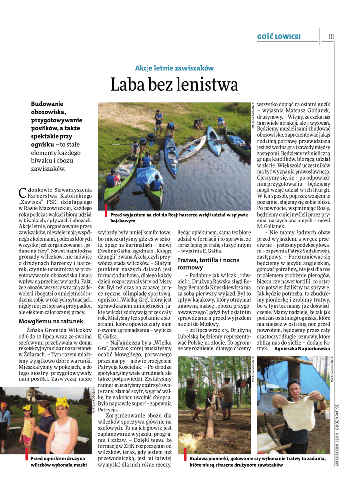 GOŚĆ ŁOWICKI III Akcje letnie zawiszaków Laba bez lenistwa C złonkowie Stowarzyszenia Harcerstwa Katolickiego „Zawisza” FSE, działającego w Rawie Mazowieckiej, każdego roku podczas wakacji biorą udział w biwakach, spływach i obozach. Akcje letnie, organizowane przez zawiszaków, niewiele mają wspólnego z koloniami, podczas których wszystko jest zorganizowane i „podane na tacy”. Nawet najmłodsze gromady wilczków, nie mówiąc o drużynach harcerzy i harcerek, czynnie uczestniczą w przygotowywaniu obozowiska i mają wpływ na przebieg wyjazdu. Fakt, że z obozów wszyscy wracają zadowoleni i bogatsi o umiejętność radzenia sobie w różnych sytuacjach, nigdy nie jest sprawą przypadku, ale efektem całorocznej pracy. Przed wyjazdem na zlot do Rosji harcerze wzięli udział w spływie kajakowym Przed ogniskiem drużyna wilczków wykonała maski Tratwa, tortilla i nocne rozmowy – Podobnie jak wilczki, również 1. Drużyna Rawska sługi Bożego Bernarda Kryszkiewicza ma za sobą pierwszy wyjazd. Był to spływ kajakowy, który otrzymał umowną nazwę „obozu przygotowawczego”, gdyż był ostatnim sprawdzianem przed wyjazdem na zlot do Moskwy. – 22 lipca wraz z 3. Drużyną Lubelską będziemy reprezentować Polskę na zlocie. To ogromne wyróżnienie, dlatego chcemy Budowa pionierki, gotowanie czy wykonanie tratwy to zadania, które nie są straszne drużynom zawiszaków 26 LIPCA 2009 GOŚĆ NIEDZIELNY PATRYCJA KOŚCIELAK Żeńska Gromada Wilczków od 6 do 10 lipca wraz ze swoimi szefowymi przebywała w domu rekolekcyjnym sióstr nazaretanek w Żdżarach. – Tym razem miałyśmy wyjątkowo dobre warunki. Mieszkałyśmy w pokojach, a do tego siostry przygotowywały nam posiłki. Zazwyczaj nasze Będąc opiekunem, sama też biorę udział w formacji i to sprawia, że coraz lepiej potrafię służyć innym – wyjaśnia E. Gałka. MATEUSZ GOLIANEK Mowgliemu na ratunek wyjazdy były mniej komfortowe, bo mieszkałyśmy gdzieś w szkole, śpiąc na karimatach – mówi Ewelina Gałka, zgodnie z „Księgą dżungli” zwana Akelą, czyli przywódcą stada wilczków. – Stałym punktem naszych działań jest formacja duchowa, dlatego każdy dzień rozpoczynałyśmy od Mszy św. Był też czas na zabawę, prace ręczne, olimpiadę sportową, ognisko i „Wielką Grę”, która jest sprawdzianem umiejętności, jakie wilczki zdobywają przez cały rok. Miałyśmy też spotkanie z siostrami, które opowiedziały nam o swoim zgromadzeniu – wylicza E. Gałka. – Najfajniejsza była „Wielka Gra”, podczas której musiałyśmy ocalić Mowgliego, porwanego przez małpy – mówi z przejęciem Patrycja Kościelak. – Po drodze spotykałyśmy wiele utrudnień, ale także podpowiedzi. Zostałyśmy ranne i musiałyśmy opatrzyć swoje rany, złamać szyfr, wygrać walkę, by na końcu uwolnić chłopca. Było naprawdę super! – zapewnia Patrycja. Zorganizowanie obozu dla wilczków spoczywa głównie na szefowych. To na ich głowie jest zaplanowanie wyjazdu, programu i zabaw. – Dzięki temu, że formację w ZHK rozpoczęłam od wilczków, teraz, gdy jestem już przewodniczką, jest mi łatwiej wymyślać dla nich różne rzeczy. wszystko dopiąć na ostatni guzik – wyjaśnia Mateusz Golianek, drużynowy. – Wiemy, że czeka nas tam wiele atrakcji, ale i wyzwań. Będziemy musieli sami zbudować obozowisko, zaprezentować jakąś rodzimą potrawę, przewidziana jest też wodna gra i zawody między zastępami. Będziemy też nieliczną grupą katolików, biorącą udział w zlocie. Większość uczestników ma być wyznania prawosławnego. Cieszymy się, że – po odpowiednim przygotowaniu – będziemy mogli wziąć udział w ich liturgii. W ten sposób, poprzez wzajemne poznanie, stajemy się sobie bliżsi. Po powrocie, wspminając Rosję, będziemy o niej myśleli przez pryzmat naszych znajomych – mówi M. Golianek. – Nie mamy żadnych obaw przed wyjazdem, a wręcz przeciwnie – jesteśmy podekscytowani – zapewnia Patryk Sudakowski, zastępowy. – Porozumiewać się będziemy w języku angielskim, gotować potrafimy, nie jest dla nas problemem zrobienie pierogów, bigosu czy nawet tortilli, co ostatnio potwierdziliśmy na spływie. Jak będzie potrzeba, to zbudujemy pionierkę i zrobimy tratwy, bo w tym też mamy już doświadczenie. Mamy nadzieję, że tak jak podczas ostatniego ogniska, które ma miejsce w ostatnią noc przed powrotem, będziemy przez cały czas toczyć długie rozmowy, które zbliżą nas do siebie – dodaje Patryk. Agnieszka Napiórkowska MATEUSZ GOLIANEK MATEUSZ GOLIANEK Budowanie obozowiska, przygotowywanie posiłków, a także spektakle przy ognisku – to stałe elementy każdego biwaku i obozu zawiszaków.