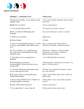 Dialogue 1 – elementary level Tłumaczenie Friend: Hi, I’m Robin, we are going to work together today. Cześć, jestem Robin, będziemy dzisiaj razem pracować. David: Hi, I’m David. Cześć, jestem Dawid. F: Is it your first day at work? To twój pierwszy dzień w pracy? D: No, I worked on Wednesday and Thursday. Nie, pracowałem już w środę i czwartek. F: Where are you from? Skąd jesteś? D: From Poland. Z Polski. F: Ooo it’s a an interesting country, I’ve been to Cracow and Gdańsk. And where do you live? Ooo to ciekawy kraj, byłem kiedyś w Krakowie i Gdańsku. A gdzie mieszkasz? D: I live in Olesno, it’s a small but nice town, but Cracow and Gdańsk are really beautiful cities. Mieszkam w Oleśnie, to małe ale ładne miasteczko, ale Kraków i Gdańsk to faktycznie piękne miasta. F: And where are you staying here in Holland? A tu w Holandii gdzie mieszkasz? D: In Rotterdam, in worker’s accommodation. Where and who are you staying with? W Rotterdamie, w hotelu pracowniczym. A ty gdzie i z kim mieszkasz? F: In a small village near Rotterdam. How are you enjoying your stay? W małej wiosce blisko Rotterdamu. A jak ci się u nas mieszka? D: It’s nice. There is a shop, park and a football pitch nearby. Fajnie, mamy blisko sklep, park i boisko do piłki nożnej. F: Do you like football? So do I. Maybe we will play together sometime. Lubisz piłkę? Ja też, może kiedyś zagramy razem? D: Sure. What about tomorrow? Chętnie, może jutro? F: It’s a good idea. I’ve got a day off. Dobry pomysł, mam wolny dzień.
