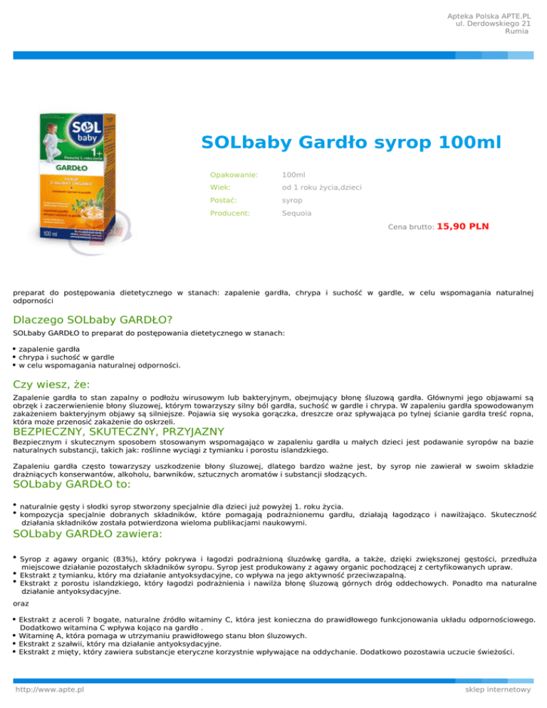 Apteka Polska APTE.PL ul. Derdowskiego 21 Rumia SOLbaby Gardło syrop 100ml Opakowanie: 100ml Wiek: od 1 roku życia,dzieci Postać: syrop Producent: Sequoia Cena brutto: 15,90 PLN preparat do postępowania dietetycznego w stanach: zapalenie gardła, chrypa i suchość w gardle, w celu wspomagania naturalnej odporności Dlaczego SOLbaby GARDŁO? SOLbaby GARDŁO to preparat do postępowania dietetycznego w stanach: zapalenie gardła chrypa i suchość w gardle w celu wspomagania naturalnej odporności. Czy wiesz, że: Zapalenie gardła to stan zapalny o podłożu wirusowym lub bakteryjnym, obejmujący błonę śluzową gardła. Głównymi jego objawami są obrzęk i zaczerwienienie błony śluzowej, którym towarzyszy silny ból gardła, suchość w gardle i chrypa. W zapaleniu gardła spowodowanym zakażeniem bakteryjnym objawy są silniejsze. Pojawia się wysoka gorączka, dreszcze oraz spływająca po tylnej ścianie gardła treść ropna, która może przenosić zakażenie do oskrzeli. BEZPIECZNY, SKUTECZNY, PRZYJAZNY Bezpiecznym i skutecznym sposobem stosowanym wspomagająco w zapaleniu gardła u małych dzieci jest podawanie syropów na bazie naturalnych substancji, takich jak: roślinne wyciągi z tymianku i porostu islandzkiego. Zapaleniu gardła często towarzyszy uszkodzenie błony śluzowej, dlatego bardzo ważne jest, by syrop nie zawierał w swoim składzie drażniących konserwantów, alkoholu, barwników, sztucznych aromatów i substancji słodzących. SOLbaby GARDŁO to: naturalnie gęsty i słodki syrop stworzony specjalnie dla dzieci już powyżej 1. roku życia. kompozycja specjalnie dobranych składników, które pomagają podrażnionemu gardłu, działają łagodząco i nawilżająco. Skuteczność działania składników została potwierdzona wieloma publikacjami naukowymi. SOLbaby GARDŁO zawiera: Syrop z agawy organic (83%), który pokrywa i łagodzi podrażnioną śluzówkę gardła, a także, dzięki zwiększonej gęstości, przedłuża miejscowe działanie pozostałych składników syropu. Syrop jest produkowany z agawy organic pochodzącej z certyfikowanych upraw. Ekstrakt z tymianku, który ma działanie antyoksydacyjne, co wpływa na jego aktywność przeciwzapalną. Ekstrakt z porostu islandzkiego, który łagodzi podrażnienia i nawilża błonę śluzową górnych dróg oddechowych. Ponadto ma naturalne działanie antyoksydacyjne. oraz Ekstrakt z aceroli ? bogate, naturalne źródło witaminy C, która jest konieczna do prawidłowego funkcjonowania układu odpornościowego. Dodatkowo witamina C wpływa kojąco na gardło . Witaminę A, która pomaga w utrzymaniu prawidłowego stanu błon śluzowych. Ekstrakt z szałwii, który ma działanie antyoksydacyjne. Ekstrakt z mięty, który zawiera substancje eteryczne korzystnie wpływające na oddychanie. Dodatkowo pozostawia uczucie świeżości. http://www.apte.pl sklep internetowy Apteka Polska APTE.PL ul. Derdowskiego 21 Rumia ZALECANA DZIENNA PORCJA: 2,5 ml 3-4 razy dziennie. W zależności od indywidualnego zapotrzebowania lekarz może wskazać inną porcję do dziennego spożycia. SPOSÓB UŻYCIA: Wstrząsnąć przed użyciem. Syrop należy spożyć bezpośrednio doustnie. Nie należy mieszać preparatu z innymi płynami. Nie należy popijać bezpośrednio po spożyciu. Do produktu dołączona jest strzykawka pozwalająca na precyzyjne podawanie syropu. Jeżeli zapaleniu gardła towarzyszy kaszel można dodatkowo przyjmować syrop SOLbaby TUSSI. Podawanie syropów SOLbaby GARDŁO i SOLbaby TUSSI należy stosować w odstępie co najmniej 30 minut. SKŁAD: Syrop z agawy (83%), ekstrakt z porostu islandzkiego, ekstrakt z szałwii, ekstrakt z tymianku, witamina A, ekstrakt z aceroli (witamina C), ekstrakt z mięty pieprzowej, rozmaryn. http://www.apte.pl sklep internetowy