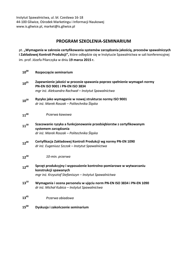 Instytut Spawalnictwa, ul. bł. Czesława 16-18 44-100 Gliwice, Ośrodek Marketingu i Informacji Naukowej www.is.gliwice.pl, [email protected] PROGRAM SZKOLENIA-SEMINARIUM pt. „Wymagania w zakresie certyfikowania systemów zarządzania jakością, procesów spawalniczych i Zakładowej Kontroli Produkcji”, które odbędzie się w Instytucie Spawalnictwa w sali konferencyjnej im. prof. Józefa Pilarczyka w dniu 19 marca 2015 r. 1000 Rozpoczęcie seminarium 1005 Zapewnienie jakości w procesie spawania poprzez spełnienie wymagań normy PN-EN ISO 9001 i PN-EN ISO 3834 mgr inż. Aleksandra Rachwał – Instytut Spawalnictwa 1030 Ryzyko jako wymaganie w nowej strukturze normy ISO 9001 dr inż. Marek Roszak – Politechnika Śląska 1100 Przerwa kawowa 1130 Szacowanie ryzyka a funkcjonowanie przedsiębiorstw z certyfikowanym systemem zarządzania dr inż. Marek Roszak – Politechnika Śląska 1200 Certyfikacja Zakładowej Kontroli Produkcji wg normy PN-EN 1090 dr inż. Eugeniusz Szczok – Instytut Spawalnictwa 1230 10-min. przerwa 1240 Sprzęt produkcyjny i wyposażenie kontrolno-pomiarowe w wytwarzaniu konstrukcji spawanych mgr inż. Krzysztof Stefaniszyn – Instytut Spawalnictwa 1310 Wymagania i ocena personelu w ujęciu norm PN-EN ISO 3834 i PN-EN 1090 dr inż. Michał Kubica – Instytut Spawalnictwa 1345 1500 Przerwa obiadowa Dyskusja i zakończenie seminarium
