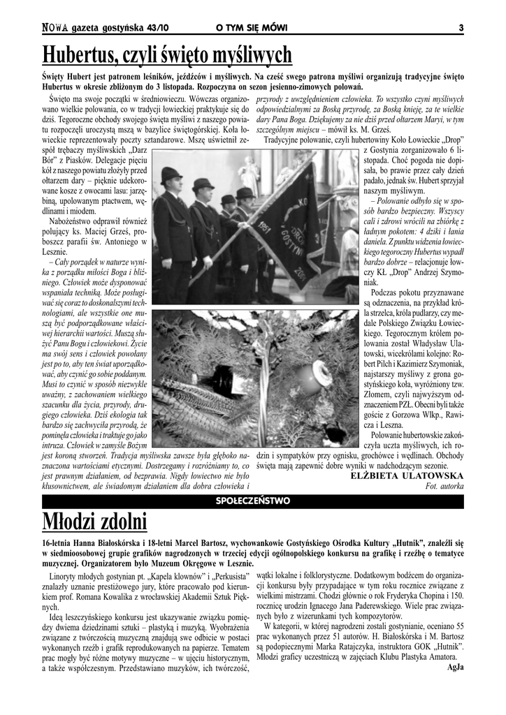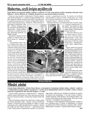 NOWA gazeta gostyñska 43/10 O TYM SIÊ MÓWI 3 Hubertus, czyli wiêto myliwych wiêty Hubert jest patronem leników, jedców i myliwych. Na czeæ swego patrona myliwi organizuj¹ tradycyjne wiêto Hubertus w okresie zbli¿onym do 3 listopada. Rozpoczyna on sezon jesienno-zimowych polowañ. wiêto ma swoje pocz¹tki w redniowieczu. Wówczas organizo- przyrody z uwzglêdnieniem cz³owieka. To wszystko czyni myliwych wano wielkie polowania, co w tradycji ³owieckiej praktykuje siê do odpowiedzialnymi za Bosk¹ przyrodê, za Bosk¹ kniejê, za te wielkie dzi. Tegoroczne obchody swojego wiêta myliwi z naszego powia- dary Pana Boga. Dziêkujemy za nie dzi przed o³tarzem Maryi, w tym tu rozpoczêli uroczyst¹ msz¹ w bazylice wiêtogórskiej. Ko³a ³o- szczególnym miejscu mówi³ ks. M. Grze. wieckie reprezentowa³y poczty sztandarowe. Mszê uwietni³ zeTradycyjne polowanie, czyli hubertowiny Ko³o £owieckie Drop spó³ trêbaczy myliwskich Darz z Gostynia zorganizowa³o 6 liBór z Piasków. Delegacje piêciu stopada. Choæ pogoda nie dopikó³ z naszego powiatu z³o¿y³y przed sa³a, bo prawie przez ca³y dzieñ o³tarzem dary piêknie udekoropada³o, jednak w. Hubert sprzyja³ wane kosze z owocami lasu: jarzênaszym myliwym. bin¹, upolowanym ptactwem, wê Polowanie odby³o siê w spodlinami i miodem. sób bardzo bezpieczny. Wszyscy Nabo¿eñstwo odprawi³ równie¿ cali i zdrowi wrócili na zbiórkê z poluj¹cy ks. Maciej Grze, pro³adnym pokotem: 4 dziki i ³ania boszcz parafii w. Antoniego w daniela. Z punktu widzenia ³owiecLesznie. kiego tegoroczny Hubertus wypad³ Ca³y porz¹dek w naturze wynibardzo dobrze relacjonuje ³owka z porz¹dku mi³oci Boga i bliczy K£ Drop Andrzej Szymoniego. Cz³owiek mo¿e dysponowaæ niak. wspania³a technik¹. Mo¿e pos³ugiPodczas pokotu przyznawane waæ siê coraz to doskonalszymi techs¹ odznaczenia, na przyk³ad krónologiami, ale wszystkie one mula strzelca, króla pudlarzy, czy mesz¹ byæ podporz¹dkowane w³acidale Polskiego Zwi¹zku £owiecwej hierarchii wartoci. Musz¹ s³ukiego. Tegorocznym królem po¿yæ Panu Bogu i cz³owiekowi. ¯ycie lowania zosta³ W³adys³aw Ulama swój sens i cz³owiek powo³any towski, wicekrólami kolejno: Rojest po to, aby ten wiat uporz¹dkobert Pilch i Kazimierz Szymoniak, waæ, aby czyniæ go sobie poddanym. najstarszy myliwy z grona goMusi to czyniæ w sposób niezwykle styñskiego ko³a, wyró¿niony tzw. uwa¿ny, z zachowaniem wielkiego Z³omem, czyli najwy¿szym odszacunku dla ¿ycia, przyrody, druznaczeniem PZ£. Obecni byli tak¿e giego cz³owieka. Dzi ekologia tak gocie z Gorzowa Wlkp., Rawibardzo siê zachwyci³a przyrod¹, ¿e cza i Leszna. pominê³a cz³owieka i traktuje go jako Polowanie hubertowskie zakoñintruza. Cz³owiek w zamyle Bo¿ym czy³a uczta myliwych, ich rojest koron¹ stworzeñ. Tradycja myliwska zawsze by³a g³êboko na- dzin i sympatyków przy ognisku, grochówce i wêdlinach. Obchody znaczona wartociami etycznymi. Dostrzegamy i rozró¿niamy to, co wiêta maj¹ zapewniæ dobre wyniki w nadchodz¹cym sezonie. EL¯BIETA ULATOWSKA jest prawnym dzia³aniem, od bezprawia. Nigdy ³owiectwo nie by³o Fot. autorka k³usownictwem, ale wiadomym dzia³aniem dla dobra cz³owieka i M³odzi zdolni SPO£ECZEÑSTWO 16-letnia Hanna Bia³oskórska i 18-letni Marcel Bartosz, wychowankowie Gostyñskiego Orodka Kultury Hutnik, znaleli siê w siedmioosobowej grupie grafików nagrodzonych w trzeciej edycji ogólnopolskiego konkursu na grafikê i rzebê o tematyce muzycznej. Organizatorem by³o Muzeum Okrêgowe w Lesznie. Linoryty m³odych gostynian pt. Kapela klownów i Perkusista w¹tki lokalne i folklorystyczne. Dodatkowym bodcem do organizaznalaz³y uznanie presti¿owego jury, które pracowa³o pod kierun- cji konkursu by³y przypadaj¹ce w tym roku rocznice zwi¹zane z kiem prof. Romana Kowalika z wroc³awskiej Akademii Sztuk Piêk- wielkimi mistrzami. Chodzi g³ównie o rok Fryderyka Chopina i 150. rocznicê urodzin Ignacego Jana Paderewskiego. Wiele prac zwi¹zanych. Ide¹ leszczyñskiego konkursu jest ukazywanie zwi¹zku pomiê- nych by³o z wizerunkami tych kompozytorów. W kategorii, w której nagrodzeni zostali gostynianie, oceniano 55 dzy dwiema dziedzinami sztuki plastyk¹ i muzyk¹. Wyobra¿enia zwi¹zane z twórczoci¹ muzyczn¹ znajduj¹ swe odbicie w postaci prac wykonanych przez 51 autorów. H. Bia³oskórska i M. Bartosz wykonanych rzeb i grafik reprodukowanych na papierze. Tematem s¹ podopiecznymi Marka Ratajczyka, instruktora GOK Hutnik. prac mog³y byæ ró¿ne motywy muzyczne w ujêciu historycznym, M³odzi graficy uczestnicz¹ w zajêciach Klubu Plastyka Amatora. AgJa a tak¿e wspó³czesnym. Przedstawiano muzyków, ich twórczoæ,