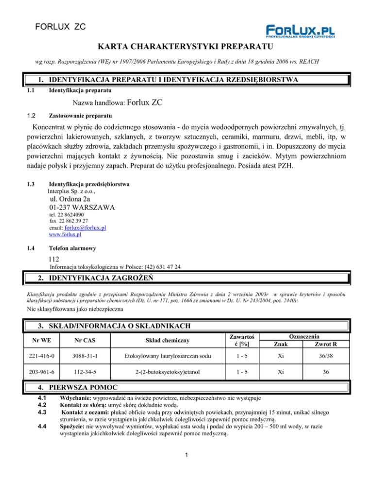 FORLUX ZC KARTA CHARAKTERYSTYKI PREPARATU wg rozp. Rozporządzenia (WE) nr 1907/2006 Parlamentu Europejskiego i Rady z dnia 18 grudnia 2006 ws. REACH 1. IDENTYFIKACJA PREPARATU I IDENTYFIKACJA RZEDSIĘBIORSTWA 1.1 Identyfikacja preparatu Nazwa handlowa: Forlux ZC 1.2 Zastosowanie preparatu Koncentrat w płynie do codziennego stosowania - do mycia wodoodpornych powierzchni zmywalnych, tj. powierzchni lakierowanych, szklanych, z tworzyw sztucznych, ceramiki, marmuru, drzwi, mebli, itp, w placówkach służby zdrowia, zakładach przemysłu spożywczego i gastronomii, i in. Dopuszczony do mycia powierzchni mających kontakt z żywnością. Nie pozostawia smug i zacieków. Mytym powierzchniom nadaje połysk i przyjemny zapach. Preparat do użytku profesjonalnego. Posiada atest PZH. 1.3 Identyfikacja przedsiębiorstwa Interplus Sp. z o.o., ul. Ordona 2a 01-237 WARSZAWA tel. 22 8624090 fax 22 862 39 27 email: [email protected] www.forlux.pl 1.4 Telefon alarmowy 112 Informacja toksykologiczna w Polsce: (42) 631 47 24 2. IDENTYFIKACJA ZAGROŻEŃ Klasyfikacja produktu zgodnie z przepisami Rozporządzenia Ministra Zdrowia z dnia 2 września 2003r w sprawie kryteriów i sposobu klasyfikacji substancji i preparatów chemicznych (Dz. U. nr 171, poz. 1666 ze zmianami w Dz. U. Nr 243/2004, poz. 2440): Nie sklasyfikowana jako niebezpieczna 3. SKŁAD/INFORMACJA O SKŁADNIKACH Oznaczenia Zwrot R Nr WE Nr CAS Skład chemiczny Zawartoś ć [%] Znak 221-416-0 3088-31-1 Etoksylowany laurylosiarczan sodu 1-5 Xi 36/38 203-961-6 112-34-5 2-(2-butoksyetoksy)etanol 1-5 Xi 36 4. PIERWSZA POMOC 4.1 4.2 4.3 4.4 Wdychanie: wyprowadzić na świeże powietrze, niebezpieczeństwo nie występuje Kontakt ze skórą: umyć skórę dokładnie wodą. Kontakt z oczami: płukać obficie wodą przy odwiniętych powiekach, przynajmniej 15 minut, unikać silnego strumienia, w razie wystąpienia jakichkolwiek dolegliwości zapewnić pomoc medyczną. Spożycie: nie wywoływać wymiotów, wypłukać usta wodą i podać do wypicia 200 – 500 ml wody, w razie wystąpienia jakichkolwiek dolegliwości zapewnić pomoc medyczną. 1 FORLUX ZC KARTA CHARAKTERYSTYKI PREPARATU 5. POSTĘPOWANIE W PRZYPADKU POŻARU 5.1 5.2 5.3 5.4 5.5 Zalecane środki gaśnicze: pożary w obecności produktu gasić środkami gaśniczymi odpowiednimi dla palących się materiałów Nieodpowiednie środki gaśnicze: nie stosować silnego strumienia wody Szczególne zagrożenie ze strony produktów spalania i wydzielających się gazów: niebezpieczne produkty rozkładu patrz pkt 10 Specjalne wyposażenie ochronne strażaków: stosować standardowe wyposażenie ochronne Inne informacje: Produkt niepalny. Zagrożone pojemniki chłodzić rozpyloną wodą. 6. POSTĘPOWANIE W PRZYPADKU NIEZAMIERZONEGO UWOLNIENIA DO ŚRODOWISKA 6.1 6.2 Indywidualne środki ochrony osobistej: Używać środki ochrony indywidualnej, patrz punkt 8 Środki ostrożności w zakresie ochrony środowiska: nieznane 6.3 Metody oczyszczania/usuwania: Powstrzymać wyciek. Rozlany produkt posypać odpowiednim materiałem pochłaniającym (piasek, ziemia) i zebrać mechanicznie do szczelnie zamykanego pojemnika na odpady. Spłukać powierzchnię wodą. 7. POSTĘPOWANIE Z PREPARATEM I JEGO MAGAZYNOWANIE 7.1 7.2 Postępowanie z preparatem: Przestrzegać zasad i przepisów BHP w zakresie postępowania z chemikaliami. W celu ochrony osobistej patrz punkt 8. Magazynowanie: Preparat przechowywać w suchym miejscu, w oryginalnym, szczelnie zamkniętym opakowaniu. 8. KONTROLA NARAŻENIA I ŚRODKI OCHRONY INDYWIDUALNEJ Kontrola narażenia: wg Rozporządzenie MPiPS z dnia 29 listopada 2002r w sprawie dopuszczalnych stężeń i natężeń czynników szkodliwych dla zdrowia w środowisku pracy (Dz. U. Nr 217/2002r, poz. 1833 ze zmianami w Dz. U. z 2005r. nr.212, poz.1769, Dz. U. Nr 161, poz. 1142, 2007) Środki ochrony indywidualnej: • Myć ręce przed każdą przerwą i po zakończeniu pracy, • W miejscu pracy nie jeść, nie pić, nie palić tytoniu, • • • • Ochrona dróg oddechowych: nie jest potrzebna w warunkach odpowiedniej wentylacji. Ochrona oczu: brak szczególnych wymagań Ochrona rąk: brak szczególnych wymagań Ochrona skóry i ciała: lekka odzież ochronna Zalecenia dotyczące procedury monitoringu zawartości składników niebezpiecznych – metodyka pomiarów: • PN ISO 4225/Ak:1999 Jakość powietrza – Zagadnienia ogólne – Terminologia (arkusz krajowy). • PN Z-04008-7:2002. Ochrona czystości powietrza. Pobieranie próbek. Zasady pobierania próbek powietrza w środowisku pracy i interpretacji wyników. • PN-EN-689:2002. Powietrze na stanowiskach pracy – Wytyczne oceny narażenia inhalacyjnego na czynniki chemiczne przez porównanie z wartościami dopuszczalnymi i strategia pomiarowa. • PN-EN-482:2002. Powietrze na stanowiskach pracy – Ogólne wymagania dotyczące procedur pomiaru czynników chemicznych. Wymagania zasadnicze dla środków ochrony indywidualnej określa Rozporządzenie Ministra Gospodarki z dnia 21 grudnia 2005 r. w sprawie zasadniczych wymagań dla środków ochrony indywidualnej Dz. U. Nr 259 poz. 2173) Pracodawca jest zobowiązany zapewnić, aby stosowane środki ochrony indywidualnej oraz odzież i obuwie robocze posiadały właściwości ochronne i użytkowe oraz zapewnić odpowiednie ich pranie, konserwację, naprawę i odkażanie. Zalecane badania wstępne i okresowe pracowników narażonych na czynniki chemiczne są określone w Rozporządzeniu Ministra Zdrowia i 2 FORLUX ZC KARTA CHARAKTERYSTYKI PREPARATU Opieki Społecznej z dnia 30 maja 1996 roku w sprawie przeprowadzania badań lekarskich pracowników, zakresu profilaktycznej opieki zdrowotnej nad pracownikami oraz orzeczeń lekarskich wydawanych do celów przewidzianych w Kodeksie pracy (Dz.U. nr 69/1996, poz. 332, wraz z późniejszymi zmianami). 9. WŁAŚCIWOŚCI FIZYKOCHEMICZNE Postać Barwa Zapach Gęstość względna [kg/dm3] Rozpuszczalność w wodzie pH koncentratu ciecz niebieski 