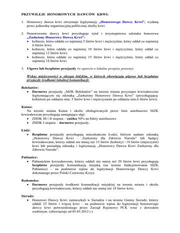 PRZYWILEJE HONOROWYCH DAWCÓW KRWI: 1. Honorowy dawca krwi otrzymuje legitymację „Honorowego Dawcy Krwi”, wydaną przez jednostkę organizacyjną publicznej służby krwi. 2. Honorowemu dawcy krwi przysługuje tytuł i trzystopniowa odznaka honorowa „Zasłużony Honorowy Dawca Krwi”: kobiecie, która oddała co najmniej 5 litrów krwi i mężczyźnie, który oddał co najmniej 6 litrów krwi; kobiecie, która oddała co najmniej 10 litrów krwi i mężczyźnie, który oddał co najmniej 12 litrów krwi; kobiecie, która oddała co najmniej 15 litrów krwi i mężczyźnie, który oddał co najmniej 18 litrów krwi. 3. Ulgowe lub bezpłatne przejazdy (w oparciu o lokalne przepisy prawne). Wykaz miejscowości w okręgu łódzkim, w których obowiązują ulgowe lub bezpłatne przejazdy środkami lokalnej komunikacji: Bełchatów: Darmowe przejazdy „MZK Bełchatów” na terenie miasta przyznano krwiodawcom legitymującym się odznaką „Zasłużony Honorowy Dawca Krwi” (przysługującą: kobietom po oddaniu min. 5 litrów krwi i mężczyznom po oddaniu min.6 litrów krwi). Kutno: Na terenie miasta Kutna i okolic obsługiwanych przez linie autobusowe MZK krwiodawcom przysługują następujące ulgi: ZHDK III i II stopnia – zniżka 50% na bilety autobusowe ZHDK I stopnia – darmowe przejazdy. Łódź: Bezpłatne przejazdy przysługują mieszkańcom Łodzi, którym nadano odznakę „Honorowy Dawca Krwi – Zasłużony dla Zdrowia Narodu” lub będący krwiodawcami, którzy oddali nie mniej niż 15 litrów (kobiety) / 18 litrów (mężczyźni) krwi lub posiadają odznakę i legitymację „Honorowy Dawca Krwi Zasłużony dla Zdrowia Narodu”. Pabianice: Pabianickim krwiodawcom, którzy oddali nie mniej niż 20 litrów krwi przysługują bezpłatne przejazdy komunikacją miejską (na terenie funkcjonowania MZK Pabianice) – na podstawie wpisu do legitymacji Honorowego Dawcy Krwi dokonanego przez Polski Czerwony Krzyż. Radomsko: Darmowe przejazdy środkami komunikacji miejskiej na terenie miasta i okolic przysługują krwiodawcom, którzy oddali nie mniej niż 18 litrów krwi. Sieradz: Honorowi Dawcy Krwi zamieszkali w Sieradzu i na terenie Gminy Sieradz, którzy oddali 25 litrów i więcej krwi – na podstawie wpisu do legitymacji honorowego dawcy krwi potwierdzonego przez Zarząd Rejonowy PCK wraz z dowodem osobistym. (obowiązuje od 03.05.2012 r.) Zgierz: Uprawnienia do bezpłatnych przejazdów przysługują osobom wyróżnionym Tytułem Honorowym „Zgierski Dawca Krwi”. Uprawnienia do korzystania z biletów ulgowych przysługują Zasłużonym Honorowym Dawcą Krwi – mieszkańcom Zgierza, posiadającym odznakę ZHDK I stopnia na podstawie imiennej legitymacji. Zduńska Wola Do bezpłatnych przejazdów środkami komunikacji miejskiej – Zduńska Wola uprawnienie są (od 31 marca 2011 r.) Zasłużeni Honorowi Dawcy Krwi zamieszkali w Zduńskiej Woli, którzy oddali 25 l krwi – na podstawie wpisu do legitymacji honorowego dawcy krwi potwierdzonego przez Zarząd Rejonowy PCK w Zduńskiej Woli wraz z dowodem osobistym. Żychlin: Honorowi Dawcy Krwi są upoważnieni do: bezpłatnych przejazdów komunikacją miejską - dla ZHDK I stopnia ulgowych, 50 % przejazdów komunikacją miejską - dla ZHDK II i III stopnia. 4. Zwolnienie od pracy w dniu, w którym oddaje krew i na czas okresowego badania lekarskiego dawców krwi. 5. Uprawnienia do korzystania poza kolejnością z ambulatoryjnej opieki zdrowotnej w ramach ubezpieczenia zdrowotnego i usług farmaceutycznych udzielanych w aptekach. 6. Zniżki na niektóre leki.
