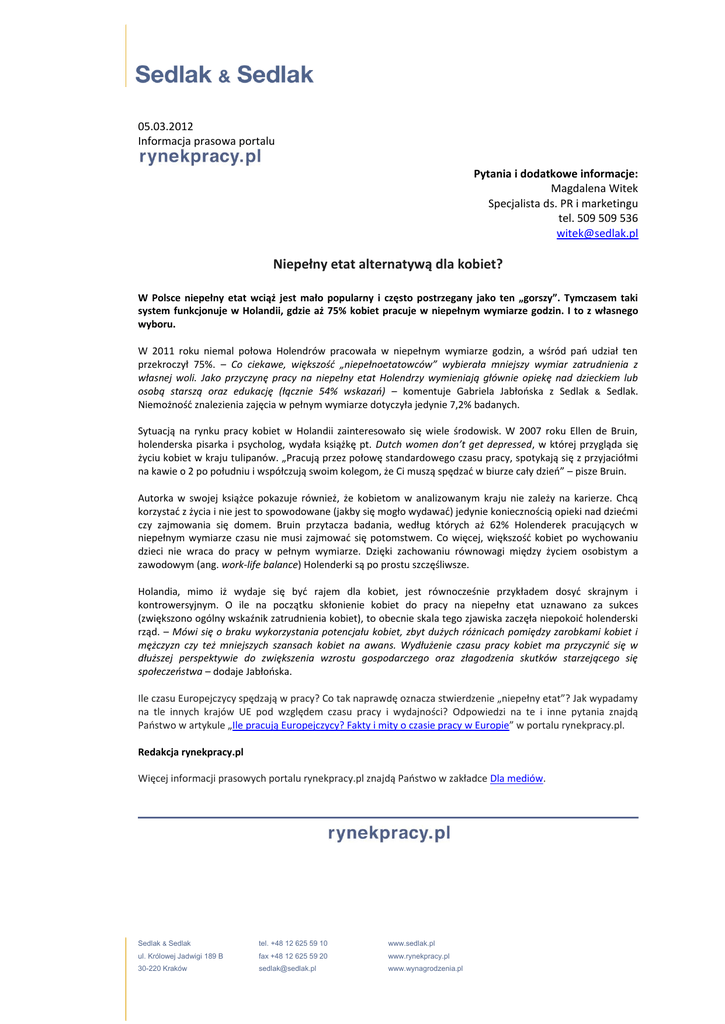 05.03.2012 Informacja prasowa portalu Pytania i dodatkowe informacje: Magdalena Witek Specjalista ds. PR i marketingu tel. 509 509 536 [email protected] Niepełny etat alternatywą dla kobiet? W Polsce niepełny etat wciąż jest mało popularny i często postrzegany jako ten „gorszy”. Tymczasem taki system funkcjonuje w Holandii, gdzie aż 75% kobiet pracuje w niepełnym wymiarze godzin. I to z własnego wyboru. W 2011 roku niemal połowa Holendrów pracowała w niepełnym wymiarze godzin, a wśród pań udział ten przekroczył 75%. – Co ciekawe, większość „niepełnoetatowców” wybierała mniejszy wymiar zatrudnienia z własnej woli. Jako przyczynę pracy na niepełny etat Holendrzy wymieniają głównie opiekę nad dzieckiem lub osobą starszą oraz edukację (łącznie 54% wskazań) – komentuje Gabriela Jabłońska z Sedlak & Sedlak. Niemożność znalezienia zajęcia w pełnym wymiarze dotyczyła jedynie 7,2% badanych. Sytuacją na rynku pracy kobiet w Holandii zainteresowało się wiele środowisk. W 2007 roku Ellen de Bruin, holenderska pisarka i psycholog, wydała książkę pt. Dutch women don’t get depressed, w której przygląda się życiu kobiet w kraju tulipanów. „Pracują przez połowę standardowego czasu pracy, spotykają się z przyjaciółmi na kawie o 2 po południu i współczują swoim kolegom, że Ci muszą spędzać w biurze cały dzień” – pisze Bruin. Autorka w swojej książce pokazuje również, że kobietom w analizowanym kraju nie zależy na karierze. Chcą korzystać z życia i nie jest to spowodowane (jakby się mogło wydawać) jedynie koniecznością opieki nad dziećmi czy zajmowania się domem. Bruin przytacza badania, według których aż 62% Holenderek pracujących w niepełnym wymiarze czasu nie musi zajmować się potomstwem. Co więcej, większość kobiet po wychowaniu dzieci nie wraca do pracy w pełnym wymiarze. Dzięki zachowaniu równowagi między życiem osobistym a zawodowym (ang. work-life balance) Holenderki są po prostu szczęśliwsze. Holandia, mimo iż wydaje się być rajem dla kobiet, jest równocześnie przykładem dosyć skrajnym i kontrowersyjnym. O ile na początku skłonienie kobiet do pracy na niepełny etat uznawano za sukces (zwiększono ogólny wskaźnik zatrudnienia kobiet), to obecnie skala tego zjawiska zaczęła niepokoić holenderski rząd. – Mówi się o braku wykorzystania potencjału kobiet, zbyt dużych różnicach pomiędzy zarobkami kobiet i mężczyzn czy też mniejszych szansach kobiet na awans. Wydłużenie czasu pracy kobiet ma przyczynić się w dłuższej perspektywie do zwiększenia wzrostu gospodarczego oraz złagodzenia skutków starzejącego się społeczeństwa – dodaje Jabłońska. Ile czasu Europejczycy spędzają w pracy? Co tak naprawdę oznacza stwierdzenie „niepełny etat”? Jak wypadamy na tle innych krajów UE pod względem czasu pracy i wydajności? Odpowiedzi na te i inne pytania znajdą Państwo w artykule „Ile pracują Europejczycy? Fakty i mity o czasie pracy w Europie” w portalu rynekpracy.pl. Redakcja rynekpracy.pl Więcej informacji prasowych portalu rynekpracy.pl znajdą Państwo w zakładce Dla mediów. Sedlak & Sedlak tel. +48 12 625 59 10 www.sedlak.pl ul. Królowej Jadwigi 189 B fax +48 12 625 59 20 www.rynekpracy.pl 30-220 Kraków [email protected] www.wynagrodzenia.pl