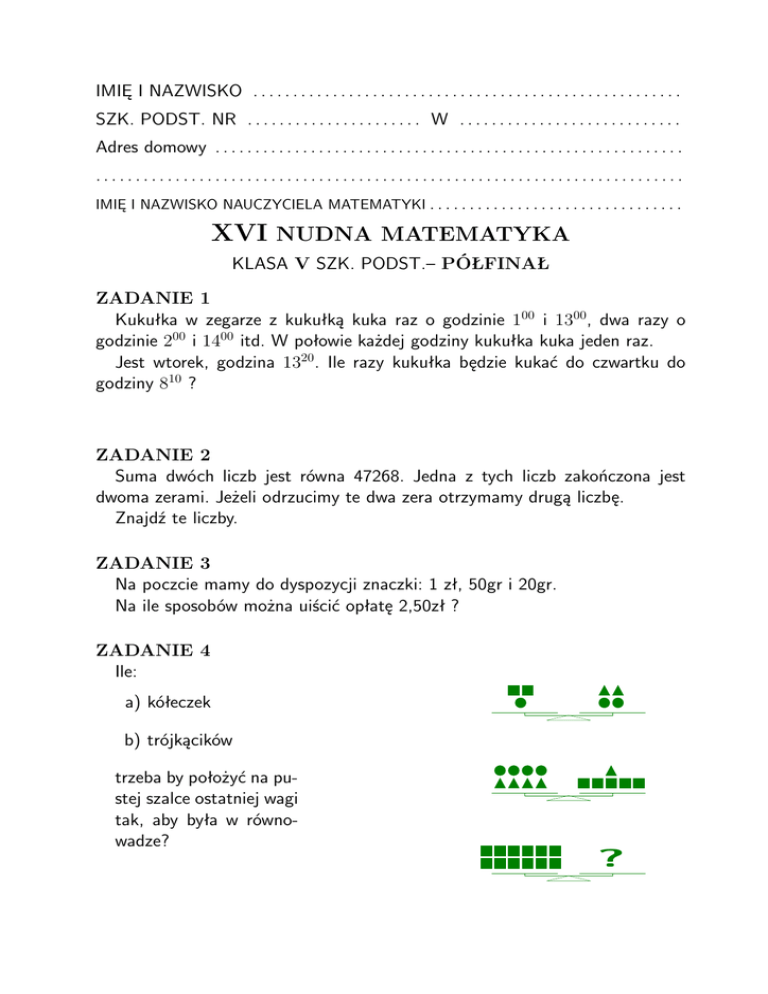 IMIĘ I NAZWISKO . . . . . . . . . . . . . . . . . . . . . . . . . . . . . . . . . . . . . . . . . . . . . . . . . . . . . . SZK. PODST. NR . . . . . . . . . . . . . . . . . . . . . . W . . . . . . . . . . . . . . . . . . . . . . . . . . . . Adres domowy . . . . . . . . . . . . . . . . . . . . . . . . . . . . . . . . . . . . . . . . . . . . . . . . . . . . . . . . . . . .......................................................................... IMIĘ I NAZWISKO NAUCZYCIELA MATEMATYKI . . . . . . . . . . . . . . . . . . . . . . . . . . . . . . . . XVI NUDNA MATEMATYKA KLASA V SZK. PODST.– PÓŁFINAŁ ZADANIE 1 Kukułka w zegarze z kukułką kuka raz o godzinie 100 i 1300, dwa razy o godzinie 200 i 1400 itd. W połowie każdej godziny kukułka kuka jeden raz. Jest wtorek, godzina 1320. Ile razy kukułka będzie kukać do czwartku do godziny 810 ? ZADANIE 2 Suma dwóch liczb jest równa 47268. Jedna z tych liczb zakończona jest dwoma zerami. Jeżeli odrzucimy te dwa zera otrzymamy drugą liczbę. Znajdź te liczby. ZADANIE 3 Na poczcie mamy do dyspozycji znaczki: 1 zł, 50gr i 20gr. Na ile sposobów można uiścić opłatę 2,50zł ? ZADANIE 4 Ile: a) kółeczek b) trójkącików trzeba by położyć na pustej szalce ostatniej wagi tak, aby była w równowadze? ?