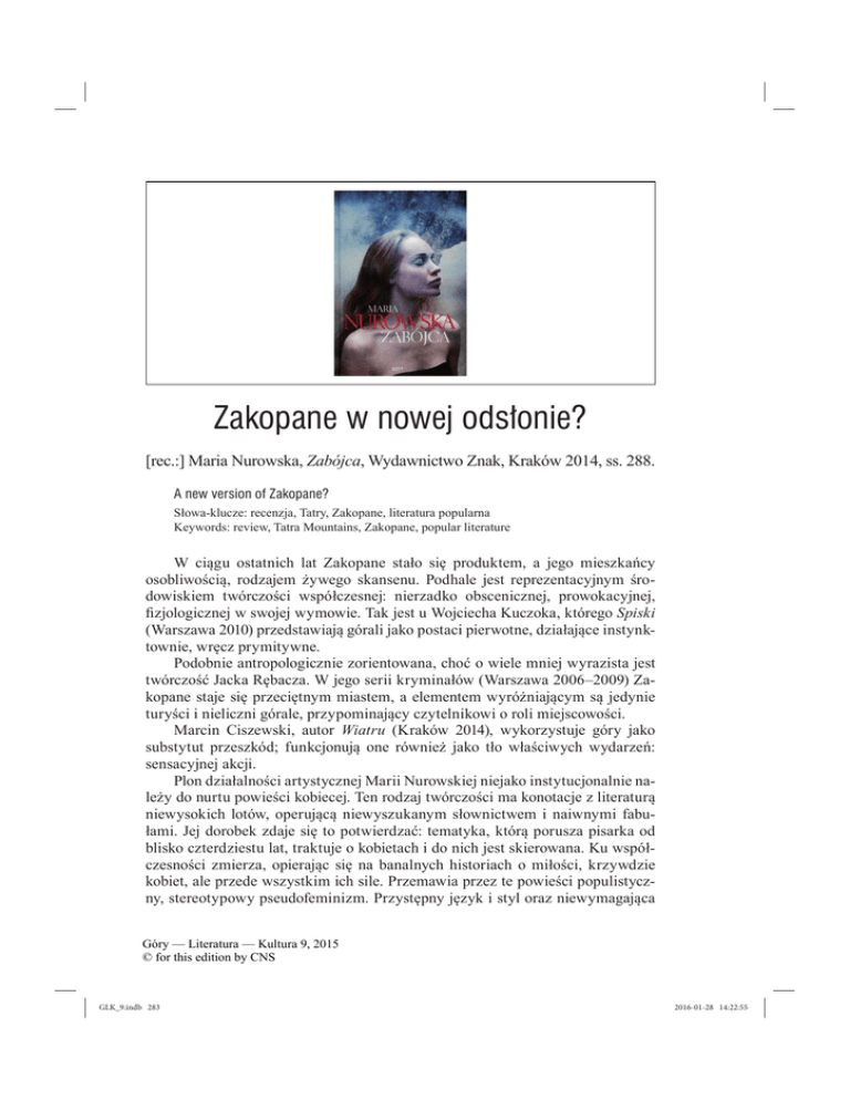 Zakopane w nowej odsłonie? [rec.:] Maria Nurowska, Zabójca, Wydawnictwo Znak, Kraków 2014, ss. 288. A new version of Zakopane? Słowa-klucze: recenzja, Tatry, Zakopane, literatura popularna Keywords: review, Tatra Mountains, Zakopane, popular literature W ciągu ostatnich lat Zakopane stało się produktem, a jego mieszkańcy osobliwością, rodzajem żywego skansenu. Podhale jest reprezentacyjnym środowiskiem twórczości współczesnej: nierzadko obscenicznej, prowokacyjnej, fizjologicznej w swojej wymowie. Tak jest u Wojciecha Kuczoka, którego Spiski (Warszawa 2010) przedstawiają górali jako postaci pierwotne, działające instynktownie, wręcz prymitywne. Podobnie antropologicznie zorientowana, choć o wiele mniej wyrazista jest twórczość Jacka Rębacza. W jego serii kryminałów (Warszawa 2006–2009) Zakopane staje się przeciętnym miastem, a elementem wyróżniającym są jedynie turyści i nieliczni górale, przypominający czytelnikowi o roli miejscowości. Marcin Ciszewski, autor Wiatru (Kraków 2014), wykorzystuje góry jako substytut przeszkód; funkcjonują one również jako tło właściwych wydarzeń: sensacyjnej akcji. Plon działalności artystycznej Marii Nurowskiej niejako instytucjonalnie należy do nurtu powieści kobiecej. Ten rodzaj twórczości ma konotacje z literaturą niewysokich lotów, operującą niewyszukanym słownictwem i naiwnymi fabułami. Jej dorobek zdaje się to potwierdzać: tematyka, którą porusza pisarka od blisko czterdziestu lat, traktuje o kobietach i do nich jest skierowana. Ku współczesności zmierza, opierając się na banalnych historiach o miłości, krzywdzie kobiet, ale przede wszystkim ich sile. Przemawia przez te powieści populistyczny, stereotypowy pseudofeminizm. Przystępny język i styl oraz niewymagająca Góry — Literatura — Kultura 9, 2015 © for this edition by CNS GLK_9.indb 283 2016-01-28 14:22:55 284 Recenzje tematyka przyniosły Nurowskiej uznanie wśród czytelników i zakwafilikowały ją do grona klasyków powieściopisarzy popularnych. Niedawne doświadczenia życiowe związały pisarkę z Podhalem, czego świadectwem jest jej autobiograficzny Księżyc nad Zakopanem (Warszawa 2012). Preludium tej tematyki w powieściach dostrzec można w dylogii Drzwi do piekła, Dom na krawędzi (Kraków 2012). Nurowska zwłaszcza ostatnimi czasy intensywnie wykorzystuje potencjał tkwiący w regionie podhalańskim. Dowodem tego jest niedawno wydany Zabójca (Kraków 2014), będący poniekąd sprawozdaniem z fascynacji kulturą góralską i tatrzańską przyrodą. Motywem powieści jest miłość warszawskiej dziennikarki, Joanny, i górala „z przeszłością”, Adama — co samo w sobie stanowi pretekst do diagnozy społeczności podhalańskiej: ich charakteru i zwyczajów. Główna bohaterka to osoba o silnym charakterze, niezależna i samodzielna, czym doskonale wpisuje się w model lansowany przez Nurowską w jej najbardziej popularnych powieściach. Samotna podróż do Zakopanego celem śledztwa dziennikarskiego staje się przyczynkiem do zdarzeń, które odmienią jej życie uczuciowe. Fascynacja tajemniczym mężczyzną w sile wieku zaczyna się już w drodze na Podhale; jej zainteresowanie spotyka się z obojętnością, co jednak staje się dla niej motywacją do bardziej ofensywnego działania ukierunkowanego na zgłębienie tajemnicy górala (rodzi się tu pasja zawodowa, a nie stricte romantyczna, co tym bardziej świadczy o wyemancypowaniu). Jej niezależność zostanie podkreślona w powieści nie raz: weźmie na swoje barki pomoc mężczyźnie, udając się aż za ocean, a jednocześnie godząc to z czasochłonną pracą zawodową. Męski bohater tymczasem, zgodnie z tendencją feministyczną, nie zdominuje powieści. Będzie opoką dla kobiety, ale jednocześnie człowiekiem wycofanym. To nie on jest najważniejszy i autorka nie pozwala czytelnikowi o tym zapomnieć. Zabójca jest powieścią typowo popularną, o czym świadczy przede wszystkim prosty i czytelny język oraz linearna struktura. Przez transparentne opisy i jasne wypowiedzi rodzi się z góry założona relacja między narratorem a czytelnikiem: wszystko jest dane, przeznaczone do literalnego odczytywania, nie zaś odkrywania. Brakuje tutaj ukrytych motywacji, symboliki czy nawet otwartego zakończenia. Jest to zatem powieść jednowymiarowa, której celem jest wyłącznie przyjemność czytelnicza. Zostaje tu wykorzystany ograny schemat narracyjny, polegający na odsłanianiu przeszłości i charakteru głównego bohatera przez prezentację wyimków z jego dziennika. Kolejnym motywem doskonale znanym, który w istotny sposób wpłynął przede wszystkim na rozwój literatury wysokoartystycznej, jest przemiana głównego bohatera. Porzuca on maskę tajemniczego samotnika i staje się zakochanym, nieco romantycznym nawet mężczyzną. Jak już wspomniano, przez dobór bohaterów i umieszczenie akcji w centrum społeczności góralskiej autorka narzuciła sobie zadanie zdiagnozowania współczesnej góralszczyzny, zarówno pod względem socjologicznym, jak i kulturowym. Diagnoza jest jednak chybiona, same założenia są bowiem bardzo stereotypowe. Góry — Literatura — Kultura 9, 2015 © for this edition by CNS GLK_9.indb 284 2016-01-28 14:22:56 Recenzje 285 Dowodzi tego scena rozmowy bohaterki z góralem ubranym w tradycyjny strój ludowy mimo dnia powszedniego. Zważywszy na realia kulturowe współczesnej góralszczyzny, sytuacja ta staje się groteskowa. Co więcej, w powieści wszyscy mieszkańcy regionu konsekwentnie posługują się gwarą (konsultowaną przez autorkę ze Stanisławą Trebunią-Staszel), zamykając się tym samym w kręgu ortodoksyjności, w którym zapewne chciałaby ich widzieć autorka. Opisy te tracą zatem znamiona rzetelnej analizy, przeistaczając się w narrację życzeniową, co z kolei zbliża Zabójcę do produktu popkultury. Również sama przyroda jest potraktowana pragmatycznie i jednoznaczni
