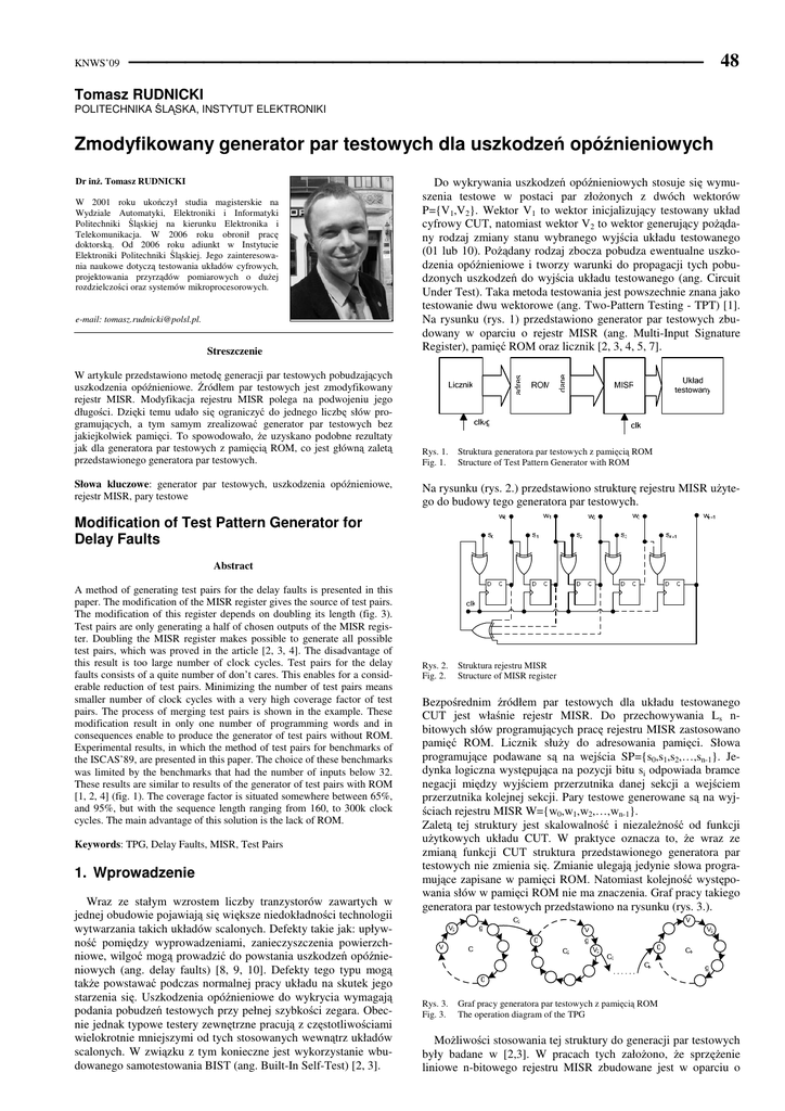 KNWS’09 48 Tomasz RUDNICKI POLITECHNIKA ŚLĄSKA, INSTYTUT ELEKTRONIKI Zmodyfikowany generator par testowych dla uszkodzeń opóźnieniowych Dr inŜ. Tomasz RUDNICKI W 2001 roku ukończył studia magisterskie na Wydziale Automatyki, Elektroniki i Informatyki Politechniki Śląskiej na kierunku Elektronika i Telekomunikacja. W 2006 roku obronił pracę doktorską. Od 2006 roku adiunkt w Instytucie Elektroniki Politechniki Śląskiej. Jego zainteresowania naukowe dotyczą testowania układów cyfrowych, projektowania przyrządów pomiarowych o duŜej rozdzielczości oraz systemów mikroprocesorowych. e-mail: [email protected]. Streszczenie W artykule przedstawiono metodę generacji par testowych pobudzających uszkodzenia opóźnieniowe. Źródłem par testowych jest zmodyfikowany rejestr MISR. Modyfikacja rejestru MISR polega na podwojeniu jego długości. Dzięki temu udało się ograniczyć do jednego liczbę słów programujących, a tym samym zrealizować generator par testowych bez jakiejkolwiek pamięci. To spowodowało, Ŝe uzyskano podobne rezultaty jak dla generatora par testowych z pamięcią ROM, co jest główną zaletą przedstawionego generatora par testowych. Słowa kluczowe: generator par testowych, uszkodzenia opóźnieniowe, rejestr MISR, pary testowe Do wykrywania uszkodzeń opóźnieniowych stosuje się wymuszenia testowe w postaci par złoŜonych z dwóch wektorów P={V1,V2}. Wektor V1 to wektor inicjalizujący testowany układ cyfrowy CUT, natomiast wektor V2 to wektor generujący poŜądany rodzaj zmiany stanu wybranego wyjścia układu testowanego (01 lub 10). PoŜądany rodzaj zbocza pobudza ewentualne uszkodzenia opóźnieniowe i tworzy warunki do propagacji tych pobudzonych uszkodzeń do wyjścia układu testowanego (ang. Circuit Under Test). Taka metoda testowania jest powszechnie znana jako testowanie dwu wektorowe (ang. Two-Pattern Testing - TPT) [1]. Na rysunku (rys. 1) przedstawiono generator par testowych zbudowany w oparciu o rejestr MISR (ang. Multi-Input Signature Register), pamięć ROM oraz licznik [2, 3, 4, 5, 7]. Rys. 1. Fig. 1. Struktura generatora par testowych z pamięcią ROM Structure of Test Pattern Generator with ROM Na rysunku (rys. 2.) przedstawiono strukturę rejestru MISR uŜytego do budowy tego generatora par testowych. Modification of Test Pattern Generator for Delay Faults Abstract A method of generating test pairs for the delay faults is presented in this paper. The modification of the MISR register gives the source of test pairs. The modification of this register depends on doubling its length (fig. 3). Test pairs are only generating a half of chosen outputs of the MISR register. Doubling the MISR register makes possible to generate all possible test pairs, which was proved in the article [2, 3, 4]. The disadvantage of this result is too large number of clock cycles. Test pairs for the delay faults consists of a quite number of don’t cares. This enables for a considerable reduction of test pairs. Minimizing the number of test pairs means smaller number of clock cycles with a very high coverage factor of test pairs. The process of merging test pairs is shown in the example. These modification result in only one number of programming words and in consequences enable to produce the generator of test pairs without ROM. Experimental results, in which the method of test pairs for benchmarks of the ISCAS’89, are presented in this paper. The choice of these benchmarks was limited by the benchmarks that had the number of inputs below 32. These results are similar to results of the generator of test pairs with ROM [1, 2, 4] (fig. 1). The coverage factor is situated somewhere between 65%, and 95%, but with the sequence length ranging from 160, to 300k clock cycles. The main advantage of this solution is the lack of ROM. Keywords: TPG, Delay Faults, MISR, Test Pairs 1. Wprowadzenie Wraz ze stałym wzrostem liczby tranzystorów zawartych w jednej obudowie pojawiają się większe niedokładności technologii wytwarzania takich układów scalonych. Defekty takie jak: upływność pomiędzy wyprowadzeniami, zanieczyszczenia powierzchniowe, wilgoć mogą prowadzić do powstania uszkodzeń opóźnieniowych (ang. delay faults) [8, 9, 10]. Defekty tego typu mogą takŜe powstawać podczas normalnej pracy układu na skutek jego starzenia się. Uszkodzenia opóźnieniowe do wykrycia wymagają podania pobudzeń testowych przy pełnej szybkości zegara. Obecnie jednak typowe testery zewnętrzne pracują z częstotliwościami wielokrotnie mniejszymi od tych stosowanych wewnątrz układów scalonych. W związku z tym konieczne jest wykorzystanie wbudowanego samotestowania BIST (ang. Built-In Self-Test) [2, 3]. Rys. 2. Fig. 2. Struktura rejestru MISR Structure of MISR register Bezpośrednim źródłem par testowych dla układu testowanego CUT jest właśnie rejestr MISR. Do przechowywania Ls nbitowych słów programujących pracę rejestru MISR zastosowano pamięć ROM. Licznik słuŜy do adresowania pamięci. Słowa programujące podawane są na wejścia SP={s0,s1,s2,…,sn-1}. Jedynka logiczna występująca na pozycji bitu si odpowiada bramce negacji między wyjściem przerzutnika danej sekcji a wejściem przerzutnika kolejnej sekcji. Pary testowe generowane są na wyjściach rejestru MISR W={w0,w1,w2,…,wn-1}. Zaletą tej struktury jest skalowalność i niezaleŜność od funkcji uŜytkowych układu CUT. W praktyce oznacza to, Ŝe wraz ze zmianą funkcji CUT struktura przedstawionego generatora par testowych nie zmienia się. Zmianie ulegają jedynie słowa programujące zapisane w pamięci ROM. Natomiast kolejność występowania słów w pamięci ROM nie ma znaczenia. Graf pracy takiego generatora par testowych przedstawiono na rysunku (rys. 3.). Rys. 3. Fig. 3. Graf pracy generatora par testowych z pamięcią ROM The operation diagram of the TPG MoŜliwości stosowania tej struktury do generacji par testowych były badane w [2,3]. W pracach tych 