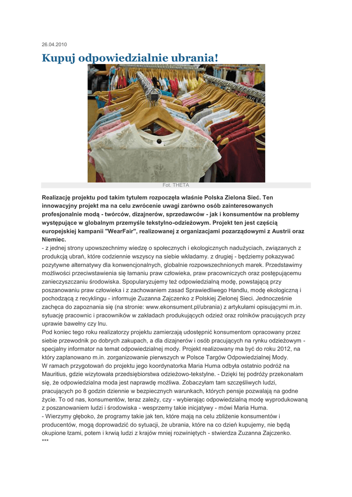 26.04.2010 Kupuj odpowiedzialnie ubrania! Fot. THETA Realizację projektu pod takim tytułem rozpoczęła właśnie Polska Zielona Sieć. Ten innowacyjny projekt ma na celu zwrócenie uwagi zarówno osób zainteresowanych profesjonalnie modą - twórców, dizajnerów, sprzedawców - jak i konsumentów na problemy występujące w globalnym przemyśle tekstylno-odzieżowym. Projekt ten jest częścią europejskiej kampanii "WearFair", realizowanej z organizacjami pozarządowymi z Austrii oraz Niemiec. - z jednej strony upowszechnimy wiedzę o społecznych i ekologicznych nadużyciach, związanych z produkcją ubrań, które codziennie wszyscy na siebie wkładamy. z drugiej - będziemy pokazywać pozytywne alternatywy dla konwencjonalnych, globalnie rozpowszechnionych marek. Przedstawimy możliwości przeciwstawienia się łamaniu praw człowieka, praw pracowniczych oraz postępującemu zanieczyszczaniu środowiska. Spopularyzujemy też odpowiedzialną modę, powstającą przy poszanowaniu praw człowieka i z zachowaniem zasad Sprawiedliwego Handlu, modę ekologiczną i pochodzącą z recyklingu - informuje Zuzanna Zajczenko z Polskiej Zielonej Sieci. Jednocześnie zachęca do zapoznania się (na stronie: www.ekonsument.pl/ubrania) z artykułami opisującymi m.in. sytuację pracownic i pracowników w zakładach produkujących odzież oraz rolników pracujących przy uprawie bawełny czy lnu. Pod koniec tego roku realizatorzy projektu zamierzają udostępnić konsumentom opracowany przez siebie przewodnik po dobrych zakupach, a dla dizajnerów i osób pracujących na rynku odzieżowym specjalny informator na temat odpowiedzialnej mody. Projekt realizowany ma być do roku 2012, na który zaplanowano m.in. zorganizowanie pierwszych w Polsce Targów Odpowiedzialnej Mody. W ramach przygotowań do projektu jego koordynatorka Maria Huma odbyła ostatnio podróż na Mauritius, gdzie wizytowała przedsiębiorstwa odzieżowo-tekstylne. - Dzięki tej podróży przekonałam się, że odpowiedzialna moda jest naprawdę możliwa. Zobaczyłam tam szczęśliwych ludzi, pracujących po 8 godzin dziennie w bezpiecznych warunkach, których pensje pozwalają na godne życie. To od nas, konsumentów, teraz zależy, czy - wybierając odpowiedzialną modę wyprodukowaną z poszanowaniem ludzi i środowiska - wesprzemy takie inicjatywy - mówi Maria Huma. - Wierzymy głęboko, że programy takie jak ten, które mają na celu zbliżenie konsumentów i producentów, mogą doprowadzić do sytuacji, że ubrania, które na co dzień kupujemy, nie będą okupione łzami, potem i krwią ludzi z krajów mniej rozwiniętych - stwierdza Zuzanna Zajczenko. *** Polska Zielona Sieć jest ogólnopolskim związkiem stowarzyszeń i fundacji prowadzących działalność na rzecz zrównoważonego rozwoju i budowania społeczeństwa obywatelskiego. Jej celem jest wspieranie i promowanie udziału społecznego w podejmowaniu decyzji ważnych dla środowiska oraz wzmacnianie kontroli społecznej poprzez wdrażanie dostępu do informacji publicznych. (WES) wydrukuj wyślij dodaj do Portal „Dziennik Polski” wraz ze wszystkimi treściami będącymi jego elementami składowymi - w szczególności internetowe wydanie „Dziennika Polskiego” i treści będące jego elementami składowymi - podlegają ochronie prawnej na podstawie międzynarodowego i polskiego prawa autorskiego. Jakiekolwiek korzystanie z utworów, o których mowa powyżej, przekraczające dozwolony użytek osobisty (uregulowany w ustawie o prawie autorskim i prawach pokrewnych) wymaga wyraźnej zgody Wydawcy - Wydawnictwo Jagiellonia S.A., które z tytułu praw autorskich jest podmiotem uprawnionym do wydania takiej zgody.  2009 Dziennik Polski. Wszystkie prawa zastrzeżone