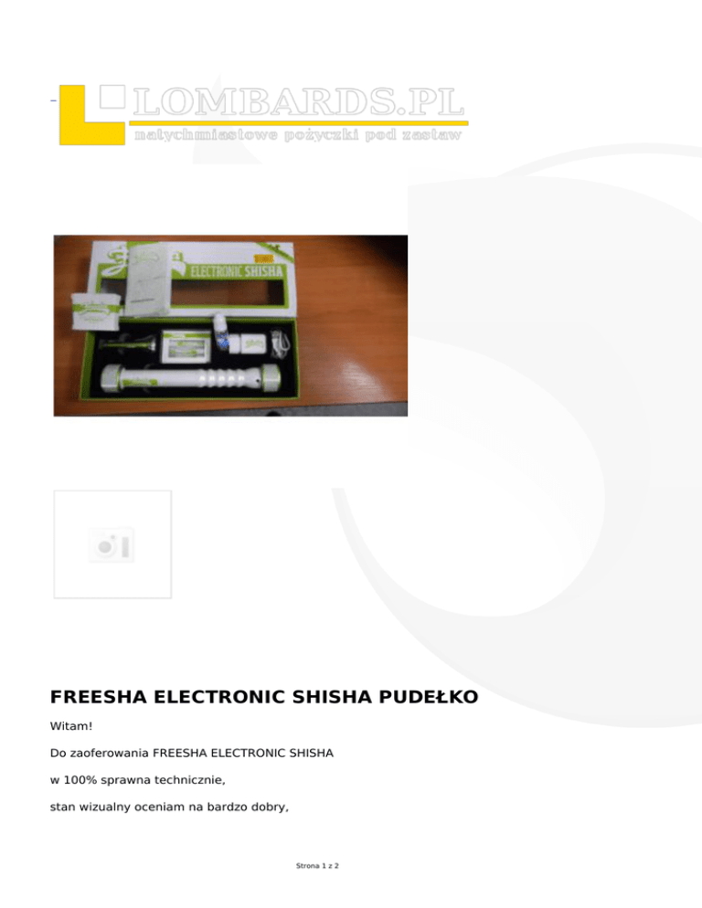 FREESHA ELECTRONIC SHISHA PUDEŁKO Witam! Do zaoferowania FREESHA ELECTRONIC SHISHA w 100% sprawna technicznie, stan wizualny oceniam na bardzo dobry, Strona 1 z 2 W ZESTAWIE: -shisha, -kabel USB, -3 wymienne silikonowe ustniki, -instrukcja obsługi, -dowód zakupu z dnia 31.12.2015r. -pudełko, SPECYFIKACJA: Absolutna nowość na rynku! Elektroniczna szisza – Freesha to absolutnie obowiązkowy sprzęt na każde spotkanie towarzyskie. Pokaźne wymiary i nowoczesny, młodzieżowy design sprawi że imprezy „będą się kręciły” wokół Freeshy. Dzięki zastosowaniu niespotykanego dotąd systemu palenia (trzech oddzielnych kartomizerow) ilość e-dymu generowanego przez e-shishe jest absolutnie nieporównywalna z żadnym e-papierosem o standardowych wymiarach. Uwaga! Ze względu na omawiany system palenia nie zaleca się stosowania liquidów, w których stężenie nikotyny przekracza 6 mg/ml. Strona 2 z 2