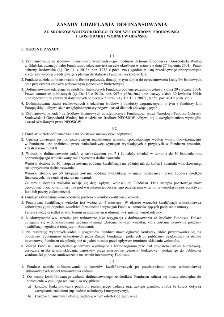 ZASADY UDZIELANIA DOFINANSOWANIA ZE ŚRODKÓW WOJEWÓDZKIEGO FUNDUSZU OCHRONY ŚRODOWISKA I GOSPODARKI WODNEJ W GDAŃSKU I. OGÓLNE ZASADY §1 1. Dofinansowanie ze środków finansowych Wojewódzkiego Funduszu Ochrony Środowiska i Gospodarki Wodnej w Gdańsku, zwanego dalej Funduszem, udzielane jest na cele określone w ustawie z dnia 27 kwietnia 2001r. Prawo ochrony środowiska (t.j. Dz. U. z 2013r. poz. 1232 z późn. zm.) zgodnie z listą przedsięwzięć priorytetowych, kryteriami wyboru przedsięwzięć i planem działalności Funduszu na kolejne lata. 2. Fundusz udziela dofinansowania w formie pożyczek, dotacji, w tym dopłat do oprocentowania kredytów bankowych, oraz przekazania środków państwowym jednostkom budżetowym. 3. Dofinansowanie udzielane ze środków finansowych Funduszu podlega przepisom ustawy z dnia 29 stycznia 2004r. Prawo zamówień publicznych (t.j. Dz. U. z 2013r. poz. 907 z późn. zm.) oraz ustawy z dnia 30 kwietnia 2004r. o postępowaniu w sprawach dotyczących pomocy publicznej (t.j. Dz. U. z 2007r., Nr 59, poz. 404 z późn. zm.). 4. Dofinansowanie zadań realizowanych z udziałem środków z funduszy zagranicznych, w tym z funduszy Unii Europejskiej, odbywa się z uwzględnieniem wymogów i zasad dla nich obowiązujących. 5. Dofinansowanie zadań ze środków finansowych udostępnionych Funduszowi przez Narodowy Fundusz Ochrony Środowiska i Gospodarki Wodnej lub z udziałem środków NFOŚiGW odbywa się z uwzględnieniem wymogów i zasad określonych przez NFOŚiGW. §2 1. Fundusz udziela dofinansowania na podstawie umowy cywilnoprawnej. 2. Umowa zawierana jest po pozytywnym rozpatrzeniu wniosku sporządzonego według wzoru obowiązującego w Funduszu i po spełnieniu przez wnioskodawcę wymagań wynikających z przyjętych w Funduszu procedur, z zastrzeżeniem pkt 8. 3. Wnioski o dofinansowanie zadań, z zastrzeżeniem pkt 7 i 8, należy składać w terminie do 30 listopada roku poprzedzającego wnioskowany rok przyznania dofinansowania. Wnioski złożone do 30 listopada zostaną poddane kwalifikacji nie później niż do końca I kwartału wnioskowanego roku przyznania dofinansowania. Wnioski złożone po 30 listopada zostaną poddane kwalifikacji w miarę posiadanych przez Fundusz środków finansowych, nie rzadziej niż raz na kwartał. Za termin złożenia wniosku uznaje się datę wpływu wniosku do Funduszu. Data stempla pocztowego może decydować o zachowaniu terminu pod warunkiem jednoczesnego przekazania w terminie wniosku za pośrednictwem faxu lub poczty elektronicznej. 4. Fundusz zawiadamia wnioskodawcę pismem o wyniku kwalifikacji wniosku. 5. Pozytywna kwalifikacja wniosku jest ważna do 4 miesięcy. W okresie ważności kwalifikacji wnioskodawca zobowiązany jest dopełnić wszelkich formalności i wymagań Funduszu umożliwiających podpisanie umowy. Fundusz może przedłużyć ww. termin na pisemne uzasadnione wystąpienie wnioskodawcy. 6. Niedotrzymanie ww. terminu jest traktowane jako rezygnacja z dofinansowania ze środków Funduszu. Dalsze ubieganie się o dofinansowanie zadania wymaga złożenia nowego wniosku, który zostanie ponownie poddany kwalifikacji, zgodnie z niniejszymi Zasadami. 7. Na realizację wybranych zadań i programów Fundusz może ogłaszać konkursy, które przeprowadza się na podstawie regulaminów uchwalonych przez Zarząd Funduszu i podanych do publicznej wiadomości na stronie internetowej Funduszu nie później niż na jeden miesiąc przed upływem terminów składania wniosków. 8. Zarząd Funduszu, uwzględniając terminy wynikające z harmonogramu prac nad projektem ustawy budżetowej, corocznie ustala termin składania wniosków przez państwowe jednostki budżetowe i podaje go do publicznej wiadomości poprzez zamieszczenie na stronie internetowej Funduszu. §3 1. Fundusz udziela dofinansowania do kosztów kwalifikowanych po przedstawieniu przez wnioskodawcę zbilansowanych źródeł finansowania zadania. 2. Do kosztu kwalifikowanego zadania dofinansowanego ze środków Funduszu zalicza się koszty niezbędne do poniesienia w celu jego realizacji, za wyjątkiem: a) kosztów funkcjonowania podmiotu realizującego zadanie oraz zakupu gruntów, chyba że koszty dotyczą zarządzania zadaniem (np. nadzór techniczny i merytoryczny), b) kosztów finansowych obsługi zadania, w tym odsetek od zadłużenia, 3. Udzielanie dofinansowania jest uzależnione od wywiązania się przez wnioskodawcę z obowiązku uiszczania opłat za korzystanie ze środowiska i administracyjnych kar pieniężnych wynikających z ustawy Prawo ochrony środowiska oraz od wywiązania się ze zobowiązań w stosunku do Funduszu wynikających z wcześniej zawartych umów. 4. Fundusz może pokryć koszty poniesione przez wnioskodawcę przed datą zawarcia umowy o dofinansowanie, jeżeli zostały one poniesione po podjęciu przez Zarząd Funduszu decyzji o zakwalifikowaniu zadania do dofinansowania. 5. Udzielone przez Fundusz dofinansowanie nie może przekroczyć 80% kosztów kwalifikowanych zadania, z zastrzeżeniem pkt 6. 6. Dofinansowanie może wynosić do 100% kosztów kwalifikowanych zadania w przypadku zadań z zakresu edukacji ekologicznej i ochrony przyrody, a także zadań, o których mowa w § 2 pkt 7, lub w szczególnych przypadkach zadań realizowanych przez podmioty sektora finansów publicznych i organizacje pozarządowe. 7. Fundusz nie udziela dofinansowania na zadania zakończone, z zastrzeżeniem pkt 8. 8. W szczególnych przypadkach takich jak: a) zadania związane z usuwaniem skutków klęsk żywiołowych, zdarzeń losowych czy sytuacji zagrażających życiu lub zdrowiu ludzi, b) zadania, które uzyskały dofinansowanie z funduszy zagranicznych, w tym z funduszy Unii Europejskiej, dopuszcza się możliwość dokonania przez Fundusz refundacji kosztów zadań zakończonych lub kosztów poniesionych przed podjęciem przez Zarząd Funduszu decyzji o zakwalifikowaniu zadania do dofinansowania. §4 1. Fundusz na każ