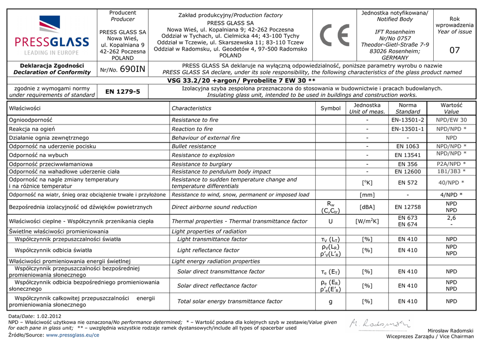 Producent Producer a PRESS GLASS SA Nowa Wieś, ul. Kopalniana 9 42-262 Poczesna POLAND Deklaracja Zgodności Declaration of Conformity Nr/No. Jednostka notyfikowana/ Notified Body Zakład produkcyjny/Production factory PRESS GLASS SA Nowa Wieś, ul. Kopalniana 9; 42-262 Poczesna Oddział w Tychach, ul. Cielmicka 44; 43-100 Tychy Oddział w Tczewie, ul. Skarszewska 11; 83-110 Tczew Oddział w Radomsku, ul. Geodetów 4, 97-500 Radomsko POLAND 690IN IFT Rosenheim Nr/No 0757 Theodor-Gietl-Straße 7-9 83026 Rosenheim; GERMANY Rok wprowadzenia Year of issue 07 PRESS GLASS SA deklaruje na wyłączną odpowiedzialność, poniższe parametry wyrobu o nazwie PRESS GLASS SA declare, under its sole responsibility, the following characteristics of the glass product named VSG 33.2/20 +argon/ Pyrobelite 7 EW 30 ** zgodnie z wymogami normy under requirements of standard EN 1279-5 Izolacyjna szyba zespolona przeznaczona do stosowania w budownictwie i pracach budowlanych. Insulating glass unit, intended to be used in buildings and construction works. Jednostka Unit of meas. Norma Standard Wartość Value Resistance to fire - EN-13501-2 NPD/EW 30 Reakcja na ogień Reaction to fire - EN-13501-1 NPD/NPD * Działanie ognia zewnętrznego Behaviour of external fire - - NPD Odporność na uderzenie pocisku Bullet resistance - EN 1063 Odporność na wybuch Resistance to explosion - EN 13541 NPD/NPD * NPD/NPD * Odporność przeciwwłamaniowa Odporność na wahadłowe uderzenie ciała Odporność na nagle zmiany temperatury i na różnice temperatur Resistance to burglary Resistance to pendulum body impact Resistance to sudden temperature change and temperature differentials - EN 356 EN 12600 P2A/NPD * 1B1/3B3 * [oK] EN 572 40/NPD * Odporność na wiatr, śnieg oraz obciążenie trwałe i przyłożone Resistance to wind, snow, permanent or imposed load 4/NPD * Właściwości Characteristics Ognioodporność [mm] - Rw (C,Ctr) [dBA] EN 12758 U [W/m2K] EN 673 EN 674 τV (LT) ρV(LR) ρ’V(L’R) [%] EN 410 [%] EN 410 Solar direct transmittance factor τe (ET) [%] EN 410 NPD Solar direct reflectance factor ρe (ER) ρ’e(E’R) [%] EN 410 NPD NPD g [%] EN 410 NPD Bezpośrednia izolacyjność od dźwięków powietrznych Direct airborne sound reduction Właściwości cieplne - Współczynnik przenikania ciepła Thermal properties - Thermal transmittance factor Świetlne właściwości promieniowania Współczynnik przepuszczalności światła Light properties of radiation Light transmittance factor Współczynnik odbicia światła Light reflectance factor Właściwości promieniowania energii świetlnej Współczynnik przepuszczalności bezpośredniej promieniowania słonecznego Współczynnik odbicia bezpośredniego promieniowania słonecznego Współczynnik całkowitej przepuszczalności promieniowania słonecznego energii Symbol NPD NPD NPD Light energy radiation properties Total solar energy transmittance factor Data/Date: 1.02.2012 NPD – Właściwość użytkowa nie oznaczona/No performance determined; * – Wartość podana dla kolejnych szyb w zestawie/Value given for each pane in glass unit; ** – uwzględnia wszystkie rodzaje ramek dystansowych/include all types of spacerbar used Źródło/Source: www.pressglass.eu/ce NPD NPD 2,6 - Mirosław Radomski Wiceprezes Zarządu / Vice Chairman