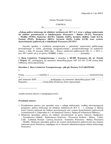 Załącznik nr 3 do SIWZ Istotne Warunki Umowy /UMOWA/ Nr................................................................. na: „Zakup paliwa lotniczego do silników turbinowych JET A-1 wraz z usługą tankowania do statków powietrznych w lokalizacjach: Warszawa – Babice (WA1), Warszawa - Modlin (WM1), Katowice (KTW), Gdańsk (GDN), Kraków (KRK), Łódź (LCJ), Poznań (POZ), Bydgoszcz (BZG), Szczecin (SZZ), Lubin (LUB) oraz cystern dystrybutorów paliwowych w lokalizacji Warszawa (WAW)”. Zawarta zgodnie z wynikiem postępowania o udzielenie zamówienia publicznego prowadzonego w trybie „przetargu nieograniczonego”, przeprowadzonego na podstawie ustawy z dnia 29 stycznia 2004 roku – Prawo zamówień publicznych (Dz. U. z 2013 r., poz. 907 z późń. zm.), nr sprawy 31/2015, w dniu............................... pomiędzy: 1. Bazą Lotnictwa Transportowego, z siedzibą w 00-909 Warszawa 60, ul. Żwirki i Wigury 1C, posługującą się numerem identyfikacyjnym NIP 522-101-72-08 zwaną dalej Odbiorcą, którą reprezentuje: Dowódca 1. Bazy Lotnictwa Transportowego - płk pil. Dariusz TATAROWSKI a Firmą ……………., z siedzibą w ……………………………………………., zarejestrowaną w ……………………………………………………………………………………………….., pod numerem KRS …………….., posługującą się numerem identyfikacyjnym NIP ………, Regonem ………………., zwaną dalej Dostawcą, które reprezentuje: ……………………. została zawarta umowa o następującej treści: §1 Przedmiot umowy 1. Przedmiotem umowy jest sprzedaż wraz z usługą tankowania, według obowiązujących przepisów, paliwa lotniczego do silników turbinowych JET A – 1, zwanego w dalszej treści Umowy paliwem do statków powietrznych oraz cystern dystrybutorów paliwowych wymienionych w Załączniku nr 1 do niniejszej Umowy, będących własnością Odbiorcy. 2. Miejscem sprzedaży paliwa do statków powietrznych są porty lotnicze: Bydgoszcz – Szwederowo, Gdańsk – Rębiechowo, Katowice – Pyrzowice, Kraków – Balice, Lubin, Łódź – Lublinek, Poznań – Ławica, Szczecin – Goleniów, Warszawa – Babice, Warszawa – Modlin. Miejscem sprzedaży paliwa do cystern dystrybutorów paliwowych jest miejsce wskazane przez Dostawcę, znajdujące się w obszarze administracyjnym miasta stołecznego Warszawy. 3. Dostawa paliwa lotniczego do statków powietrznych oraz do cystern dystrybutorów paliwowych Odbiorcy w ilości nie więcej niż 266 250 litrów, przy czym dostawę paliwa JET A – 1 ustala się w niżej wymienionej ilości: a. zakup paliwa lotniczego wraz usługą tankowania do statków powietrznych w niżej wymienionych portach lotniczych: Zadanie nr 1: Bydgoszcz – Szwederowo - nie więcej niż 2 000 l, Zadanie nr 2: Gdańsk – Rębiechowo - nie więcej niż 2 000 l, Zadanie nr 3: Katowice – Pyrzowice - nie więcej niż 8 000 l,, Zadanie nr 4: Kraków – Balice - nie więcej niż 8 000 l, Zadanie nr 5: Lubin - nie więcej niż 4 000 l, Zadanie nr 6: Łódź – Lublinek - nie więcej niż 7 000 l, Zadanie nr 7: Poznań – Ławica - nie więcej niż 4 000 l,, Zadanie nr 8: Szczecin – Goleniów - nie więcej niż 9 000 l, Zadanie nr 9: Warszawa – Babice - nie więcej niż 6 000 l, Zadanie nr 10: Warszawa – Modlin - nie więcej niż 6 000 l, b. zakup paliwa lotniczego do cystern dystrybutorów paliwowych w miejscu wskazanym przez dostawcę, znajdującym się w obszarze administracyjnym miasta stołecznego Warszawy: Zadanie nr 11 - nie więcej niż 210 250 l. 4. Zakup paliwa we wskazanych portach lotniczych oraz do cystern dystrybutorów Odbiorcy będzie realizowany sukcesywnie stosownie do potrzeb Odbiorcy. Odbiorca dopuszcza ewentualność nierealizowania zakupu paliwa lotniczego na poszczególnych lotniskach w przypadku braku zgłoszenia na realizację zadania lotniczego. 5. Dopuszcza się możliwość zmiany przez Odbiorcę statków powietrznych oraz cystern dystrybutorów paliwowych. 6. Dopuszcza się zmiany w ilościach zakupywanego paliwa pomiędzy zadaniami w przypadku wykorzystania limitów, o którym mowa w pkt 3 ppkt a) oraz b), jednakże nie przekraczając całkowitej wartości zamówienia. §2 Dostawy 1. Dostawca zobowiązany jest sprzedać Odbiorcy ilość paliwa uzgodnioną przez Strony. 2. Sprzedaż paliwa odbywać się będzie w obecności upoważnionego przedstawiciela Odbiorcy (magazyniera – w przypadku tankowania cystern dystrybutorów paliwowych, członka załogi – w przypadku tankowania statków powietrznych), który jest zobowiązany do pokwitowania dowodu dostawy. Dowód dostawy stanowi podstawę do obciążenia Odbiorcy należną kwotą za sprzedane mu paliwo. Pomiary ilości paliwa dokonywane przez Dostawcę jego urządzeniami będą przez Strony umowy traktowane, jako dowód ilości sprzedanego Odbiorcy paliwa. Jednakże Odbiorca jest uprawniony, w dowolnym czasie, w przyjętych godzinach pracy Dostawcy, w obecności uprawnionych przedstawicieli Dostawcy do przeprowadzenia kontroli urządzeń pomiarowych używanych przez Dostawcę. 3. Dostawca umożliwi Odbiorcy zamontowanie polowego dozownika dodatków do paliwa lotniczego (MZD 1500-2000/50 M1) na wyznaczonym punkcie wydawczym Odbiorcy. Dostawca umożliwi upoważnionemu przedstawicielowi Odbiorcy właściwe podłączenie i uruchomienie dozownika przed rozpoczęciem wydawania paliwa do cysterny dystrybutora paliwowego Odbiorcy. 4. Prawo własności do paliwa sprzedawanego Odbiorcy oraz ryzyko jego utraty przechodzi na Odbiorcę z chwilą przekroczenia przez paliwo zaworu wlewu paliwa tankowanego statku powietrznego lub podstawionej cysterny dystrybutora paliwowego użytkowanej przez Odbiorcę. 5. Na prośbę Odbiorcy, Dostawca jest zobowiązany do ściągnięcia już zatankowanego paliwa ze zbiorników statku powietrznego. Za wykonanie tej usługi Dostawca obciąży Odbiorcę dodatkową opłatą wg cennika opłat 