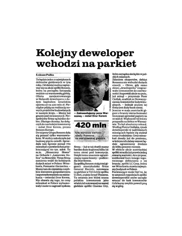 Kolejny deweloper wchodzi na parkiet Łukasz Pałka To będzie jeden z największych debiutów giełdowych w tym roku. Od dzisiaj można zapisy wać się na akcje spółki Ronson, która na początku listopada wejdzie na warszawską giełdę. Oferta zarejestrowanego w Holandii dewelopera z du żym kapitałem izraelskim opiewa aż na 420 mln zł. Pie niądze pójdą na realizację no wych projektów budowlanych w naszym kraju. - Mamy już grunty pod 19 inwestycji. Per spektywy firmy są bardzo do bre. Dlatego chcemy, by dołą czyli do nas kolejni inwestorzy - mówi Dror Kerem, prezes Ronson Europe. Do tej pory Grupa Ronson dała się poznać tylko warszawia kom. W stolicy zakończyła już budowę pięciu osiedli. Sprze dała tam łącznie ponad 770 mieszkań o powierzchni przekraczającej 60 tys. mkw. To m.in. „Słoneczny Skwer" na Ochocie i „Lazurowa Do lina" na Bemowie. Teraz firma zamierza wejść do kolejnych dużych miast w Polsce: Wroc ławia, Poznania i Szczecina. Mamytamdoczyniehiazszybkim wzrostem gospodarczym i zapotrzebowaniem na miesz kania - twierdzi Dror Kerem. Nie obawia się tego, że ceny mieszkań w Polsce wyhamo wały imoże to zagrozić zyskom która zarządza siecią kinwpolskich miastach. Zdaniem ekspertów, debiut Ronsona nie wzbudzi dużych emocji. - Okres, gdy samo słowo „deweloperka" rozgrze wało inwestorów do czerwo ności i kupowali akqe na pniu, już minął - przyznaje Piotr Cieślak, analityk ze Stowarzy szenia Inwestorów Indywidu alnych. - Jednak atutem tej firmy jest duży bank ziemi. Jeszcze w maju austriacki gi - Zainwestujemy poza War gant z branży nieruchomości Immoeast sprzedał papiery za szawą - mówi Dror Kerem 10 mld zł. Większość tej kwoty przypadła na debiut w Warsza wie. To był absolutny rekord. Według Piotra Cieślaka, rynek deweloperski w najbliższych miesiącach będzie się stawał tyle wyniesie wartość / coraz trudniejszy. Ceny miesz oferty Ronsona . . , *Ą kań doszły już do poziomu, na warszawskiej giełdzie wktórym ich dalszy wzrost bę dzie ograniczony średnio firmy. - Już w tej chwili mamy do kilku procent rocznie. bardzo dużo kupionej kilka lat W efekcie akcje austriackiej temu ziemi pod inwestycje. spółki straciły już prawie jedną Dzięki temu znacznie ograni czwartą wartości. Aż o 30 proc. czamy nasze koszty - podkre zniżkowałkurs innego tego rocznego debiutanta z tej śla Dror Kerem. Za spółką Ronson stoją trzej gi branży, spółki LC Corp, która ganci: amerykańska firma we Wrocławiu stawia najwyż-. General Electric, notowana szypudynekwPolsce. na giełdzie w Tel Avivie spółka Pocieszające może być to, że U.Dori,atakżeIsraelTheatres. w ostatnich tygodniach spółki Ta ostatnia jest bliżej znana deweloperskie znów zaczęły polskim inwestorom jako wracać do łask inwestorów właściciel notowanej na naszej i ichkursy zwykle powoli pną giełdzie spółki Cinema City, sięwgórc. 420 mln