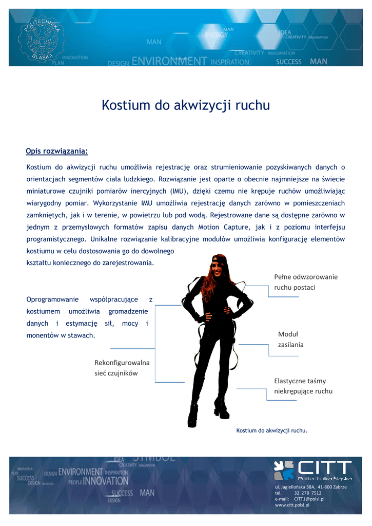 Kostium do akwizycji ruchu Opis rozwiązania: Kostium do akwizycji ruchu umożliwia rejestrację oraz strumieniowanie pozyskiwanych danych o orientacjach segmentów ciała ludzkiego. Rozwiązanie jest oparte o obecnie najmniejsze na świecie miniaturowe czujniki pomiarów inercyjnych (IMU), dzięki czemu nie krępuje ruchów umożliwiając wiarygodny pomiar. Wykorzystanie IMU umożliwia rejestrację danych zarówno w pomieszczeniach zamkniętych, jak i w terenie, w powietrzu lub pod wodą. Rejestrowane dane są dostępne zarówno w jednym z przemysłowych formatów zapisu danych Motion Capture, jak i z poziomu interfejsu programistycznego. Unikalne rozwiązanie kalibracyjne modułów umożliwia konfigurację elementów kostiumu w celu dostosowania go do dowolnego kształtu koniecznego do zarejestrowania. Oprogramowanie kostiumem danych i współpracujące umożliwia estymację z Pełne odwzorowanie ruchu postaci ludzkiej gromadzenie sił, mocy i monentów w stawach. Moduł zasilania i komunikacji Rekonfigurowalna sieć czujników Elastyczne taśmy niekrępujące ruchu Kostium do akwizycji ruchu. ul. Jagiellońska 38A, 41-800 Zabrze tel. 32 278 7512 e-mail: [email protected] www.citt.polsl.pl Zalety rozwiązania: • oparty o najmniejszy czujnik IMU na świecie dzięki czemu nie krępuje ruchów, • możliwość odbioru bieżących danych z poziomu SDK, • eksport zarejestrowanych danych w popularnych formatach zapisu danych Motion Capture, • bezprzewodowa rejestracja danych w pomieszczeniach, w terenie, w powietrzu i pod wodą, • możliwość integracji z popularnymi silnikami graficznymi, • całość elektroniki, konstrukcji mechanicznej oraz algorytmów sterowania i komunikacji stanowi wyłącznie Polską myśl techniczną. Źródło finansowania: Projekt finansowany przez Narodowe Centrum Badań i Rozwoju w ramach Programu Badań Stosowanych nr projektu 178438 1 konkursu badań stosowanych pt.: „Kostium do akwizycji ruchu człowieka oparty na sensorach IMU z oprogramowaniem gromadzenia, wizualizacji oraz analizy danych”. * * * Wykonawca: Politechnika Śląska Wydział Automatyki, Elektroniki i Informatyki Instytut Automatyki ul. Akademicka 16, Kontakt: 44-100 Gliwice dr inż. Damian Bereska e-mail: [email protected] tel. 32-2371095 ul. Jagiellońska 38A, 41-800 Zabrze tel. 32 278 7512 e-mail: [email protected] www.citt.polsl.pl