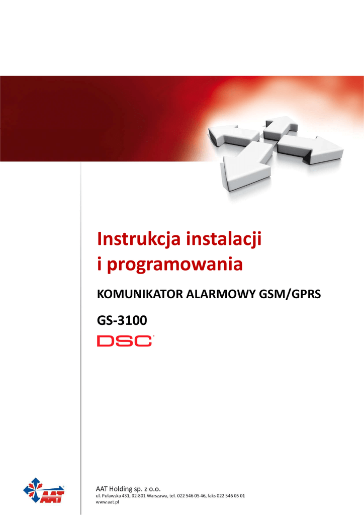 Instrukcja instalacji i programowania KOMUNIKATOR ALARMOWY GSM/GPRS GS-3100 GS3100 – Instrukcja instalacji i programowania SPIS TREŚCI 1. Opis elementów składowych urządzenia ...................................................... 3 2. Wprowadzenie ................................................................................................. 4 2.1. Cechy .......................................................................................................................4 2.2. Specyfikacja techniczna ............................................................................................4 2.3. Opis urządzenia ........................................................................................................5 3. Instalacja urządzenia ...................................................................................... 5 4. Podłączenie urządzenia .................................................................................. 7 5. Diody statusu .................................................................................................. 8 6. Tryby pracy ...................................................................................................... 9 6.1. Kanał PSTN ..............................................................................................................9 6.2. Kanał GSM ................................................................................................................9 6.3. Tryb Contact ID ........................................................................................................9 7. Aktywacja wyjść .............................................................................................. 9 8. Programowanie urządzenia .......................................................................... 10 8.1. Wyświetlanie ustawień urządzenia .........................................................................10 8.2. Wysyłanie ustawień do urządzenia .........................................................................10 8.3. Główne okno programu ..........................................................................................10 8.4. Zakładka Numery telefonów ...................................................................................11 8.5. Zakładka Opcje .......................................................................................................12 8.6. Zakładka GPRS ......................................................................................................12 8.7. Zakładka Status ......................................................................................................13 AAT Holding sp. z o.o. Wszelkie prawa zastrzeżone. 2 GS3100 – Instrukcja instalacji i programowania 1. Opis elementów składowych urządzenia rys. 1 Części Numer Części Numer Antena GSM 1 Karta SIM 8 Magnetyczna podstawka anteny 2 Złącze do podłączenia przewodu PC-Link 9 Przewód anteny 3 Listwa z zaciskami 10 Złącze do podłączenia anteny 4 Otwór do przeprowadzenia przewodu anteny 11 Diody LED 5 Otwory montażowe zaczepu montażowego 12 Slot na kartę SIM 6 Zaczep montażowy 13 Otwory montażowe 7 Plastykowe kołki montażowe 14 AAT Holding sp. z o.o. Wszelkie prawa zastrzeżone. 3 GS3100 – Instrukcja instalacji i programowania 2. Wprowadzenie GS3100 jest komunikatorem alarmowym, który w przypadku utraty komunikacji przez linię PSTN wyśle informacje o zdarzeniach zaistniałych w systemie do odbiorników SG-System III, oraz SG-System II przy wykorzystaniu sieci telefonii komórkowej GSM/GPRS. W skład zestawu handlowego GS3100 wchodzą: nadajnik GS3100, antena wraz z 2 metrowym przewodem oraz metalowy zaczep montażowy. Instrukcja ta wyjaśnia zasady działania oraz programowania komunikatora alarmowego GS3100 Uwaga! Urządzenie przeznaczone jest do montażu w środowisku o maksymalnie 2 stopniu zanieczyszczenia i możliwości występowania przepięć kategorii II. Urządzenie przeznaczone jest wyłącznie do montażu wewnętrznego. Montaż urządzenia powinien wykonywać wyłącznie wykwalifikowany instalator systemów alarmowych. 2.1. Cechy • Symulacja linii naziemnej PSTN, • Automatyczne przełączenie na sieć GSM w przypadku usterki linii naziemnej PSTN, • Zarządzanie oraz rejestr połączeń wychodzących oraz przychodzących, • Indykator siły sygnału GSM, • 3 programowalne wyjścia typu OC, • Zabezpieczenie przeciw przepięciowe wejść linii telefonicznej • Cztery zakresy częstotliwości GSM • Antena z magnetyczną podstawką • Współpraca z większością central alarmowych obsługujących format Contact ID przy komunikacji poprzez sieć GPRS • Komunikacja poprzez GPRS/Internet z odbiornikami Sur-Gard System III/II, • Dialer Contact ID - możliwość zaprogramowania do 4 numerów telefonicznych, • Możliwość zaprogramowania do 100 numerów telefonicznych zdalnie sterujących wyjściem OC, • Możliwość zdalnego sterowania wyjściem OC za pomocą numerów telefonicznych nadzoru zdalnego, • Programowanie za pomocą komputera klasy PC. 2.2. Specyfikacja techniczna Urządzenie może być zasilane z wyjścia AUX centrali alarmowej, lub z zewnętrznego źródła zasilania. Zasilanie Pobór prądu w stanie czuwania Pobór prądu podczas wysyłania komunikatu Wyjścia PGM Obsługiwane częstotliwości Maksymalna rezystancja w pętli przewodu podłączonego do zacisków LI Maksymalna liczba urządzeń podłączonych równolegle do zacisku LI Temperatura pracy Wymiary Waga GS3055-IGW 9,6 ÷ 27,6V= 100 mA przy 13.8V 200 mA przy 13.8V 3 wyjścia typu OC, 100mA 900/1800MHz oraz 850/1900MHz AAT Holding sp. z o.o. Wszelkie prawa zastrzeżone. 1kΩ 2 5°C ~ 40°C 60,45 x 142 mm 77g 4 GS3100 – Instrukcja instalacji i programowania 2.3. Opis urządzenia Nadajnik GS3055 jest komunikatorem alarmowym wysyłającym informacje o zdarzeniach alarmowych do stacji monitorowania alarmów. W miejscach gdzie dostępny jest tylko serw
