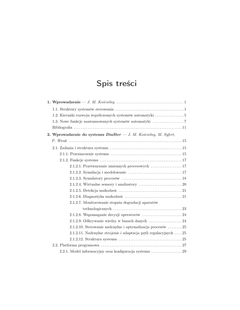 Spis treści 1. Wprowadzenie — J. M. Kościelny . . . . . . . . . . . . . . . . . . . . . . . . . . . . . . . . . . . . . . . 1 1.1. Struktury systemów sterowania . . . . . . . . . . . . . . . . . . . . . . . . . . . . . . . . . . . . . . . . 1 1.2. Kierunki rozwoju współczesnych systemów automatyki . . . . . . . . . . . . . . . . .5 1.3. Nowe funkcje zaawansowanych systemów automatyki . . . . . . . . . . . . . . . . . . 7 Bibliografia . . . . . . . . . . . . . . . . . . . . . . . . . . . . . . . . . . . . . . . . . . . . . . . . . . . . . . . . . . . . . . . 11 2. Wprowadzenie do systemu DiaSter — J. M. Kościelny, M. Syfert, P. Wnuk . . . . . . . . . . . . . . . . . . . . . . . . . . . . . . . . . . . . . . . . . . . . . . . . . . . . . . . . . . . . . . . . . . 15 2.1. Zadania i struktura systemu . . . . . . . . . . . . . . . . . . . . . . . . . . . . . . . . . . . . . . . . . . 15 2.1.1. Przeznaczenie systemu . . . . . . . . . . . . . . . . . . . . . . . . . . . . . . . . . . . . . . . . . 15 2.1.2. Funkcje systemu . . . . . . . . . . . . . . . . . . . . . . . . . . . . . . . . . . . . . . . . . . . . . . . . 17 2.1.2.1. Przetwarzanie zmiennych procesowych . . . . . . . . . . . . . . . . . . 17 2.1.2.2. Symulacja i modelowanie . . . . . . . . . . . . . . . . . . . . . . . . . . . . . . . 17 2.1.2.3. Symulatory procesów . . . . . . . . . . . . . . . . . . . . . . . . . . . . . . . . . . . 18 2.1.2.4. Wirtualne sensory i analizatory . . . . . . . . . . . . . . . . . . . . . . . . . 20 2.1.2.5. Detekcja uszkodzeń . . . . . . . . . . . . . . . . . . . . . . . . . . . . . . . . . . . . . 21 2.1.2.6. Diagnostyka uszkodzeń . . . . . . . . . . . . . . . . . . . . . . . . . . . . . . . . . 21 2.1.2.7. Monitorowanie stopnia degradacji aparatów technologicznych . . . . . . . . . . . . . . . . . . . . . . . . . . . . . . . . . . . . . . . . 23 2.1.2.8. Wspomaganie decyzji operatorów . . . . . . . . . . . . . . . . . . . . . . . 24 2.1.2.9. Odkrywanie wiedzy w bazach danych . . . . . . . . . . . . . . . . . . . 24 2.1.2.10. Sterowanie nadrzędne i optymalizacja procesów . . . . . . . . 25 2.1.2.11. Nadrzędne strojenie i adaptacja pętli regulacyjnych . . . . 25 2.1.2.12. Struktura systemu . . . . . . . . . . . . . . . . . . . . . . . . . . . . . . . . . . . . . 25 2.2. Platforma programowa . . . . . . . . . . . . . . . . . . . . . . . . . . . . . . . . . . . . . . . . . . . . . . . 27 2.2.1. Model informacyjny oraz konfiguracja systemu . . . . . . . . . . . . . . . . . . 29 2.2.2. Centralna baza danych archiwalnych oraz bazy danych użytkowników . . . . . . . . . . . . . . . . . . . . . . . . . . . . . . . . . . . . . . . . . . . . . . . . . . 33 2.2.3. Wymiana danych . . . . . . . . . . . . . . . . . . . . . . . . . . . . . . . . . . . . . . . . . . . . . . . 37 2.2.3.1. Komunikacja modułów systemu . . . . . . . . . . . . . . . . . . . . . . . . . 37 2.2.3.2. Sprzęgnięcie z systemami zewnętrznymi . . . . . . . . . . . . . . . . . 40 2.2.4. Moduł modelowania . . . . . . . . . . . . . . . . . . . . . . . . . . . . . . . . . . . . . . . . . . . . 41 2.2.4.1. Struktura pakietu . . . . . . . . . . . . . . . . . . . . . . . . . . . . . . . . . . . . . . . 41 2.2.4.2. Moduł wstępnego przetwarzania danych . . . . . . . . . . . . . . . . .42 2.2.4.3. Moduł identyfikacji modeli . . . . . . . . . . . . . . . . . . . . . . . . . . . . . . 43 2.2.4.4. Mechanizm wtyczek . . . . . . . . . . . . . . . . . . . . . . . . . . . . . . . . . . . . .44 2.2.4.5. Rozproszone środowisko obliczeniowe . . . . . . . . . . . . . . . . . . . 45 2.2.5. Moduł obliczeniowy . . . . . . . . . . . . . . . . . . . . . . . . . . . . . . . . . . . . . . . . . . . . 47 2.2.5.1. Bloki funkcyjne . . . . . . . . . . . . . . . . . . . . . . . . . . . . . . . . . . . . . . . . . 48 2.2.5.2. Ścieżki przetwarzania . . . . . . . . . . . . . . . . . . . . . . . . . . . . . . . . . . . 49 2.2.5.3. Zmienne wewnętrzne . . . . . . . . . . . . . . . . . . . . . . . . . . . . . . . . . . . . 50 2.2.5.4. Tryby pracy modułu i metody synchronizacji danych . . . . 51 2.2.6. Moduł wizualizacji . . . . . . . . . . . . . . . . . . . . . . . . . . . . . . . . . . . . . . . . . . . . . 52 3. Modele procesów — K. Janiszowski, J. Korbicz, K. Patan, M. Witczak . . . . . . . . . . . . . . . . . . . . . . . . . . . . . . . . . . . . . . . . . . . . . . . . . . . . . . . . . . . . . . . 59 3.1. Wprowadzenie . . . . . . . . . . . . . . . . . . . . . . . . . . . . . . . . . . . . . . . . . . . . . . . . . . . . . . . . 59 3.2. Modele analityczne i modelowanie . . . . . . . . . . . . . . . . . . . . . . . . . . . . . . . . . . . . 61 3.2.1. Siłownik pneumatyczny sterowany serwozaworem – model działania zespołu . . . . . . . . . . . . . . . . . . . . . . . . . . . . . . . . . . . . . . 62 3.2.2. Siłownik pneumatyczny sterowany serwozaworem – model blokowy zespołu . . . . . . . . . . . . . . . . . . . . . . . . . . . . . . . . . . . . . . . 67 3.2.3. Model przeciwprądowego wymiennika ciepła . . . . . . . . . . . . . . . . . . . . 69 3.2.4. Metody całkowania i zagadnienia numeryczne związane z symulacją modeli analitycznych . . . . . . . . . . . . . . . . . . . . . . . . . . . . . . 75 3.2.5. Dobór kroku całkowania . . . . . . . . . . . . . . . . . . . . . . . . . . . . . . . . . . . . . . . . 76 3.3. Modele liniowe – lokalne przybliżenie właściwości dynamicznych . . . . . . 76 3.3.1. Wyznaczanie współczynników modeli analitycznych – PExSim Optimizer . . . . . . . . . . . . . . . . . . . . . . . . . . . . . . . . . . . . . . . . . . . 84 3.3.2. Obserwatory stanu procesu . . . . . . . . . . . . . . . . . . . . . . . . . . . . . . . . . . . . . 87 3.4. Modele neuronowe . . . . . . . . . . . . . . . . . . . . . . . . . . . . . . . . . . . . . . . . . . . . . . . . . . . .90 3.4.1. Perceptron wielowarstwowy . . . . . . . . . . . . . . . . . . . . . . . . . . . . . . . . . . . . . 90 x 3.4.2. Sieci neuronowe z li