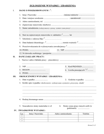 ZGŁOSZENIE WYPADKU / ZDARZENIA I. 1 DANE O POSZKODOWANYM / : 1. Imię i Nazwisko ……………………………… ; imiona rodziców …..……………… 2. Data i miejsce urodzenia ............................................... ; narodowość …………….…. 3. Adres zamieszkania, tel. .................................................................................................. 4. Zajmowane stanowisko służbowe ................................................................................... 5. Statut zatrudnienia (rodzaj umowy o pracę, wymiar czasu pracy) ............................................. ......................................................................................................................................... 1 6. Staż na zajmowanym stanowisku w zakładzie / ............ lat 1 7. Szkolenie z zakresu bhp / …………………… 1 1 8. Data badania lekarskiego / …………………..; termin ważność / …………………… 1 9. Przeciwwskazania do wykonywania zawodu/pracy / ………………………………. 10. PESEL .................................... 11. NIP ........................................................ 12. Nr dowodu osobistego / paszportu ................................................... II. DANE ZAKŁADU PRACY: 1. Nazwa i adres Zakładu pracy – pracodawcy ................................................................ ......................................................................................................................................... 2. NIP ................................. 5. Kod PKD/EKD...................... 3. REGON …………………. 6. Liczba pracujących / ........... 1 2 4. PESEL ..................................... III. OKOLICZNOŚCI WYPADKU / ZDARZENIA: 1. Data wypadku ........................ 2. Godzina wypadku ................. 3. Krótki opis wypadku /okoliczności, wykonywane czynności, przyczyny, skutki/ ............................................................................................................................................. ............................................................................................................................................. ............................................................................................................................................. ..................................................................................................................................... 4. Rodzaj doznanego urazu ................................................................................................ ........................................................................................................................................ 5. Szacunkowe straty materialne w zł 6. Straty czasu pracy innych osób (w godzinach) ...................... IV. ŚWIADKOWIE WYPADKU: Lp. Imię i Nazwisko Adres zamieszkania Telefon 1 2 3 Strona 1 z 2 V. 3 ZGŁASZAJĄCY / PRZYJMUJĄCY ZGŁOSZENIE / : 1. Imię i Nazwisko ...................................... 2. Data zgłoszenia / przyjęcia ........................ ….................................................. podpis zgłaszającego/ przyjmującego VI. UWAGI DOTYCZĄCE WYPADKU, POTWIERDZENIE WYPADKU. .............................................................................................................................................. .............................................................................................................................................. …….................................................................... Data, pieczątka i podpis przełożonego / pracodawcy VII. KWALIFIKACJA SKUTKÓW I RODZAJU ZDARZENIA. 1. Zdarzenie spowodowało /w stosunku do ludzi/ a/ brak urazu b/ uraz, uszkodzenie ciała i wymaga pomocy medycznej c/ uraz - tylko udzielenie pierwszej pomocy d/ zgon 2. Czy stwierdzono nieprzestrzeganie przepisów bhp przez pracodawcę ? a/ tak b/ nie 3. Rodzaj zdarzenia: a/ zdarzenie potencjalnie wypadkowe b/ tylko I pomoc /np. wypadek lekki, zranienie/ c/wypadek Data kwalifikacji ……………… ....................................................... Służba bhp /pieczątka i podpis/ VIII. OŚWIADCZENIE POSZKODOWANEGO / 4 1. Z uwagi na - brak niezdolności do pracy, - braku konieczności udzielenia pomocy medycznej - nie stwierdzenia nieprzestrzegania przepisów bhp przez pracodawcę nie wnoszę o sporządzenie protokołu wypadkowego. 2. Wnoszę o sporządzenie protokołu wypadkowego ................................................................ Data i podpis poszkodowanego Objaśnienia: /1 - w przypadku zdarzeń potencjalnie wypadkowych nie podawać danych z zaciemnionych pól. /2 - w przypadku wypadków w drodze do lub z pracy nie podawać danych w części I w pkt 6,7,8, 9 oraz części II pkt. 6 /3- przyjmujący zgłoszenie w przypadku zgłoszeń drogą telefoniczną, e-mail itp. /4 - poszkodowany składa oświadczenie w przypadku zaznaczenia w części VII pkt. 3 pola b. Wtedy należy zaznaczyć właściwe pole i skreślić pozostały przypadek. Strona 2 z 2