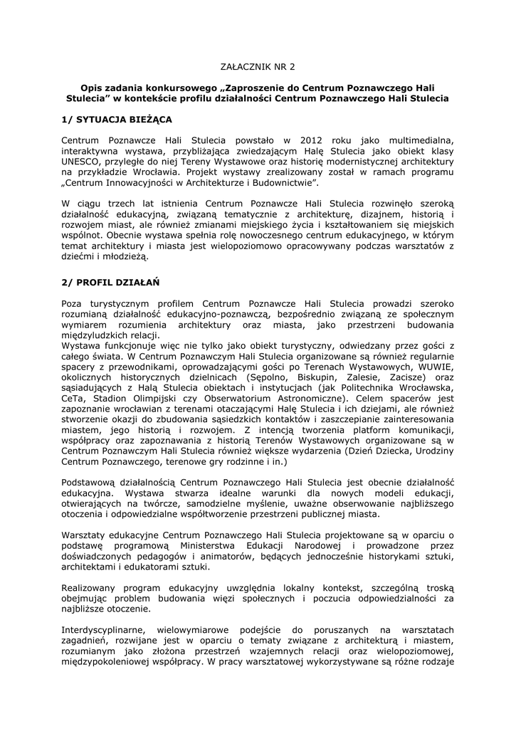 ZAŁACZNIK NR 2 Opis zadania konkursowego „Zaproszenie do Centrum Poznawczego Hali Stulecia” w kontekście profilu działalności Centrum Poznawczego Hali Stulecia 1/ SYTUACJA BIEŻĄCA Centrum Poznawcze Hali Stulecia powstało w 2012 interaktywna wystawa, przybliżająca zwiedzającym Halę UNESCO, przyległe do niej Tereny Wystawowe oraz historię na przykładzie Wrocławia. Projekt wystawy zrealizowany „Centrum Innowacyjności w Architekturze i Budownictwie”. roku jako multimedialna, Stulecia jako obiekt klasy modernistycznej architektury został w ramach programu W ciągu trzech lat istnienia Centrum Poznawcze Hali Stulecia rozwinęło szeroką działalność edukacyjną, związaną tematycznie z architekturę, dizajnem, historią i rozwojem miast, ale również zmianami miejskiego życia i kształtowaniem się miejskich wspólnot. Obecnie wystawa spełnia rolę nowoczesnego centrum edukacyjnego, w którym temat architektury i miasta jest wielopoziomowo opracowywany podczas warsztatów z dziećmi i młodzieżą. 2/ PROFIL DZIAŁAŃ Poza turystycznym profilem Centrum Poznawcze Hali Stulecia prowadzi szeroko rozumianą działalność edukacyjno-poznawczą, bezpośrednio związaną ze społecznym wymiarem rozumienia architektury oraz miasta, jako przestrzeni budowania międzyludzkich relacji. Wystawa funkcjonuje więc nie tylko jako obiekt turystyczny, odwiedzany przez gości z całego świata. W Centrum Poznawczym Hali Stulecia organizowane są również regularnie spacery z przewodnikami, oprowadzającymi gości po Terenach Wystawowych, WUWIE, okolicznych historycznych dzielnicach (Sępolno, Biskupin, Zalesie, Zacisze) oraz sąsiadujących z Halą Stulecia obiektach i instytucjach (jak Politechnika Wrocławska, CeTa, Stadion Olimpijski czy Obserwatorium Astronomiczne). Celem spacerów jest zapoznanie wrocławian z terenami otaczającymi Halę Stulecia i ich dziejami, ale również stworzenie okazji do zbudowania sąsiedzkich kontaktów i zaszczepianie zainteresowania miastem, jego historią i rozwojem. Z intencją tworzenia platform komunikacji, współpracy oraz zapoznawania z historią Terenów Wystawowych organizowane są w Centrum Poznawczym Hali Stulecia również większe wydarzenia (Dzień Dziecka, Urodziny Centrum Poznawczego, terenowe gry rodzinne i in.) Podstawową działalnością Centrum Poznawczego Hali Stulecia jest obecnie działalność edukacyjna. Wystawa stwarza idealne warunki dla nowych modeli edukacji, otwierających na twórcze, samodzielne myślenie, uważne obserwowanie najbliższego otoczenia i odpowiedzialne współtworzenie przestrzeni publicznej miasta. Warsztaty edukacyjne Centrum Poznawczego Hali Stulecia projektowane są w oparciu o podstawę programową Ministerstwa Edukacji Narodowej i prowadzone przez doświadczonych pedagogów i animatorów, będących jednocześnie historykami sztuki, architektami i edukatorami sztuki. Realizowany program edukacyjny uwzględnia lokalny kontekst, szczególną troską obejmując problem budowania więzi społecznych i poczucia odpowiedzialności za najbliższe otoczenie. Interdyscyplinarne, wielowymiarowe podejście do poruszanych na warsztatach zagadnień, rozwijane jest w oparciu o tematy związane z architekturą i miastem, rozumianym jako złożona przestrzeń wzajemnych relacji oraz wielopoziomowej, międzypokoleniowej współpracy. W pracy warsztatowej wykorzystywane są różne rodzaje klocków konstrukcyjnych, tablice interaktywne, projektowanie przestrzenne, tworzenie modeli i planów oraz wprowadzana aktualnie praca z drukarkami 3 d. 3/PROFIL GOŚCI CENTRUM POZNAWCZEGO HALI STULECIA Obecnie Centrum Poznawcze Hali Stulecia odwiedza blisko 70 tysięcy gości rocznie, z czego znaczną część stanowią dzieci oraz młodzież. Ze względu na lokalizację w bezpośrednim sąsiedztwie terenów rekreacyjnych, Parku Szczytnickiego oraz wrocławskiego ZOO naszą grupę docelową stanowią: - rodziny z dziećmi w wieku 0-15 lat - szkolne grupy dzieci i młodzieży - turyści (w tym w znacznej mierze międzynarodowi) - kobiety i mężczyźni w wieku 2580 lat - wrocławscy seniorzy (60-70 lat) 4/ZADANIE DLA UCZESTNIKÓW Przedmiotem konkursu jest przygotowanie koncepcji zagospodarowania terenu zewnętrznego, znajdującego się przed Centrum Poznawczym Hali Stulecia, obejmującego skrzydła trawnika oraz asfaltowy pas drogi dojazdowej przed wejściem na wystawę. Obszar przed Centrum Poznawczym Hali Stulecia ma stać się strefą rekreacyjnowypoczynkową, przeznaczoną dla zwiedzających, nawiązującą do tematyki wystawy oraz profilu działalności Centrum Poznawczego Hali Stulecia i estetycznie wkomponowującą się w otoczenie Hali Stulecia (teren do zagospodarowania zaznaczano trójkątami na zdjęciu). Wejście do Centrum Poznawczego Hali Stulecia zaznaczone strzałką. 4/ZADANIE DLA UCZESTNIKÓW I KRYTERIA OCENY Stworzenie atrakcyjnego terenu sprzyjającego wypoczynkowi, koncepcyjnie nawiązującego do tematyki wystawy i/lub profilu działania Centrum Poznawczego Hali Stulecia. Kryteria oceny: Stworzenie rozwiązań zabezpieczających fragment terenu przed znaczną w sezonie letnim ekspozycją słoneczną. Łatwość demontażu instalacji, jej niezakotwiczenie w podłożu i jednocześnie bezpieczny charakter użytkowania, uwzględniający liczne grupy szkolne oraz rodziny z dziećmi, które będą z niej korzystać. Uwzględnienie różnych grup wiekowych, zainteresowanych wypoczynkiem przed Centrum Poznawczym Hali Stulecia. Estetyczna korespondencja/estetyczny dialog z otoczeniem proponowanej instalacji. Dodatkowym atutem będzie: Stworzenie kreatywnego i wypoczywającym aktualnego Poznawczym Hali Stulecia. ciekawego w odbiorze sposobu komunikowania programu wydarzeń, odbywających się w Centrum Uwzględnienie rozwiązań sprzyjających interakcji, przekształcaniu/kreowaniu relacji w przestrzeni. zabawie, kreatywnemu