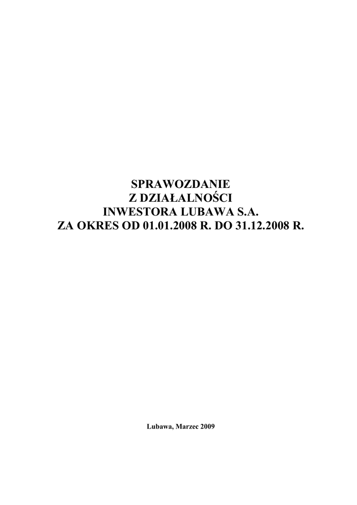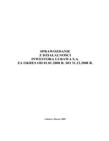 SPRAWOZDANIE Z DZIAŁALNOŚCI INWESTORA LUBAWA S.A. ZA OKRES OD 01.01.2008 R. DO 31.12.2008 R. Lubawa, Marzec 2009 Sprawozdanie z działalności Inwestora Lubawa S.A. za okres od 01.01.2008 r. do 31.12.2008 r. SPIS TREŚCI 1. OPIS DZIAŁALNOŚCI GOSPODARCZEJ INWESTORA ........................................................ 4 1.1. STRUKTURA ORGANIZACYJNA INWESTORA I PODMIOTÓW STOWARZYSZONYCH ....................................................................................................................................... 4 1.2. DZIAŁALNOŚĆ INWESTORA .................................................................................. 4 2. SYTUACJA FINANSOWA INWESTORA ORAZ ISTOTNE ZDARZENIA DLA DZIAŁALNOŚCI ......................................................................................................................................... 5 2.1. WYNIKI EKONOMICZNO-FINANSOWE ................................................................ 5 2.2. PRZEWIDYWANA SYTUACJA FINANSOWA ....................................................... 6 2.3. ZDARZENIA ISTOTNE WPŁYWAJĄCE NA DZIAŁALNOŚĆ : ............................ 6 2.4. WAŻNIEJSZE OSIĄGNIĘCIA W DZIEDZINIE BADAŃ I ROZWOJU .................. 7 2.5. INFORMACJA DOTYCZĄCA NABYCIA AKCJI WŁASNYCH............................. 7 2.6. POSIADANE PRZEZ EMITENTA ODDZIAŁY ........................................................ 7 2.7. INSTRUMENTY FINANSOWE.................................................................................. 7 3. 3.1. 3.2. 3.3. ISTOTNE CZYNNIKI I PERSPEKTYWY ROZWOJU DZIAŁALNOŚCI INWESTORA ... 7 CZYNNIKI WPŁYWAJĄCE NA SYTUACJĘ INWESTORA ................................... 8 PRZEWIDYWANY ROZWÓJ INWESTORA ........................................................... 9 OPIS ISTOTNYCH CZYNNIKÓW RYZYKA ........................................................... 9 4. INFORMACJA O PRODUKTACH, TOWARACH, USŁUGACH I RYNKACH ZBYTU .... 10 4.1. INFORMACJA O PODSTAWOWYCH PRODUKTACH ....................................... 10 4.2. INFORMACJA O RYNKACH ZBYTU .................................................................... 10 5. INFORMACJE O ZNACZĄCYCH UMOWACH I POWIĄZANIACH EMITENTA ........... 11 5.1. INFORMACJE O UMOWACH ZNACZĄCYCH DLA DZIAŁALNOŚCI EMITENTA…….. 11 5.2. INFORMACJE O POWIĄZANIACH ORGANIZACYJNYCH LUB KAPITAŁOWYCH EMITENTA Z INNYMI PODMIOTAMI .................................................................. 12 5.3. OPIS TRANSAKCJI Z PODMIOTAMI POWIĄZANYMI ...................................... 12 6. INFORMACJE O KREDYTACH, POŻYCZKACH, PORĘCZENIACH, GWARANCJACH13 6.1. INFORMACJE O ZACIĄGNIĘTYCH KREDYTACH, POŻYCZKACH ................ 13 6.2. INFORMACJE O UDZIELONYCH POŻYCZKACH .............................................. 13 7. OPIS WYKORZYSTANIA PRZEZ EMITENTA WPŁYWÓW Z EMISJI ............................ 13 8. OBJAŚNIENIE RÓŻNIC POMIĘDZY WYNIKAMI FINANSOWYMI WYKAZANYMI W RAPORCIE ROCZNYM A WCZEŚNIEJ PUBLIKOWANYMI PROGNOZAMI WYNIKÓW NA DANY ROK ................................................................................................................................................ 13 9. ZARZĄDZANIE ZASOBAMI FINANSOWYMI ....................................................................... 13 10. OCENĘ MOŻLIWOŚCI REALIZACJI ZAMIERZEŃ INWESTYCYJNYCH...................... 14 11. OCENĘ CZYNNIKÓW I NIETYPOWYCH ZDARZEŃ MAJĄCYCH WPŁYW NA WYNIK Z DZIAŁALNOŚCI ZA ROK OBROTOWY ......................................................................................... 14 12. CHARAKTERYSTYKĘ ZEWNĘTRZNYCH I WEWNĘTRZNYCH CZYNNIKÓW ISTOTNYCH DLA ROZWOJU PRZEDSIĘBIORSTWA EMITENTA ............................................. 14 13. ZMIANY W PODSTAWOWYCH ZASADACH ZARZĄDZANIA PRZEDSIĘBIORSTWEM EMITENTA I JEGO GRUPĄ KAPITAŁOWĄ ..................................................................................... 14 -2- Sprawozdanie z działalności Inwestora Lubawa S.A. za okres od 01.01.2008 r. do 31.12.2008 r. 14. ZMIANY W SKŁADZIE OSÓB ZARZĄDZAJĄCYCH I NADZORUJĄCYCH EMITENTA W CIĄGU OSTATNIEGO ROKU OBROTOWEGO ........................................................................... 14 15. WSZELKIE UMOWY ZAWARTE MIĘDZY EMITENTEM A OSOBAMI ZARZĄDZAJĄCYMI................................................................................................................................ 15 16. INFORMACJA O WYNAGRODZENIACH WYPŁACONYCH OSOBOM ZARZĄDZAJĄCYM I NADZORUJĄCYM ........................................................................................... 15 17. OKREŚLENIE ŁĄCZNEJ LICZBY I WARTOŚCI NOMINALNEJ WSZYSTKICH AKCJI (UDZIAŁÓW) EMITENTA ORAZ AKCJI I UDZIAŁÓW W JEDNOSTKACH POWIĄZANYCH EMITENTA, BĘDĄCYCH W POSIADANIU OSÓB ZARZĄDZAJĄCYCH I NADZORUJĄCYCH (DLA KAŻDEJ OSOBY ODDZIELNIE) ................................................................................................ 16 18. WSKAZANIE AKCJONARIUSZY POSIADAJĄCYCH, BEZPOŚREDNIO LUB POŚREDNIO PRZEZ PODMIOTY ZALEŻNE, CO NAJMNIEJ 5 % W OGÓLNEJ LICZBIE GŁOSÓW NA WALNYM ZGROMADZENIU EMITENTA ............................................................... 16 19. INFORMACJE O ZNANYCH EMITENTOWI UMOWACH .................................................. 17 20. WSKAZANIE POSIADACZY WSZELKICH PAPIERÓW WARTOŚCIOWYCH, KTÓRE DAJĄ SPECJALNE UPRAWNIENIA KONTROLNE.......................................................................... 17 21. INFORMACJE O SYSTEMIE KONTROLI PROGRAMÓW PRACOWNICZYCH ............ 17 22. WSKAZANIE WSZELKICH OGRANICZEŃ DOTYCZĄCYCH PRZENOSZENIA PRAWA WŁASNOŚCI PAPIERÓW WARTOŚCIOWYCH EMITENTA ......................................................... 17 23. INFORMACJA O UMOWIE EMITENTA Z PODMIOTEM UPRAWNIONYM DO BADANIA SPRAWOZDAŃ FINANSOWYCH ...................................................................................... 17 24. POZOSTAŁE INFORMACJE DO SPRAWOZDANIA INWESTORA ................................... 18 24.1. CHARAKTERYSTYK