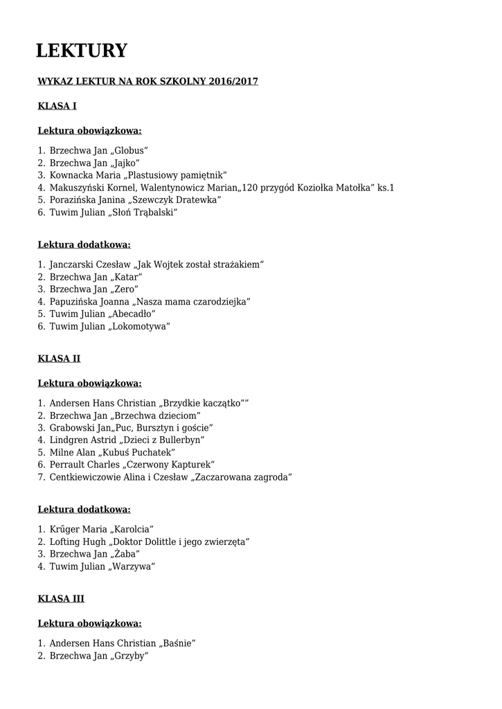 LEKTURY WYKAZ LEKTUR NA ROK SZKOLNY 2016/2017 KLASA I Lektura obowiązkowa: 1. 2. 3. 4. 5. 6. Brzechwa Jan „Globus” Brzechwa Jan „Jajko” Kownacka Maria „Plastusiowy pamiętnik” Makuszyński Kornel, Walentynowicz Marian„120 przygód Koziołka Matołka” ks.1 Porazińska Janina „Szewczyk Dratewka” Tuwim Julian „Słoń Trąbalski” Lektura dodatkowa: 1. 2. 3. 4. 5. 6. Janczarski Czesław „Jak Wojtek został strażakiem” Brzechwa Jan „Katar” Brzechwa Jan „Zero” Papuzińska Joanna „Nasza mama czarodziejka” Tuwim Julian „Abecadło” Tuwim Julian „Lokomotywa” KLASA II Lektura obowiązkowa: 1. 2. 3. 4. 5. 6. 7. Andersen Hans Christian „Brzydkie kaczątko”” Brzechwa Jan „Brzechwa dzieciom” Grabowski Jan„Puc, Bursztyn i goście” Lindgren Astrid „Dzieci z Bullerbyn” Milne Alan „Kubuś Puchatek” Perrault Charles „Czerwony Kapturek” Centkiewiczowie Alina i Czesław „Zaczarowana zagroda” Lektura dodatkowa: 1. 2. 3. 4. Krűger Maria „Karolcia” Lofting Hugh „Doktor Dolittle i jego zwierzęta” Brzechwa Jan „Żaba” Tuwim Julian „Warzywa” KLASA III Lektura obowiązkowa: 1. Andersen Hans Christian „Baśnie” 2. Brzechwa Jan „Grzyby” 3. 4. 5. 6. Lindgren Astrid „Dzieci z Bullerbyn” Pisarski Roman „O psie, który jeździł koleją” Jaworczakowa Mira „Oto jest Kasia” Wortman Stefania „U złotego źródła” Lektura dodatkowa: 1. 2. 3. 4. Krüger Maria „Dar rzeki Fly” Korczak Janusz „Król Maciuś Pierwszy” Papuzińska Joanna „Asiunia” Tuwim Julian „Ptasie radio” TERMINY OMAWIANIA LEKTUR W KLASACH IV - VI – ROK SZKOLNY 2016/2017 Tytuł X Akademia Pana Kleksa Pinokio XI XII IVC II IVB IVA IVB IVC Mikołajek IVA W pustyni puszczy iw Ania Zielonego Wzgórza z Chłopcy Placu Broni z III IVC Tajemniczy ogród IVA VC IV VA IVC VB VIB Księga dżungli VIC VIA Bajki robotów VIB VIC z Szatan z siódmej klasy IVB VB VC VIA V IVA IVB VA Ten obcy Opowieści Narnii I VB VA VC VIC VIB VC VIA VB VA VIC VIA VIB