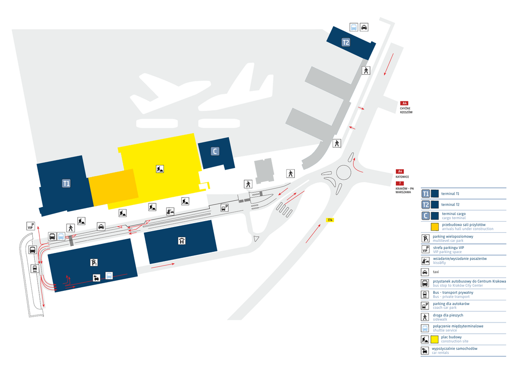 T2 A4 CHYŻNE RZESZÓW C A4 KATOWICE T1 7 KRAKÓW - PN WARSZAWA 774 T1 terminal T1 T2 terminal T2 C terminal cargo cargo terminal przebudowa sali przylotów arrivals hall under construction VIP 1 VIP 1 parking wielopoziomowy multilevel car park strefa parkingu VIP VIP parking space wsiadanie/wysiadanie pasażerów kiss&fly taxi przystanek autobusowy do Centrum Krakowa bus stop to Kraków City Center Bus - transport prywatny Bus - private transport parking dla autokarów coach car park droga dla pieszych sidewalk połączenie międzyterminalowe shuttle service plac budowy construction site wypożyczalnie samochodów car rentals