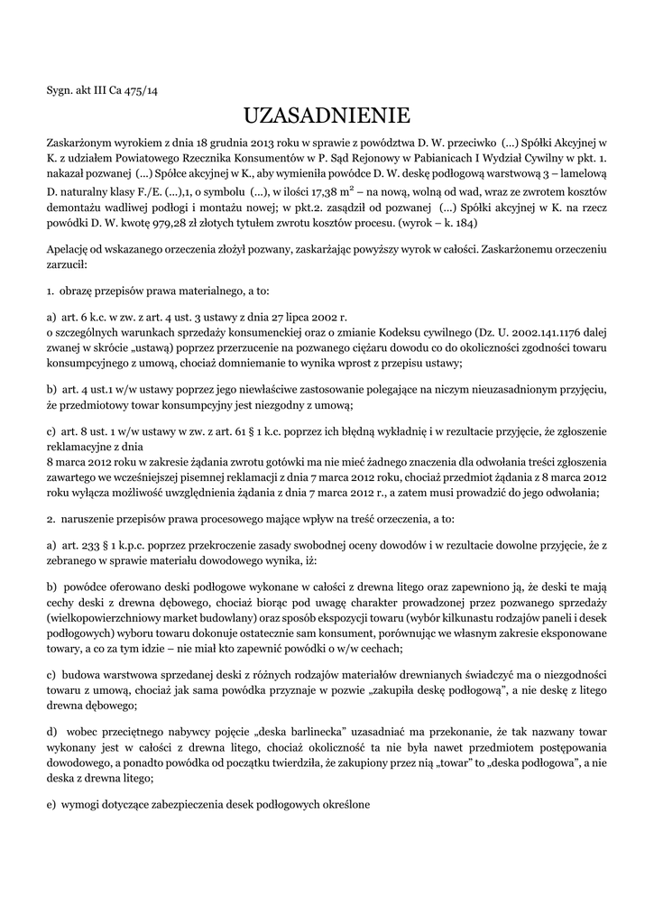 Sygn. akt III Ca 475/14 UZASADNIENIE Zaskarżonym wyrokiem z dnia 18 grudnia 2013 roku w sprawie z powództwa D. W. przeciwko (...) Spółki Akcyjnej w K. z udziałem Powiatowego Rzecznika Konsumentów w P. Sąd Rejonowy w Pabianicach I Wydział Cywilny w pkt. 1. nakazał pozwanej (...) Spółce akcyjnej w K., aby wymieniła powódce D. W. deskę podłogową warstwową 3 – lamelową D. naturalny klasy F./E. (...),1, o symbolu (...), w ilości 17,38 m2 – na nową, wolną od wad, wraz ze zwrotem kosztów demontażu wadliwej podłogi i montażu nowej; w pkt.2. zasądził od pozwanej (...) Spółki akcyjnej w K. na rzecz powódki D. W. kwotę 979,28 zł złotych tytułem zwrotu kosztów procesu. (wyrok – k. 184) Apelację od wskazanego orzeczenia złożył pozwany, zaskarżając powyższy wyrok w całości. Zaskarżonemu orzeczeniu zarzucił: 1. obrazę przepisów prawa materialnego, a to: a) art. 6 k.c. w zw. z art. 4 ust. 3 ustawy z dnia 27 lipca 2002 r. o szczególnych warunkach sprzedaży konsumenckiej oraz o zmianie Kodeksu cywilnego (Dz. U. 2002.141.1176 dalej zwanej w skrócie „ustawą) poprzez przerzucenie na pozwanego ciężaru dowodu co do okoliczności zgodności towaru konsumpcyjnego z umową, chociaż domniemanie to wynika wprost z przepisu ustawy; b) art. 4 ust.1 w/w ustawy poprzez jego niewłaściwe zastosowanie polegające na niczym nieuzasadnionym przyjęciu, że przedmiotowy towar konsumpcyjny jest niezgodny z umową; c) art. 8 ust. 1 w/w ustawy w zw. z art. 61 § 1 k.c. poprzez ich błędną wykładnię i w rezultacie przyjęcie, że zgłoszenie reklamacyjne z dnia 8 marca 2012 roku w zakresie żądania zwrotu gotówki ma nie mieć żadnego znaczenia dla odwołania treści zgłoszenia zawartego we wcześniejszej pisemnej reklamacji z dnia 7 marca 2012 roku, chociaż przedmiot żądania z 8 marca 2012 roku wyłącza możliwość uwzględnienia żądania z dnia 7 marca 2012 r., a zatem musi prowadzić do jego odwołania; 2. naruszenie przepisów prawa procesowego mające wpływ na treść orzeczenia, a to: a) art. 233 § 1 k.p.c. poprzez przekroczenie zasady swobodnej oceny dowodów i w rezultacie dowolne przyjęcie, że z zebranego w sprawie materiału dowodowego wynika, iż: b) powódce oferowano deski podłogowe wykonane w całości z drewna litego oraz zapewniono ją, że deski te mają cechy deski z drewna dębowego, chociaż biorąc pod uwagę charakter prowadzonej przez pozwanego sprzedaży (wielkopowierzchniowy market budowlany) oraz sposób ekspozycji towaru (wybór kilkunastu rodzajów paneli i desek podłogowych) wyboru towaru dokonuje ostatecznie sam konsument, porównując we własnym zakresie eksponowane towary, a co za tym idzie – nie miał kto zapewnić powódki o w/w cechach; c) budowa warstwowa sprzedanej deski z różnych rodzajów materiałów drewnianych świadczyć ma o niezgodności towaru z umową, chociaż jak sama powódka przyznaje w pozwie „zakupiła deskę podłogową”, a nie deskę z litego drewna dębowego; d) wobec przeciętnego nabywcy pojęcie „deska barlinecka” uzasadniać ma przekonanie, że tak nazwany towar wykonany jest w całości z drewna litego, chociaż okoliczność ta nie była nawet przedmiotem postępowania dowodowego, a ponadto powódka od początku twierdziła, że zakupiony przez nią „towar” to „deska podłogowa”, a nie deska z drewna litego; e) wymogi dotyczące zabezpieczenia desek podłogowych określone w instrukcji montażu zostały sporządzone małą czcionką i w sposób mało czytelny dla konsumenta, chociaż powódka sama przyznała, że montaż podłogi odbywał się w oparciu o w/w instrukcję, a więc jej treść byłą dla powódki zrozumiała, wszystkie jej zapisy mają taką samą czcionkę, a punkt „Konserwacja i pielęgnacja podłóg” jest dodatkowo pogrubiony i wyszczególniony oraz znajduje się w sąsiedztwie zdjęć obrazujących sposób montażu podłogi; f) konieczność stosowania zabezpieczeń podłogi przed uszkodzeniem przekraczać ma wiedzę typowego konsumenta, w tym powódki, chociaż powódka sama twierdziła, że pod meblami stosowała podkładki filcowe, a zatem zdawała sobie sprawę z możliwości powstania uszkodzeń i przewidywała skutki związane z możliwością porysowania podłogi; 3. art. 278 § 1 k.p.c. w zw. z art. 328 § 2 k.p.c. poprzez oparcie treści rozstrzygnięcia na opinii powołanego w sprawie biegłego sądowego, chociaż zakres sporządzonej przez biegłego opinii oraz zarzuty podnoszone wobec jej treści przez pozwanego wskazują, że opinia ta ma faktycznie nikłą wartość merytoryczną, nie ma żadnego oparcia w „wiadomościach specjalnych”, a wynikające z niej wnioski są niczym niepoparte, pozostają w sferze przypuszczeń i domysłów biegłego oraz jego subiektywnych przekonaniach, nie popartych żadną argumentacją faktyczną i prawną – ocena desek podłogowych miała wyłącznie charakter organoleptyczny, a ponadto biegły nie rozróżnienia podstawowych pojęć z zakresu parkieciarstwa, czyli w zakresie wiadomości specjalnych, które powinien posiadać; 4. art. 321 k.p.c. w zw. z art. 328 § 2 k.p.c. poprzez przyjęcie wbrew treści żądania pozwu oraz zgłoszenia o niezgodności towaru z umową, że niezgodność przedmiotowych desek z umową polegać ma na tym, że nie są one wytworem z litego drewna, chociaż zgłaszana przez powódkę niezgodność z umową wiązała się wyłącznie z występującymi wgnieceniami podłogi oraz niewyjaśnienie powyższej okoliczności w uzasadnieniu. W konkluzji powyższych zarzutów pozwany wniósł o: 1. zmianę zaskarżonego wyroku i oddalenie powództwa w całości, ewentualnie; 2. uchylenie zaskarżonego wyroku i przekazanie sprawy do ponownego rozpoznania Sądowi I instancji, 3. zasądzenie od powódki na rzecz pozwanego zwrotu kosztów procesu przed Sądem I i II instancji, w tym zwrotu kosztów zastępstwa procesowego w osobie radcy prawnego według norm przepisanych. W 
