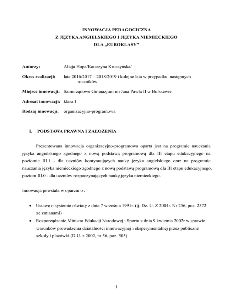 INNOWACJA PEDAGOGICZNA Z JĘZYKA ANGIELSKIEGO I JĘZYKA NIEMIECKIEGO DLA „EUROKLASY” Autorzy: Alicja Hopa/Katarzyna Kruszyńska/ Okres realizacji: lata 2016/2017 – 2018/2019 i kolejne lata w przypadku następnych roczników Miejsce innowacji: Samorządowe Gimnazjum im Jana Pawła II w Bolszewie Adresat innowacji: klasa I Rodzaj innowacji: I. organizacyjno-programowa PODSTAWA PRAWNA I ZAŁOŻENIA Prezentowana innowacja organizacyjno-programowa oparta jest na programie nauczania języka angielskiego zgodnego z nową podstawą programową dla III etapu edukacyjnego na poziomie III.1 - dla uczniów kontynuujących naukę języka angielskiego oraz na programie nauczania języka niemieckiego zgodnego z nową podstawą programową dla III etapu edukacyjnego, poziom III.0 - dla uczniów rozpoczynających naukę języka niemieckiego. Innowacja powstała w oparciu o : Ustawę o systemie oświaty z dnia 7 września 1991r. (tj. Dz. U. Z 2004r. Nr 256, poz. 2572 ze zmianami) Rozporządzenie Ministra Edukacji Narodowej i Sportu z dnia 9 kwietnia 2002r w sprawie warunków prowadzenia działalności innowacyjnej i eksperymentalnej przez publiczne szkoły i placówki.(D.U. z 2002, nr 56, poz. 505) 1 II. ZAKRES INNOWACJI Innowacja pedagogiczna z zakresu języka angielskiego i niemieckiego skierowana jest do uczniów Samorządowego Gimnazjum w Bolszewie, których rodzice (opiekunowie prawni) wyrażają zgodę na uczestnictwo w niej. Innowacja w szczególności adresowana jest do uczniów o wysokich kompetencjach językowych na wejściu do gimnazjum. Trzyletni cykl pracy z takim uczniem ma go przygotować do dalszej nauki w liceach, w klasach profilowanych językowo, a przede wszystkim da uczniom możliwość komunikatywnego opanowania dwóch języków obcych. Innowacja ma być wprowadzona w klasie z rozszerzą siatką godzin z języka angielskiego na poziomie III.1 w wymiarze 5 godzin tygodniowo oraz z języka niemieckiego w wymiarze 3 godzin tygodniowo na poziomie III.0. Uczniowie rozpoczynają naukę od podstaw, we wszystkich standardach wymaganych na egzaminie gimnazjalnym na poziomie rozszerzonym: gramatyka, użycie języka, czytanie ze zrozumieniem, słuchanie i pisanie. Dodatkowe godziny zostaną przeznaczone na rozszerzenie świadomości europejskiej uczniów, dadzą możliwość wykazania się swoją pomysłowością, zdolnością i kreatywnością w posługiwaniu się językami angielskim i niemieckim w żywym kontakcie z rówieśnikami z zagranicy. Poza tym będą miały możliwość wzbogacenia zakresu słownictwa i ćwiczenia umiejętności konwersacji osadzonych w aspektach kulturowych życia codziennego. Zajęcia konwersacyjne będą prowadzone wyłącznie w języku angielskim i w języku niemieckim. W klasie z wprowadzoną innowacją uczniowie na zajęciach z języka niemieckiego będą pracowali w oparciu o podręcznik „Mit links!”, gdzie materiał rozłożony będzie na 90 jednostek lekcyjnych w roku. Ponadto na zajęciach wykorzystywane będą materiały dodatkowe - teksty i ćwiczenia z podręczników „Goethe Institut”, korespondencja z uczniami ze szkoły w Niemczech, materiał multimedialny i filmowy. W ramach zajęć z języka angielskiego uczniowie będą pracowali w oparciu o podręcznik „Life Beat”. Ponadto na zajęciach wykorzystywane będą również materiały dodatkowe – praca na e- panelu , korespondencja z uczniami z zagranicy. Aspekt komunikacyjny innowacji będzie osadzony w ramach organizowanych w szkole projektów językowych: wymiany międzynarodowej oraz wyjazdu edukacyjno-krajoznawczego do Londynu dla uczniów klas trzecich, wyjazdu edukacyjno-krajoznawczego do Berlina dla uczniów klas drugich . Uczniowie klasy profilowanej będą szczególnie zachęcani do nawiązywania kontaktów z rówieśnikami z innych krajów europejskich w ramach projektów e-Twinning. Będą uczestniczyli w wszelkiego rodzaju konkursach np. kuratoryjnych czy też organizowanych przez różne instytucje promujące naukę języka angielskiego oraz języka niemieckiego jak np. Centrum Herdera w Gdańsku. 2 III. PRZYCZYNY I MOTYWACJA WPROWADZENIA INNOWACJI ORAZ OCZEKIWANIA Z NIĄ ZWIĄZANE Wprowadzenie w naszej szkole innowacji pedagogicznej z języka angielskiego i niemieckiego podyktowane jest chęcią stworzenia uczniom naszej szkoły jak najlepszych warunków i możliwości nauki języków obcych na wysokim poziomie. Potrzeba nauki języków obcych w dzisiejszych czasach jest istotnym elementem rozwoju intelektualnego uczniów na etapach edukacji. Dominującym językiem we wszystkich dziedzinach życia jest język angielski, jednak rozwijający się w szybkim tempie świat wymaga od współczesnego młodego człowieka opanowanie co najmniej jeszcze jednego języka obcego. Jak pokazują doświadczenia ostatnich lat w nauczaniu języka i wprowadzaniu w naszej szkole różnych projektów językowych uczniowie nasi zgłaszają zapotrzebowanie i chęci do nauki języka w szerszym wymiarze ze szczególnym naciskiem na możliwość bezpośredniej komunikacji w języku angielskim np. z rówieśnikami z innych krajów europejskich. Globalizacja i otwarcie na świat jakie wszystkim nam umożliwiają Internet, wszystkie istniejące w nim platformy społecznościowe oraz inne środki masowego przekazu narzucają nam w obecnym świecie potrzebę płynnego posługiwania się językiem uniwersalnym i powszechnie rozumianym a tym ciągle pozostaje język angielski. Coraz więcej naszych uczniów otwiera się na możliwości kontynuowania nauki na kolejnych etapach edukacyjnych w językach angielskimi niemieckim. Wykorzystanie naszej innowacji do usprawnienia aspektu komunikacyjnego znacznie zwiększy ich szanse na realizację tych ambitnych planów na przyszłość. Poza tym widzimy chęć i zapotrzebowanie wśród uczniów na sprawne i swobodne posługiwanie się językami w obecnej pop kulturze. Widzimy również potrzebę osadzenia naszych działań innowacyjnych w kontekście kulturowy