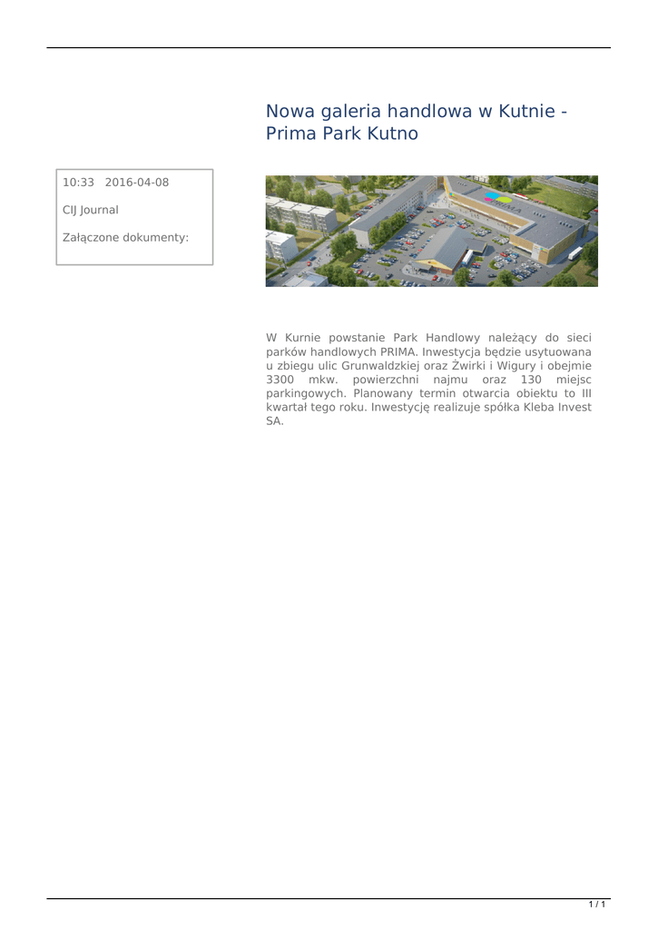Nowa galeria handlowa w Kutnie Prima Park Kutno 10:33 2016-04-08 CIJ Journal Załączone dokumenty: W Kurnie powstanie Park Handlowy należący do sieci parków handlowych PRIMA. Inwestycja będzie usytuowana u zbiegu ulic Grunwaldzkiej oraz Żwirki i Wigury i obejmie 3300 mkw. powierzchni najmu oraz 130 miejsc parkingowych. Planowany termin otwarcia obiektu to III kwartał tego roku. Inwestycję realizuje spółka Kleba Invest SA. 1/1