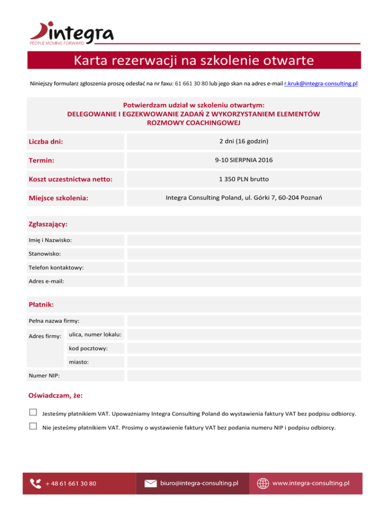 Karta rezerwacji na szkolenie otwarte Niniejszy formularz zgłoszenia proszę odesłać na nr faxu: 61 661 30 80 lub jego skan na adres e-mail [email protected] Potwierdzam udział w szkoleniu otwartym: DELEGOWANIE I EGZEKWOWANIE ZADAŃ Z WYKORZYSTANIEM ELEMENTÓW ROZMOWY COACHINGOWEJ 2 dni (16 godzin) Liczba dni: 9-10 SIERPNIA 2016 Termin: Koszt uczestnictwa netto: Miejsce szkolenia: 1 350 PLN brutto Integra Consulting Poland, ul. Górki 7, 60-204 Poznań Zgłaszający: Imię i Nazwisko: Stanowisko: Telefon kontaktowy: Adres e-mail: Płatnik: Pełna nazwa firmy: Adres firmy: ulica, numer lokalu: kod pocztowy: miasto: Numer NIP: Oświadczam, że: Jesteśmy płatnikiem VAT. Upoważniamy Integra Consulting Poland do wystawienia faktury VAT bez podpisu odbiorcy. Nie jesteśmy płatnikiem VAT. Prosimy o wystawienie faktury VAT bez podania numeru NIP i podpisu odbiorcy. Uczestnicy: Lp. Imię i Nazwisko Stanowisko Adres e-mail Nr telefonu Termin szkolenia Warunki uczestnictwa: 1. Organizatorem szkolenia jest INTEGRA CONSULTING POLAND Sp. z o.o. sp.k. z siedzibą w Poznaniu przy ul. Górki 7, wpisaną do Rejestru Przedsiębiorców prowadzonego przez Sąd Rejonowy Poznań - Nowe Miasto i Wilda w Poznaniu, VIII Wydział Gospodarczy Krajowego Rejestru Sądowego, pod numerem KRS 0000443804, NIP 779-241-03-02, REGON: 302302842, zwaną dalej Organizatorem. 2. Cena szkolenia obejmuje: udział w szkoleniu, zestaw materiałów szkoleniowych, certyfikat ukończenia szkolenia, serwis kawowy. Cena nie obejmuje noclegu. 3. Warunkiem udziału w szkoleniu jest otrzymanie przez organizatora wypełnionej karty rezerwacji znajdującej się na stronie www.integra-consulting.pl, wysłanej pocztą elektroniczną lub faksem najpóźniej na 6 dni przed rozpoczęciem szkolenia. Po upływie tego terminu zgłoszenie chęci udziału w szkoleniu jest dopuszczalne wyłącznie po uprzednim telefonicznym uzgodnieniu z organizatorem. Przesłanie do organizatora wypełnionej karty rezerwacji jest równoznaczne z akceptacją niniejszych warunków uczestnictwa oraz z zawarciem umowy pomiędzy organizatorem a uczestnikiem szkolenia (w przypadku zgłoszeń od osób fizycznych) lub firmą (w przypadku osób prawnych) i dokonanie wpłaty zgodnie z pkt. 7. 4. Z zastrzeżeniem punktu 5, organizator za pośrednictwem poczty elektronicznej prześle do osób, które zgłosiły chęć udziału w szkoleniu potwierdzenie udziału w szkoleniu wraz z dodatkowymi informacjami organizacyjnymi dotyczącymi szkolenia. 5. O przyjęciu na szkolenie decyduje kolejność zgłoszeń. Organizator zastrzega sobie prawo do odmowy przyjęcia zgłoszenia, jeżeli lista uczestników w danym terminie szkolenia będzie już zamknięta oraz w przypadku nie zgłoszenia się minimalnej liczby osób. 6. Organizator zastrzega sobie prawo do odwołania szkolenia lub zmiany jego terminu na 5 dni przed terminem szkolenia. 7. Płatność za szkolenie powinna wpłynąć na konto organizatora o nr. 06 1020 4027 0000 1702 1107 4954 najpóźniej w ciągu 3 dni od daty otrzymania od organizatora potwierdzenia udziału w szkoleniu, o którym mowa w punkcie 4. 8. W przypadkach określonych w punkcie 5 i 6, wszelkie kwoty wpłacone tytułem zapłaty za udział w szkoleniu zostaną zwrócone w całości w ciągu 14 dni od daty przekazania stosownej informacji do uczestnika szkolenia, za wyjątkiem sytuacji, kiedy strony uzgodnią, że wpłacona kwota zostanie zaliczona na poczet zapłaty za udział uczestnika w szkoleniu w innym terminie. 9. Rezygnacja z udziału w szkoleniu na 5 lub więcej dni przed planowanym terminem rozpoczęcia szkolenia nie pociąga za sobą żadnych obciążeń finansowych, pod warunkiem przesłania pisemnej informacji o rezygnacji z udziału w szkoleniu w formie listu, faksu lub poczty elektronicznej na adres organizatora. Decydująca jest data wpływu oświadczenia o rezygnacji do organizatora. 10. W takim przypadku uczestnikowi przysługuje zwrot wcześniej uiszczonej płatności w całości. 11. Z zastrzeżeniem punktu 10, w przypadku zgłoszenia rezygnacji na mniej niż 5 dni przed planowanym terminem rozpoczęcia szkolenia, organizator zastrzega sobie prawo do wystawienia noty obciążeniowej w wysokości 50% ceny szkolenia tytułem kary umownej oraz potrącenia kwoty powstałej w ten sposób należności od kwoty wcześniej uiszczonej tytułem zapłaty za szkolenie. *W przypadku, gdy zapłata nie została wcześniej uiszczona, kary umowne są płatne w terminie 14 dni od daty wystawienia noty obciążeniowej. 12. W przypadku zgłoszenia rezygnacji z udziału w szkoleniu na mniej niż 3 dni roboczych przed planowanym terminem rozpoczęcia szkolenia, organizator zachowuje prawo do pełnego wynagrodzenia, tak jak za należycie wykonane szkolenie. Wcześniej wpłacone kwoty nie podlegają w tej sytuacji zwrotowi. *W przypadku, gdy zapłata nie została wcześniej uiszczona, kary umowne są płatne w terminie 14 dni od daty wystawienia noty obciążeniowej. 13. Oświadczenie o chęci udziału w szkoleniu w terminie innym niż potwierdzony przez organizatora zgodnie z punktem 4, jest równoznaczne z rezygnacją z wybranego szkolenia i znajduje tu zastosowanie zasady z pkt. 9-12. 14. Organizator zastrzega sobie prawo do odmówienia udziału w szkoleniu otwartym w przypadku, gdy firma zgłaszająca i/lub uczestnicy zgłoszeni przez firmę i/lub osoby prywatne prowadzą działalność konkurencyjną wobec organizatora, a także z innych powodów bez podania przyczyny. 15. Organizator będzie rozpatrywać wyłącznie reklamacje dotyczące szkoleń otrzymane w formie pisemnej w terminie do 14 dni od daty zakończenia szkolenia. Reklamacje otrzymane po tym terminie nie będą rozpatrywane. Skąd dowiedzieli się Państwo o szkoleniach otwartych organizowanych przez Integra Consulting Poland: X Wyszukiwarka internetowa Portal o szkoleniach (jaki?)……………………………. E-mail Szkolenie zamknięte Integra Consulting Poland Dział HR / przełożony