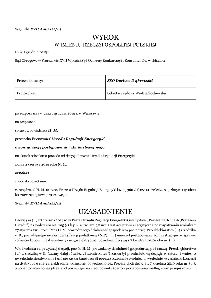 Sygn. akt XVII AmE 112/14 WYROK W IMIENIU RZECZYPOSPOLITEJ POLSKIEJ Dnia 7 grudnia 2015 r. Sąd Okręgowy w Warszawie XVII Wydział Sąd Ochrony Konkurencji i Konsumentów w składzie: Przewodniczący: SSO Dariusz D ąbrowski Protokolant: Sekretarz sądowy Wioleta Żochowska po rozpoznaniu w dniu 7 grudnia 2015 r. w Warszawie na rozprawie sprawy z powództwa H. M. przeciwko Prezesowi Urzędu Regulacji Energetyki o kontynuację postępowania administracyjnego na skutek odwołania powoda od decyzji Prezesa Urzędu Regulacji Energetyki z dnia 2 czerwca 2014 roku Nr (...) orzeka: 1. oddala odwołanie 2. zasądza od H. M. na rzecz Prezesa Urzędu Regulacji Energetyki kwotę 360 zł (trzysta sześćdziesiąt złotych) tytułem kosztów zastępstwa procesowego. Sygn. akt XVII AmE 112/14 UZASADNIENIE Decyzją nr (...) z 2 czerwca 2014 roku Prezes Urzędu Regulacji Energetyki (zwany dalej „Prezesem URE” lub „Prezesem Urzędu”) na podstawie art. 105 § 1 k.p.a. w zw. art. 30 ust. 1 ustawy prawo energetyczne po rozpatrzeniu wniosku z 27 stycznia 2014 roku Pana H. M. prowadzącego działalność gospodarczą pod nazwą Przedsiębiorstwo (...) z siedzibą w B., posiadającego numer identyfikacji podatkowej (NIP): (...) umorzył postępowanie administracyjne w sprawie cofnięcia koncesji na dystrybucję energii elektrycznej udzielonej decyzją z 7 kwietnia 2010r oku nr (...). W odwołaniu od powyższej decyzji, powód H. M. prowadzący działalność gospodarczą pod nazwą Przedsiębiorstwo (...) z siedzibą w B. (zwany dalej również „Przedsiębiorcą”) zaskarżył przedmiotową decyzję w całości i wniósł o uwzględnienie odwołania i zmianę zaskarżanej decyzji poprzez orzeczenie o cofnięciu, względnie wygaśnięciu koncesji na dystrybucję energii elektrycznej udzielonej powodowi przez Prezesa URE decyzja z 7 kwietnia 2010 roku nr (...), a ponadto wniósł o zasądzenie od pozwanego na rzecz powoda kosztów postępowania według norm przypisanych. Powód podniósł w odwołaniu, iż sieć dystrybucji energii, która jest jego własnością nie jest już przez niego eksploatowana, gdyż na podstawie umowy z 2 stycznia 2014 roku spółka (...) S.A. jest jej posiadaczem zależnym i sprawuje na nią władztwo, stosownie do art. 336 k.c.. Nadto powód podkreślił, iż realizuje on dostawę energii elektrycznej jedynie na potrzeby własnej działalności gospodarczej oraz na rzecz najemców mających siedzibę w obiektach będących własności powoda i nie prowadzi działalności zarobkowej w zakresie dostawy energii oraz nie nalicza i nie naliczał żadnych kosztów za przesył. Ponadto powód wskazał, iż prawomocnym postanowieniem nr (...) z 24 lutego 2011 roku Zarząd Województwa (...) pozytywnie zaopiniował wniosek powoda o cofnięciu koncesji na dystrybucję energii elektrycznej. W odpowiedzi na odwołanie pozwany Prezes Urzędu Regulacji Energetyki wniósł o oddalenie odwołania podtrzymał swoje przedstawione w uzasadnieniu zaskarżonej decyzji stanowisko. Pozwany wskazał podstawy swojego stanowiska i odniósł się do przedstawionych przez powoda w odwołaniu twierdzeń. W dalszym toku procesu strony podtrzymały swoje stanowiska. Sąd ustalił, co następuje: H. M. prowadzi działalność gospodarczą pod nazwą Przedsiębiorstwo (...). Pierwotnie działalność tego przedsiębiorcy ujawniona w ewidencji działalności gospodarczej prowadzonej przez Burmistrza C. pod nr (...) obejmowała m.in. wytwarzanie i dystrybucję energii elektrycznej. Wnioskiem z 11 sierpnia 2011 roku H. M. złożył do Centralnej Ewidencji i Informacji o Działalności Gospodarczej Rzeczypospolitej Polskiej wniosek o wykreślenie z ww. ewidencji przedmiotu działalności gospodarczej polegającej na dystrybucji energii elektrycznej. Decyzją z 7 kwietnia 2010 roku nr (...) Prezes Urzędu Regulacji Energetyki udzielił H. M., prowadzącemu działalność gospodarczą pod nazwą Przedsiębiorstwo (...) z siedzibą w B., koncesję na wykonywanie działalności gospodarczej polegającej na dystrybucji energii elektrycznej na okres od 7 kwietnia 2010 roku do 7 kwietnia 2020 roku. Wcześniej przedsiębiorca ten uzyskał koncesję na obrót energią elektryczną. Decyzją z 17 maja 2012 roku, nr (...), Prezes Urzędu Regulacji Energetyki po rozpatrzeniu wniosku powoda z 20 lipca 2010 roku postanowił odmówić cofnięcia koncesji na dystrybucję energii elektrycznej udzielonej decyzją z 7 kwietnia 2010 roku, nr (...). Od tej decyzji powód wniósł odwołanie do Sądu Okręgowego w Warszawie – Sądu Ochrony Konkurencji i Konsumentów, które to wyrokiem z 9 grudnia 2013 roku sygn. akt. XVII AmE 88/12 zostało w całości oddalone. Umową z 2 stycznia 2014 roku powód przekazał na rzecz spółki (...) S.A. Oddział w B. do eksploatacji całą posiadaną sieć dystrybucji energii, tj.: -3-polowa rozdzielnia 6 kV: pole pomiarowe, dwa pola transformatorowe, -Transformator 6/04 – 630 kVA nr fab. (...) ((...)) -Transformator 6/04 – 630 kVA nr fab. (...) ((...)) - kabel 6 kV typu (...) 1 x 50 relacji rozdzielnia 6 kV pole nr 2 – (...), dł. 120 m, - kabel 6 kV typu (...) 1 x 50 relacji rozdzielnia 6 kV pole nr 3 – (...), dł. 280 m, Zgodnie z zapisami ww. umowy powód przekazał spółce (...) S.A. do odpłatnej eksploatacji wyżej wymienione urządzenia, z zastrzeżeniem, iż pozostają one w zarządzie i majątku powoda. H. M. prowadzi działalność gospodarczą na nieruchomościach zlokalizowanych przy ul. (...) w B., których jest wieczystym użytkownikiem. W ramach prowadzonej działalności przedsiębiorca ten na wskazanej nieruchomości wynajmuje innym przedsiębiorcom lokale wchodzące w skład wielolokalowych budynków usytuowanych na przedmiotowej nieruchomości. W dacie wydania zaskarżonej decyzji wynajmował pomieszczenia, w ramach czego powód dostarcza najemcom energię elektryczną do wynajmowanych lokali poprzez wykorzystanie posiadanej infrastruktury technicznej, której jes