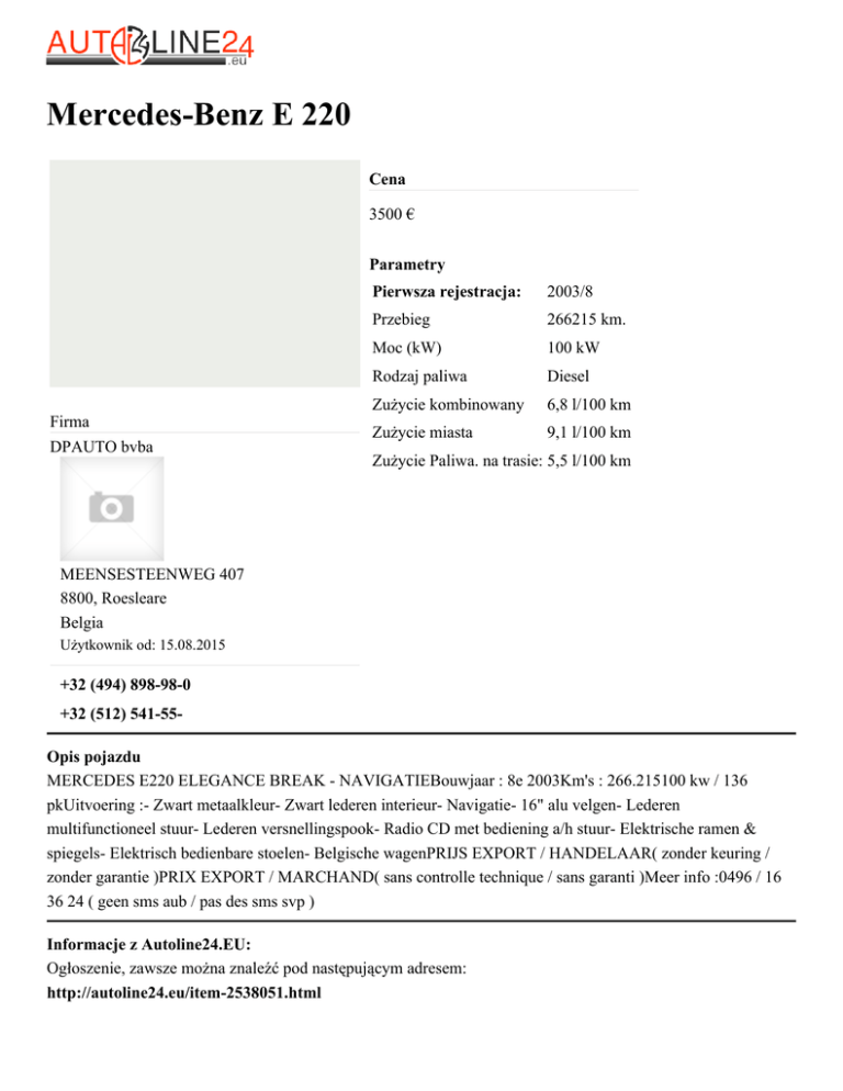 Mercedes-Benz E 220 Cena 3500 € Parametry Firma DPAUTO bvba Pierwsza rejestracja: 2003/8 Przebieg 266215 km. Moc (kW) 100 kW Rodzaj paliwa Diesel Zużycie kombinowany 6,8 l/100 km Zużycie miasta 9,1 l/100 km Zużycie Paliwa. na trasie: 5,5 l/100 km MEENSESTEENWEG 407 8800, Roesleare Belgia Użytkownik od: 15.08.2015 +32 (494) 898-98-0 +32 (512) 541-55Opis pojazdu MERCEDES E220 ELEGANCE BREAK - NAVIGATIEBouwjaar : 8e 2003Km's : 266.215100 kw / 136 pkUitvoering :- Zwart metaalkleur- Zwart lederen interieur- Navigatie- 16" alu velgen- Lederen multifunctioneel stuur- Lederen versnellingspook- Radio CD met bediening a/h stuur- Elektrische ramen & spiegels- Elektrisch bedienbare stoelen- Belgische wagenPRIJS EXPORT / HANDELAAR( zonder keuring / zonder garantie )PRIX EXPORT / MARCHAND( sans controlle technique / sans garanti )Meer info :0496 / 16 36 24 ( geen sms aub / pas des sms svp ) Informacje z Autoline24.EU: Ogłoszenie, zawsze można znaleźć pod następującym adresem: http://autoline24.eu/item-2538051.html