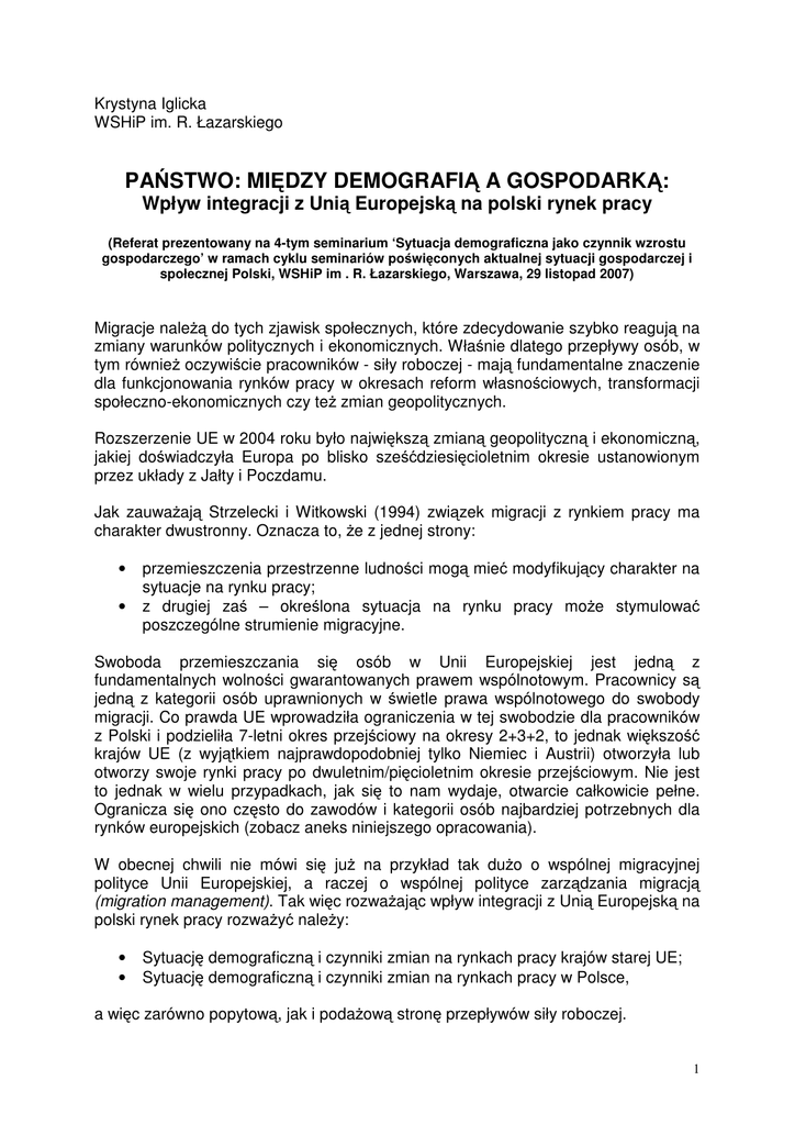 Krystyna Iglicka WSHiP im. R. Łazarskiego PAŃSTWO: MIĘDZY DEMOGRAFIĄ A GOSPODARKĄ: Wpływ integracji z Unią Europejską na polski rynek pracy (Referat prezentowany na 4-tym seminarium ‘Sytuacja demograficzna jako czynnik wzrostu gospodarczego’ w ramach cyklu seminariów poświęconych aktualnej sytuacji gospodarczej i społecznej Polski, WSHiP im . R. Łazarskiego, Warszawa, 29 listopad 2007) Migracje należą do tych zjawisk społecznych, które zdecydowanie szybko reagują na zmiany warunków politycznych i ekonomicznych. Właśnie dlatego przepływy osób, w tym również oczywiście pracowników - siły roboczej - mają fundamentalne znaczenie dla funkcjonowania rynków pracy w okresach reform własnościowych, transformacji społeczno-ekonomicznych czy też zmian geopolitycznych. Rozszerzenie UE w 2004 roku było największą zmianą geopolityczną i ekonomiczną, jakiej doświadczyła Europa po blisko sześćdziesięcioletnim okresie ustanowionym przez układy z Jałty i Poczdamu. Jak zauważają Strzelecki i Witkowski (1994) związek migracji z rynkiem pracy ma charakter dwustronny. Oznacza to, że z jednej strony: • • przemieszczenia przestrzenne ludności mogą mieć modyfikujący charakter na sytuacje na rynku pracy; z drugiej zaś – określona sytuacja na rynku pracy może stymulować poszczególne strumienie migracyjne. Swoboda przemieszczania się osób w Unii Europejskiej jest jedną z fundamentalnych wolności gwarantowanych prawem wspólnotowym. Pracownicy są jedną z kategorii osób uprawnionych w świetle prawa wspólnotowego do swobody migracji. Co prawda UE wprowadziła ograniczenia w tej swobodzie dla pracowników z Polski i podzieliła 7-letni okres przejściowy na okresy 2+3+2, to jednak większość krajów UE (z wyjątkiem najprawdopodobniej tylko Niemiec i Austrii) otworzyła lub otworzy swoje rynki pracy po dwuletnim/pięcioletnim okresie przejściowym. Nie jest to jednak w wielu przypadkach, jak się to nam wydaje, otwarcie całkowicie pełne. Ogranicza się ono często do zawodów i kategorii osób najbardziej potrzebnych dla rynków europejskich (zobacz aneks niniejszego opracowania). W obecnej chwili nie mówi się już na przykład tak dużo o wspólnej migracyjnej polityce Unii Europejskiej, a raczej o wspólnej polityce zarządzania migracją (migration management). Tak więc rozważając wpływ integracji z Unią Europejską na polski rynek pracy rozważyć należy: • • Sytuację demograficzną i czynniki zmian na rynkach pracy krajów starej UE; Sytuację demograficzną i czynniki zmian na rynkach pracy w Polsce, a więc zarówno popytową, jak i podażową stronę przepływów siły roboczej. 1 Sytuacja demograficzna i czynniki zmian na rynkach pracy krajów UE - 15 Według ostatnich prognoz demograficznych do roku 2040 liczba mieszkańców w krajach obecnej UE spadnie z 344 milionów (na początku lat 1990.) do 304 milionów. Dla UE oznaczałoby to więc drastyczny spadek liczebności populacji. Zakładając, że rozwój technologiczny nie przyczyni się w sposób zasadniczy do zmniejszenia zapotrzebowania na siłę roboczą oraz, że nie nastąpi radykalne zwiększenie liczby pracujących kobiet, liczba osób w wieku produkcyjnym, która w 1990 roku wynosiła 155 milionów, w roku 2040 może wynieść tylko 118 milionów (Wspólne wyzwania…2001, Migration Policy Institute, 2007). Jakie są więc możliwe rozwiązania/stosowane instrumenty polityczne w Unii Europejskiej? W ostatnich dyskusjach europejskich, które podsumowali Niessen i Schibel (2002: 8-14) oraz Muenz (2007) rozważane są następujące możliwości: • • • Polityka społeczna prowadząca do wzrostu aktywności zawodowej Polityka prorodzinna Polityka migracyjna Rozwiązanie te nie wykluczają się, jednak w zależności od tego w jakich konfiguracjach zostaną zastosowane przynosić mogą różne rezultaty. Polityka społeczna prowadząca do wzrostu aktywności zawodowej: tego rodzaju polityka musi wziąć pod uwagę różnorakie przyczyny, które prowadzą do niskich współczynników aktywności zawodowej i to nie tylko wśród najstarszych roczników ale również wśród najmłodszych jak również kobiet. • • • Na przykład niższe lub malejące współczynniki aktywności zawodowej obserwowane mogą być wśród młodych kohort z powodu wydłużonego czasu poświęconego na zdobycie odpowiedniego poziomu wykształcenia, bezrobocia lub odwlekania decyzji z wejściem na rynek pracy z powodu stagnacji ekonomicznej przy jednoczesnym poparciu takiej decyzji przez ‘generację rodziców’, która osiągnęła na tyle dobrą sytuację ekonomiczną, że jest w stanie zaakceptować i wspomóc odwlekanie przez dzieci momentu wejścia na rynek pracy (Niessen, Schibel, 2002: 9, Muenz, 2007). Próba przedłużania wieku emerytalnego może ograniczone być przez sam rodzaj pracy. Niektóre zawody wymagają sprawności fizycznej jak i umysłowej, która niestety obniża się wraz z wiekiem. Również obserwowana jest niechęć społeczna (brak akceptacji społecznej) wobec hasła ‘active aging’ (aktywne starzenie się), która to niechęć niekoniecznie związana jest z wszechobecnym kultem młodości, ale również z konkurencyjnością (Niessen, Schibel, 2002: 10, Muenz, 2007). Wzrost aktywności zawodowej kobiet był celem wielu już polityk próbujących rozwiązać problem nierówności płac ze względu na płeć, jak również segregację rynków pracy ze względu na płeć. W wielu krajach (zwłaszcza północnej Europy) obserwuje się już wyraźny wzrost aktywności zawodowej kobiet – jednakże jest to tylko wzrost czasowego zatrudnienia ‘part-time’. Wzrost zatrudnienia pełnego full-time jest znacznie mniejszy. Najnowsze badania wskazują dodatkowo, że wzrost zatrudnienia czasowego kobiet nie 2 jest kwestią świadomego wyboru, ale raczej odzwierciedla niedostatki w prawidłowym systemie opieki nad dziećmi (Niessen, Schibel, 2002: 10-1