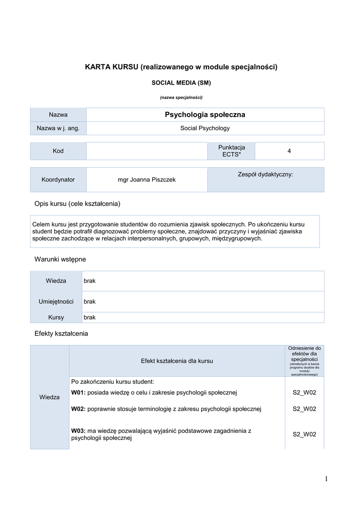 KARTA KURSU (realizowanego w module specjalności) SOCIAL MEDIA (SM) (nazwa specjalności) Nazwa Psychologia społeczna Nazwa w j. ang. Social Psychology Punktacja ECTS* Kod Koordynator mgr Joanna Piszczek 4 Zespół dydaktyczny: Opis kursu (cele kształcenia) Celem kursu jest przygotowanie studentów do rozumienia zjawisk społecznych. Po ukończeniu kursu student będzie potrafił diagnozować problemy społeczne, znajdować przyczyny i wyjaśniać zjawiska społeczne zachodzące w relacjach interpersonalnych, grupowych, międzygrupowych. Warunki wstępne Wiedza brak Umiejętności brak Kursy brak Efekty kształcenia Efekt kształcenia dla kursu Odniesienie do efektów dla specjalności (określonych w karcie programu studiów dla modułu specjalnościowego) Po zakończeniu kursu student: Wiedza W01: posiada wiedzę o celu i zakresie psychologii społecznej S2_W02 W02: poprawnie stosuje terminologię z zakresu psychologii społecznej S2_W02 W03: ma wiedzę pozwalającą wyjaśnić podstawowe zagadnienia z psychologii społecznej S2_W02 1 W04: posiada wiedzę o sposobach wpływania na ludzkie zachowania S2_W02 Odniesienie do efektów dla specjalności Efekt kształcenia dla kursu (określonych w karcie programu studiów dla modułu specjalnościowego) Po zakończeniu kursu student: U01: potrafi posługiwać się terminologią charakterystyczną dla zajwisk Umiejętności opisywanych przez psychologię społeczną U02: potrafi zaobserwować i opisać poznane zjawiska psychologii społecznej S2_U06 S2_U06 U03: potrafi interpretować zachowanie ludzi i grup S2_U06 U04: potrafi wykorzystać wiedzę do rozwiązywania problemów związanych z funkcjonowaniem człowieka w grupie S2_U06 Odniesienie do efektów dla specjalności Efekt kształcenia dla kursu (określonych w karcie programu studiów dla modułu specjalnościowego) Po zakończeniu kursu student: Kompetencje społeczne K01: potrafi zaprojektować eksperyment związany ze społecznym funkcjonowaniem ludzi S2_KO4 K02: potrafi samodzielnie stawiać hipotezy badawcze i je weryfikować S2_KO4 K03: samodzielnie podejmuje poszukiwania rozwiązań stawianych przed nim problemów praktycznych S2_KO4 K04: w ramach pracy zespołowej potrafi zastosować zdobytą wiedzę w praktyce S2_KO3 Studia stacjonarne Organizacja Forma zajęć Ćwiczenia w grupach Wykład (W) A Liczba godzin K L 15 S P E 30 Studia niestacjonarne Organizacja Forma zajęć Wykład Ćwiczenia w grupach 2 (W) A K L S P E Liczba godzin Opis metod prowadzenia zajęć Zajęcia będą prowadzone metodami aktywizującymi z użyciem prezentacji multimedialnych, filmów oraz formy warsztatowych – ćwiczeń indywidualnych i w grupach, testów, case study. W ramach pracy zaliczeniowej studenci w grupach będą mieli przeprowadzić i opisać eksperyment badający wybrane zagadnienie z psychologii społecznej (np. działanie technik wywierania wpływu, atrybucje) Inne Egzamin pisemny Egzamin ustny Praca pisemna (esej) Referat Udział w dyskusji Projekt grupowy X W01 W02 W03 W04 U01 U02 U03 U04 K01 K02 K03 K04 Kryteria oceny Projekt indywidualny Praca laboratoryjna Zajęcia terenowe Ćwiczenia w szkole Gry dydaktyczne E – learning Formy sprawdzania efektów kształcenia X X X X X X X X X X X X X X X X X X X X X X X X X X Ocenę dobrą i bardzo dobrą uzyskać może student, który: posiada nie więcej niż 2 nieobecności na ćwiczeniach, jest aktywny (zabiera głos w dyskusjach, przygotowuje się do ćwiczeń), przedstawi projekt zaliczeniowy na ćwiczeniach oraz uzyska 80% punktów z egzaminu pisemnego. Uwagi Treści merytoryczne (wykaz tematów) 3 WYKŁADY (po 2 godziny) 1. Wprowadzenie: a. czym zajmuje się psychologia społeczna – definicja i zakres b. dziedziny badań c. eksperymenty w psychologii społecznej d. etyka badacza e. Internet jako przedmiot i obszar badań psychologii społecznej 2. Spostrzeganie społeczne innych ludzi i ich zachowań a. kategoryzacja społeczna b. spostrzeganie własnej kontroli nad zdarzeniami – złudzenie kontroli, wyuczona bezradność c. heurystyki oceniania d. dysonans poznawczy – skutki fizjologiczne i motywacyjne, praktyczne zastosowania, redukcja 3. Naiwne wyjaśnienia ludzkiego zachowania: a. teoria atrybucji (natura procesu, błędy) b. zachowania racjonalne c. wpływ nastroju na procesy poznawcze (myślenie, pamięć, uwagę) 4. Postawy: a. co to jest postawa? postawy jawne, ukryte b. badanie i pomiar postaw c. relacje między postawami a zachowaniem - przewidywanie zachowań na podstawie postaw 5. Grupy: a. struktura i efektywność działania b. przywództwo c. zachowania w tłumie d. syndrom myślenia grupowego, efekt synergii, rozproszenie odpowiedzialności, efekt jednorodności grupy obcej 6. Stereotypy i uprzedzenia: a. stereotypy i uprzedzenia jako kategoria poznawcza b. geneza i funkcje stereotypów i uprzedzeń c. rola mediów w kształtowaniu stereotypów i uprzedzeń 7. Wpływ społeczny: a. wpływ grupy na jednostkę – konformizm, deindywidualizacja b. wpływ większości na mniejszość i mniejszości na większość c. posłuszeństwo wobec autorytetu 8. Portale społecznościowe a psychologia społeczna a. osobowość użytkowników portali społecznościowych b. jak psychologia społeczna wyjaśnia zachowaniaużytkowników serwisów społecznościowych? c. przykłady badań psychologicznych nad użytkownikami portali społecznościowych ĆWICZENIA LABORATORYJNE (po 2 godziny) 1. Stereotypy i uprzedzenia: a. rasizm, seksizm, homofobia b. konsekwencje posiadania stereotypów i uprzedzeń dla codziennego życia c. sposoby redukowania stereotypów i uprzedzeń 2. Postawy: a. kształtowanie postaw i możliwości ich zmiany poprzez Internet, portale społecznościowe 3. Atrakcyjność interpersonalna: a. teorie atrakcyjności interpersonalnej b. wyznaczniki atrakcyjności c. wpływ pochwał i przysług; pławienie się w cudzej chwale 4 d. e. podobieństwo poglądów a sympatia relacje interpersonalne w internecie 4. A